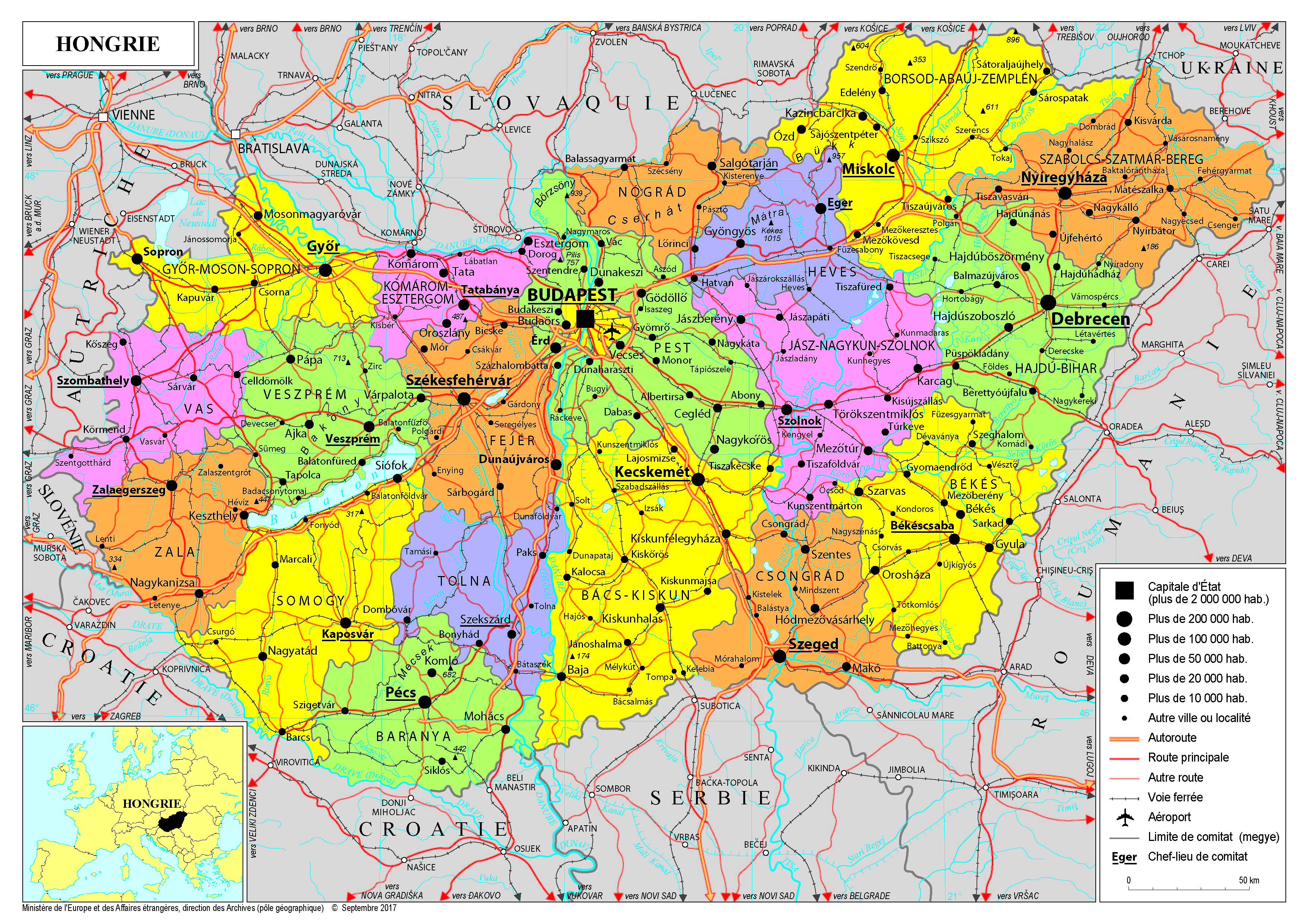 Hongrie Navigation latérale fiche pays Dans cette rubrique Hongrie Présentation de la Hongrie Conseils aux voyageurs Dernières minutes et alertes Sécurité Entrée / séjour Santé Informations utiles Voyages d'affaires Contacts utiles Politique et économie Relations bilatérales Présentation de la Hongrie Date de mise à jour le : 23 janvier 2026 Information toujours valable à la date du jour Présentation du pays Données générales Nom officiel : HongrieNature du régime : République parlementaire monocaméralePrésident de la République : M. Tamás Sulyok (entrée en fonction le 5 mars 2024)Premier ministre : M. Viktor Orbán (élu pour la 5ème fois : 1998 ; 2010 ; 2014 ; 2018 et 2022) Données géographiques Superficie : 93 012 km²Capitale : BudapestVilles principales : Debrecen, Miskolc, Szeged, Pécs, GyőrLangue officielle : hongroisMonnaie : forint hongrois (HUF)Fêtes nationales : 20 août (Saint Etienne) ; 15 mars (révolution de 1848) ; 23 octobre (soulèvement de 1956) Données démographiques Population (2024) : 9,65 millions d’habitantsDensité : 103 hab. / km² (2024)Croissance démographique (2024) : -0,2 % Espérance de vie (2022) : 72,7 ans (hommes) ; 79,5 ans (femmes)Religion : pas de religion officielle (catholiques romains : 30,1% ; protestants calvinistes : 9,8% ; protestants luthériens : 1,8% ; juifs : 1,4%)Indice de développement humain (2021) : 0,846 (46e)Indicateur conjoncturel de fécondité (2019) : 1,55Taux d’alphabétisation (2018) : 99,47 Politique intérieure Le gouvernement hongrois est dirigé par le Premier ministre Viktor Orbán depuis 2010, après un premier mandat entre 1998 et 2002. Il est à la tête d’une coalition associant son parti, le Fidesz, au parti populaire chrétien-démocrate (KDNP). Cette coalition a été reconduite pour la quatrième fois à la suite des élections législatives du 3 avril 2022 et a conservé sa majorité absolue des deux-tiers (plus de 50% des suffrages, 135 sièges sur 199). La coalition d’opposition, rassemblée autour d’un candidat unique à l’issue d’une primaire inédite, a obtenu 57 sièges, avec 34% des voix. Enfin, le parti d’extrême-droite Mi Hazánk est entré au Parlement avec 6 sièges. Les mandats de Viktor Orbán depuis 2010 ont été marqués par de nombreuses réformes, y compris de la constitution (Loi fondamentale), perçues comme remettant en cause l’Etat de droit, la séparation des pouvoirs, la société civile et les libertés individuelles, sur le plan idéologique. Ils ont également fait apparaître un durcissement du discours de Viktor Orbán sur les questions de société et sur l’immigration. Ses mandats ont également été marqués par un durcissement du contrôle sur les universités et les médias tout en poursuivant un discours de défense de la nation hongroise et de la famille. En parallèle, le gouvernement a également durci sa position sur les questions de genre et les personnes LGBTQI+ et sur la lutte contre les ingérences étrangères (loi relative à la protection de la souveraineté nationale le 12 décembre 2023). Après sa réélection en avril 2022, le Premier ministre Viktor Orbán a souhaité inscrire son action de politique intérieure dans la continuité des mandats précédents, en se concentrant particulièrement sur les questions économiques (lutte contre la hausse des prix de l’énergie, lutte contre l’inflation et relance de la croissance) dans un contexte dégradé post-Covid, tout en consolidant sa politique d’attraction des IDE, notamment vis-à-vis des pays asiatiques. Le déblocage des fonds européens, notamment les fonds de cohésion – dont une partie (10,2 Mds€) a été débloquée par la Commission européenne en décembre 2023 – ainsi que le PNRR, revêt à cet égard un caractère important pour le gouvernement. La guerre en Ukraine a néanmoins fortement marqué le mandat actuel de Viktor Orbán, et a été l’occasion pour le Premier ministre hongrois de marquer sa singularité au sein de l’Union européenne, avec des appels répétés en faveur d’un « cessez-le-feu » et à des pourparlers de paix, une critique des sanctions européennes contre la Russie (même s’il se n’est pas opposé à leur adoption), et le refus de fourniture d’armes et de transit d’armes vers l’Ukraine. Bien que la popularité du Premier ministre reste élevée, la démission de la Présidente de la République, Mme Katalin Novák, en février 2024, a provoqué un bouleversement sur la scène politique hongroise, ouvrant la voie à l’irruption soudaine de Péter Magyar, ancien époux de l’ex-ministre de la Justice Judit Varga. Souhaitant incarner une alternative politique au Fidesz, parti dont il est lui-même issu, Péter Magyar, figure encore inconnue du grand public il y a un an, a obtenu avec le parti Tisza (rallié au PPE) 29,7% des voix lors des élections européennes de juin 2024, se plaçant en deuxième position derrière le Fidesz (44%) et largement devant les partis de l’opposition « traditionnelle », en premier lieu la Coalition démocratique (DK), qui a obtenu 8% des suffrages. Aujourd’hui au coude-à-coude dans les sondages avec le Fidesz, Péter Magyar apparaît comme l’adversaire principal de Viktor Orbán pour les prochaines élections législatives, qui se tiendront au printemps 2026. Politique étrangère Union européenne La Hongrie est entrée dans l’Union européenne le 1er mai 2004, et dans l’espace Schengen en 2007. Après un premier exercice au 1er semestre 2011, la Hongrie a assuré la présidence du Conseil de l’Union européenne au second semestre 2024. Elle n’est pas membre de la zone euro. Présence dans les institutions européennes : le commissaire hongrois au sein de la Commission d’Ursula Von der Leyen est M. Olivér Várhelyi, actuellement en charge de la Santé et du bien-être animal. La Hongrie dispose de 1,92 % des voix au Conseil de l’Union europée