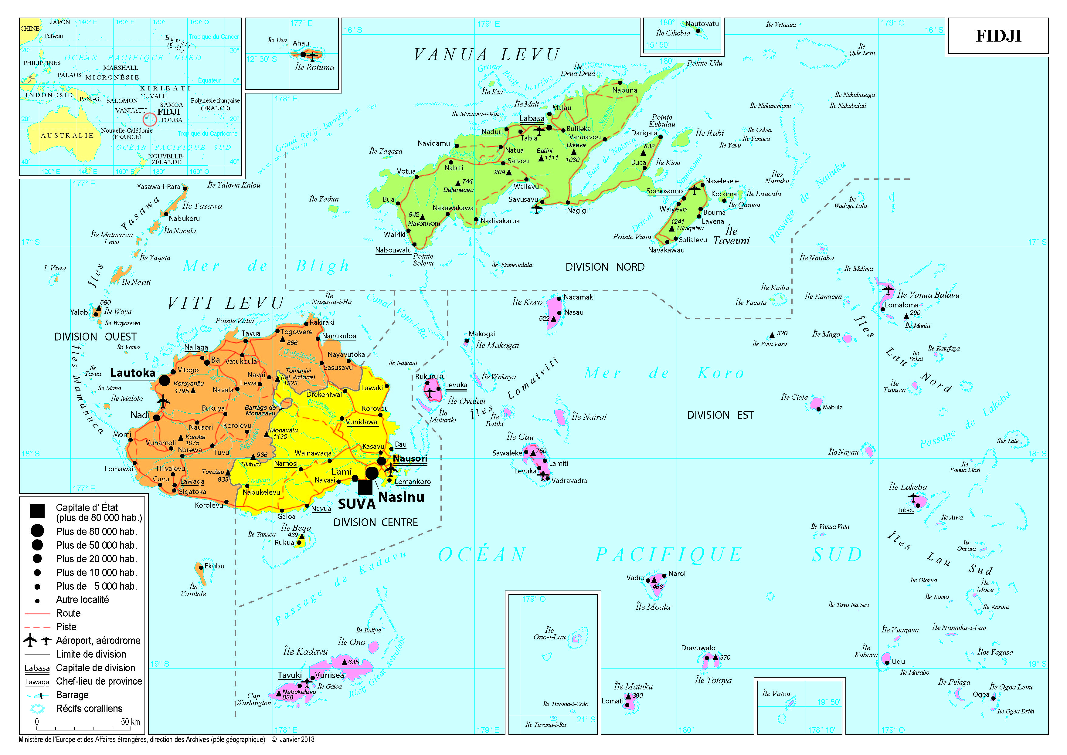 Iles Fidji Navigation latérale fiche pays Dans cette rubrique Iles Fidji Présentation des Iles Fidji Conseils aux voyageurs Dernières minutes et alertes Sécurité Entrée / séjour Santé Informations utiles Voyages d'affaires Contacts utiles Politique et économie Relations bilatérales Présentation des Iles Fidji Date de mise à jour le : 01 avril 2026 Information toujours valable à la date du jour Présentation du pays Données générales Nom officiel : République des FidjiNature du régime : République parlementaireChef de l’Etat : Naiqama LALABALAVU, PrésidentChef du gouvernement : Sitiveni RABUKA, Premier ministre (depuis 2022) Données géographiques Superficie : 18 333 km²ZEE : 1 282 978 km2Capitale : SuvaVilles principales : Suva, Lautoka, Nadi, Ba, LabasaLangues officielles : anglais, fidjien, hindiMonnaie : Dollar des Fidji Données démographiques Population : 906 784 habitants (Banque mondiale 2020)Densité : 49,07 hab/ km².Croissance démographique : 0,7 % (Banque mondiale 2020).Espérance de vie : 67 ans (Banque mondiale 2020)Religions : protestants (45%) ; hindous (27,9%) ; musulmans (6,3%)IDH : 0,741 (92ème rang mondial sur 189) Politique intérieure Des élections législatives ont eu lieu en décembre 2022 afin d’élire 55 membres du Parlement pour un mandat de quatre ans et ont entrainé une alternance démocratique. Sitiviteni RABUKA est devenu Premier ministre en l’emportant face à Frank BAINIMARAMA, Premier ministre sortant ayant occupé ce poste pendant 16 ans. Ancien militaire, dans l’opposition depuis 2014, Sitiveni RABUKA, leader du parti Alliance du peuple (PAP), a conclu un accord de coalition avec le Parti libéral social-démocrate et le Parti de la fédération nationale. Politique étrangère « Hub » du Pacifique, les Fidji accueillent de nombreuses structures régionales, notamment le Secrétariat du Forum des Îles du Pacifique (FIP), le Forum de développement des Îles du Pacifique (FIDP), 60% des effectifs de la Communauté du Pacifique (CPS) dont le siège est à Nouméa, la plupart des bureaux régionaux des Nations unies, et la délégation de l’Union européenne pour le Pacifique. Le Premier ministre RABUKA fait, début 2023, de l’unité du FIP l’une de ses priorités, se déplaçant aux Kiribati pour convaincre le pays de réintégrer le Forum. Il y rencontre le président Taneti MAAMAU, et le pays réintègre le FIP en février 2023. Les Fidji accueillent également le siège de l’Université du Pacifique sud (USP – University of the South Pacific) dont le conseil d’administration de l’UPS rassemble les chefs d’Etat et de gouvernement des 12 pays du Pacifique insulaire parties prenantes à l’université. Les Fidji ont accru leur présence au sein des enceintes multilatérales et notamment de l’Organisation des Nations unies (ONU). Leurs forces armées participent activement aux missions de maintien de la paix des Nations unies (500 soldats engagés dans 7 opérations de maintien de la paixou « OMP » en décembre 2021). Les Fidji ont présidé le Conseil des droits de l’Homme en 2021. Les Fidji sont très actifs dans les négociations climatiques. Ils ont été le premier pays à ratifier le Protocole de Kyoto dès 1998, ainsi que le premier à ratifier l’Accord de Paris dès février 2016. Suva a également été le premier despetits États insulaires en développement (PEID) à présider une conférence des Parties, la COP23, au cours de laquelle a été lancé le « dialogue de Talanoa » dialogue interactif devant conduire à la formation de consensus et à la prise de décision, reprenant un mot fidjien pour évoquer les échanges entre personnes en confiance. Situation économique L’économie de Fidji est l’une des plus développées et des mieux connectées de la région, malgré des difficultés liées à la crise du COVID-19. La fin de la pandémie et la réouverture du secteur du tourisme ont toutefois permis à l’économie de redémarrer fortement (+29,2 % en 2022) et le taux de chômage a retrouvé un niveau très stable (4,3%). 92,8% du PIB en 2022 : le FMI estime qu’en 2026, elle devrait toujours s’élever à 70,1%. Le pays est lourdement dépendant du tourisme, qui représente environ 17% du PIB. Au-delà de la valeur ajoutée directe du tourisme, un nombre important de biens et services connexes (nourriture, entretien, manufacture, etc.) sont dépendants des revenus touristiques. Le pays est également très vulnérable au changement climatique, et se classe au quinzième rang mondial pour le risque de catastrophe naturelle. En avril 2020, Fidji a été frappé par le Cyclone Harold. Plus de 13,6 M USD de dommages agricoles ont été signalés, ainsi que 33,5 M USD de dommages aux infrastructures, notamment aux routes, aux lignes électriques et aux jetées. Cette catastrophe naturelle a occasionné un effet d’accumulation et handicapé le secteur de l’agriculture. Le pays amorce une transition énergétique : l’Etat s’est engagé à passer complètement aux énergies renouvelables d’ici à 2036. Liste des représentations françaises Ambassade de France aux Iles Fidji 2nd Floor Pacific House Private Mail Bag Butt Street Suva Fidji Tel : +679 8929526 Ambassade de France aux Iles Fidji Réseaux sociaux Facebook X Instagram