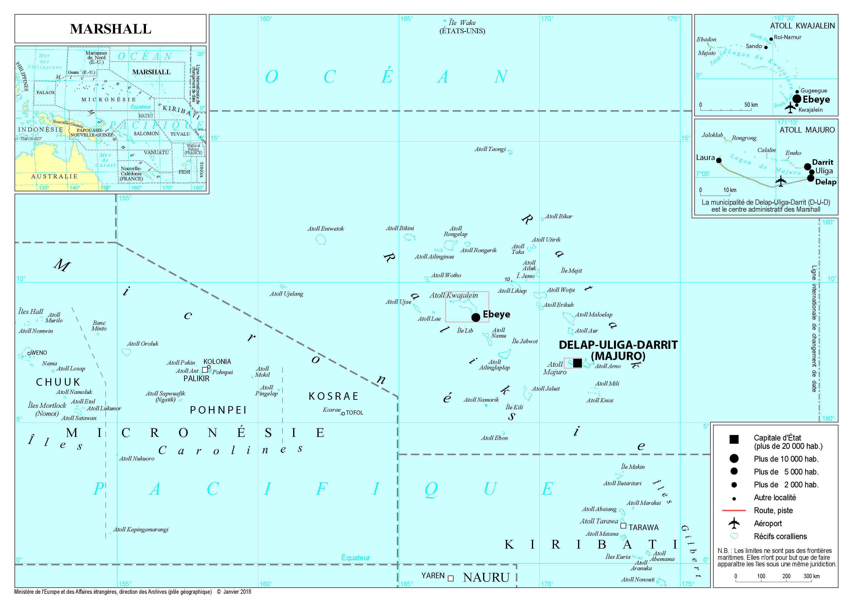 Iles Marshall Navigation latérale fiche pays Dans cette rubrique Iles Marshall Présentation des Iles Marshall Politique et économie Relations bilatérales Présentation des Iles Marshall Date de mise à jour le : 01 avril 2026 Information toujours valable à la date du jour Présentation du pays Données générales Nom officiel : République des Iles Marshall.Nature du régime : République parlementaire.Chef de l’Etat : Hilda HEINE (depuis janvier 2024), Présidente. Données géographiques Superficie : 181 km².ZEE : 1 990 530 km².Capitale : Majuro.Langues officielles : marshallais, anglais. Données démographiques Superficie : 181 km².ZEE : 1 990 530 km².Capitale : Majuro.Langues officielles : marshallais, anglais. Données démographiques Population : 37 548 habitants (Banque mondiale, 2024)Densité : 207 hab / km² (Banque mondiale, 2024)Croissance démographique : -3,4 % entre 2023 et 2024 (Banque mondiale)Espérance de vie : 67 ans (BM, 2023)Taux d’alphabétisation : N/AReligions : protestants (80,5% ) ; catholiques (8,5%).Indice de développement humain (2025) : 0,733 (108ème rang mondial). Politique intérieure Les Iles Marshall disposent d’un système politique mixte parlementaire-présidentiel. Le Président de la République cumule les fonctions de chef d’État et de gouvernement et est élu par les 33 membres du Parlement. Succédant à M. David KABUA, à la tête du pays de 2020 à 2024, Hilda HEINE effectue son deuxième mandat en tant que Présidente de la République des Îles Marshall depuis janvier 2024, suite aux élections générales de novembre 2023. Elle a déjà été élue à ce poste de 2016 à 2020, devenant alors la première femme des Îles Marshall mais aussi du Pacifique tout entier à occuper cette fonction. Les Iles Marshall disposent de ressources naturelles limitées et sont très vulnérables aux effets du réchauffement climatique (montée des eaux, raréfaction de l’eau douce, sécheresse, érosions côtières), en raison d’une altitude moyenne de deux mètres au-dessus du niveau de la mer. Politique étrangère Sous tutelle des États-Unis en vertu d’un mandat des Nations-Unies après la Seconde Guerre mondiale, les iles Marshall ont signé un accord-cadre de libre-association, "Compact of free association", avec Washington en 1986, avec une première période de financement jusqu’en 2003. En 2003, le Compact a été amendé et offre un financement jusqu’en 2023 (1,5 MDS USD). En 2024, les Palaos, la Micronésie et les Îles Marshall ont signé un nouvel accord pour une durée de 20 ans garantissant 7 Mds USD d’investissements sur cette période (dont 2,3 Mds pour les Marshall). Selon les termes de cet accord, les États-Unis bénéficient d’un accès exclusif et illimité aux terres et aux voies navigables des iles Marshall, ainsi que la pleine responsabilité de leur sécurité et de leur défense. En contrepartie, les iles Marshall reçoivent une aide américaine substantielle et leurs citoyens peuvent travailler, vivre et étudier aux États-Unis sans visa. Les iles Marshall hébergent le site d’essai de missiles Reagan de l’Atoll Kwajalein de l’armée américaine (USAKA), selon un accord qui prévoit que ces installations perdurent jusqu’en 2066, avec la possibilité d’une extension jusqu’en 2086. La question des essais nucléaires américains dans les atolls de Bikini et d’Enewetak (67 essais effectués entre 1946 et 1958) reste sensible. Le Marshall Islands Nuclear Claims Tribunal, établit par le « Compact » pour réglementer et verser les indemnités aux victimes de ces essais, a cessé de fonctionner depuis 2011 par manque de moyens, ce qui a mis un terme au versement des compensations financières. Le site de Runit, sur le même atoll, abrite un dôme de ciment renfermant les déchets nucléaires issus des 43 tests qu’il convient de protéger de la montée des eaux. Les iles Marshall reconnaissent Taïwan et ont réaffirmé leurs liens avec Taipei après la reconnaissance de Pékin par les îles Salomon et Kiribati en septembre 2019, puis par Nauru en janvier 2024. Taiwan apporte une aide financière substantielle ainsi qu’un soutien matériel et une assistance technique dans le secteur de l’agriculture. Les deux pays coopèrent également dans les secteurs des énergies propres, de la protection de l’environnement, de la santé et de la formation. Le Japon figure parmi les principaux partenaires de Majuro. On estime à 10% la part de la population d’origine japonaise, bien introduite dans le secteur public (trois anciens présidents de la République sont d’origine japonaise) et des affaires. Les Îles Marshall sont membres des principales organisations régionales : Communauté du Pacifique – Secrétariat (CPS), Programme régional Océanien de l’Environnement (PROE) et Forum des Iles du Pacifique (FIP). Elles sont également membres du G77 et de l’Alliance des Petits États insulaires (AOSIS). Situation économique PIB : 280,4 M USD (2024, Banque mondiale)PIB/hab : 7 470 USD (2024, Banque mondiale)Taux de chômage : 9,8% (2021, OIT)Solde commercial : -43M USD (2023, ONU)Classement Doing Business : 153e rang mondial (2020) Composition du PIB/secteur : Services (70,5%), Agriculture (19,5%), Industrie (10%) (2023)Croissance du PIB : 2,8% (2024, Banque mondiale)Principaux partenaires économiques : Chine, États-Unis, Japon, Corée du Sud, Allemagne L’économie des iles Marshall fait face à des défis structurels liés à la petite taille de sa population et au manque de diversité de ses ressources naturelles, ainsi qu’à son isolement géographique, qui engendre d’importants coûts de transports. L’aide internationale (288M$ reçus en 2022-2023) représente un montant équivalent à 53% du PIB du pays. Elle provient essentiellement des États-Unis (173,9M$ en 2022-2023) et de la Banque mondiale (36,3M$ en 2022-2023). Les aides au développement reçues par Majuro 