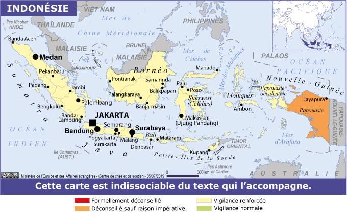 Indonésie Navigation latérale fiche pays Dans cette rubrique Indonésie Présentation de l'Indonésie Conseils aux voyageurs Dernières minutes et alertes Sécurité Entrée / séjour Santé Informations utiles Voyages d'affaires Contacts utiles Politique et économie Relations bilatérales Sécurité Date de mise à jour le : 27 mars 2026 Information toujours valable à la date du jour Imprimer Imprimer Vous voyagez à l'étranger ? Pour recevoir des alertes, inscrivez-vous sur Fil d'Ariane. S'inscrire sur Fil d'Ariane Donnez-nous votre avis Aidez-nous à améliorer notre service en répondant à notre enquête. Répondre à l'enquête utilisateurs Fermer Vérifiez que vous êtes bien assurés Avant de voyager, il est indispensable de vérifier que vous êtes bien assuré Quelle est la portée des Conseils aux Voyageurs ? Zones de vigilance Dernière actualisation le 09/03/2026, information toujours valable à la date du jour Zones déconseillées sauf raison impérative Piraterie maritime Il convient d’éviter sauf raison impératives les zones où des actes de piraterie sont susceptibles de se produire : eaux intérieures (mers de Banda, de Java et de Célèbes) et zones frontalières avec Singapour (détroit de Malacca), la Malaisie et les Philippines. Papouasie indonésienne Les manifestations des mouvements indépendantistes peuvent prendre une tournure violente, notamment dans les régions montagneuses du centre (Puncak Jaya, Jayawijaya, Paniai et Timika), où persistent des actes de violence sporadique. Le risque d’enlèvement de ressortissants ’étrangers est avéré. Les déplacements à caractère touristique sont en toute hypothèse à proscrire. Risques encourus et recommandations associées Risques naturels Le risque de séisme est élevé en Indonésie, l’archipel se situant au carrefour de plusieurs plaques tectoniques (indo-australienne, eurasienne et pacifique). Il est conseillé de consulter les recommandations sur la conduite à tenir en cas de tremblement de terre ou de tsunami de la fiche Séismes. De nombreux volcans sont actifs en Indonésie. Une vingtaine d’entre eux fait l’objet d’une surveillance spécifique. Ils sont répertoriés et classés (selon une échelle de vigilance allant de 1 à 4) sur le site du centre de volcanologie et des catastrophes géologiques (en anglais). Il convient de se renseigner avant d’envisager une randonnée aux abords de ces volcans et de respecter strictement les instructions des autorités locales. En cas de catastrophe naturelle (séisme, éruption volcanique, etc.) pendant son séjour en Indonésie, il est recommandé de prendre immédiatement contact avec ses proches pour les rassurer et, en cas de problème de communication avec l’extérieur, de contacter l’ambassade de France à Jakarta. Les risques d’inondations et de glissements de terrain sont fréquents en Indonésie durant la saison des pluies. La plus grande prudence doit être observée, notamment pour les déplacements en zones rurales. Risque terroriste Le pays a connu des actes terroristes, dont les attentats de Bali de 2002, ayant causé la mort de ressortissants étrangers. Depuis, du fait des efforts menés par les autorités indonésiennes, la fréquence des attaques a régulièrement baissé et les intérêts étrangers n’ont pas été significativement pris pour cible. Une certaine vigilance demeure cependant nécessaire Dans la région de Poso (centre de l’île des Célèbes), un attentat a été perpétré contre une famille de chrétiens en novembre 2020.Dans cette même région, de petits groupes terroristes opèrent en ciblant les services de police. Il subsiste une menace liée à des groupuscules présents dans la zone située entre Poso et Parigi Moutong.Un attentat suicide à l’explosif a eu lieu le 7 décembre 2022 dans un commissariat de police à Bandung (Java-ouest). La menace terroriste a dans l’ensemble baissé d’intensité au cours des dernières années. Il est cependant conseillé de faire preuve de vigilance, notamment dans les lieux très fréquentés (centres commerciaux, discothèques, bars, restaurants, etc.). Il convient de respecter scrupuleusement les consignes des autorités locales. Piraterie maritime La piraterie maritime prend indifféremment pour cibles des navires de commerce et de pêche ou des bateaux de plaisance. Les actes de piraterie se déroulent dans les eaux intérieures (mers de Banda, de Java et de Célèbes) et dans les zones frontalières avec Singapour (détroit de Malacca), la Malaisie et les Philippines. Pour en savoir plus, consulter la fiche Piraterie maritime. Délinquance Le niveau de sécurité est globalement satisfaisant en Indonésie. On assiste cependant à une recrudescence de la petite délinquance (vols à l’arrachée) dans les lieux touristiques (Bali, Lombok, Jakarta, etc.), avec une forte augmentation du nombre de délits à l’approche des fêtes importantes (jour de l’an, Idul Fitri). Plusieurs cas de perte de conscience ont été rapportés après ingestion de boissons offertes par des inconnus. Une fois droguées, les personnes se font déposséder de leurs biens et se réveillent sans souvenir de leurs agresseurs. Des cas d’escroquerie aux cartes bancaires ont été signalés. Il convient de faire preuve d’une grande prudence lorsqu’on utilise ce moyen de paiement (ne pas quitter sa carte des yeux). Risque routier Les routes indonésiennes ne sont pas sûres (mauvais état de la voirie ainsi que de nombreux véhicules ; présence fréquente de piétons et d’animaux ; comportement parfois erratique des conducteurs ; intempéries, précipitations très violentes pendant la saison des pluies ; conduite à gauche). Les accidents de la circulation sont fréquents, en ville et en zone rurale. Ils impliquent souvent des motocyclettes qui constituent un mode de transport à très fort risque. La conduite de nuit, a fortiori à motocyclette, est déconse
