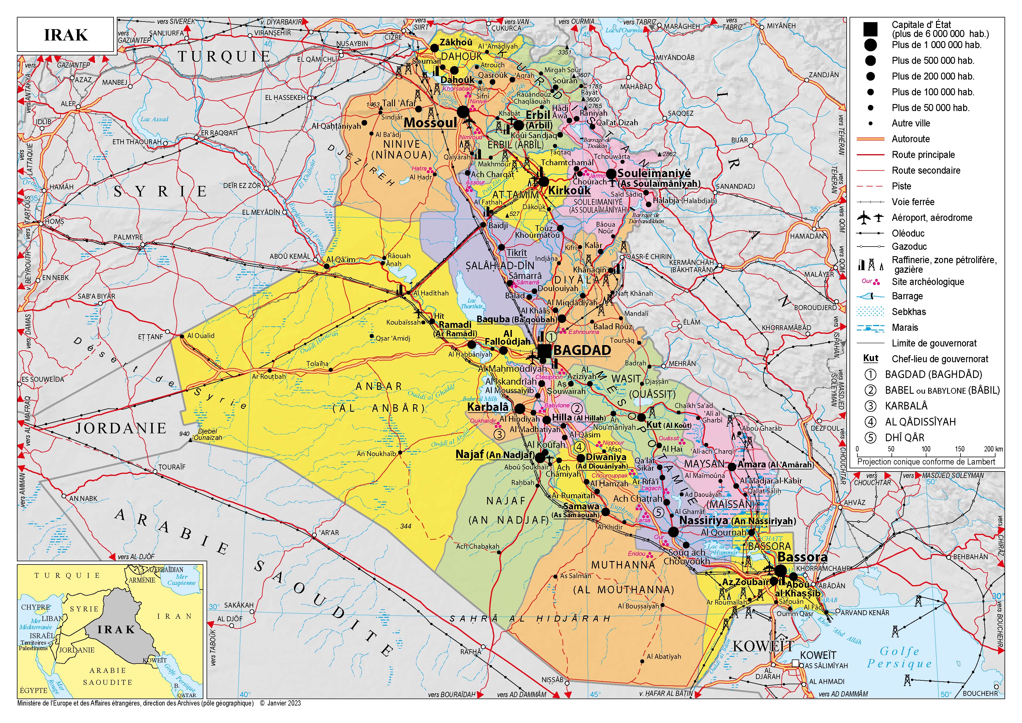 Irak Navigation latérale fiche pays Dans cette rubrique Irak Présentation de l'Irak Conseils aux voyageurs Dernières minutes et alertes Sécurité Entrée / séjour Santé Voyages d'affaires Contacts utiles Politique et économie Relations bilatérales Présentation de l'Irak Date de mise à jour le : 01 avril 2026 Information toujours valable à la date du jour Présentation du pays Données générales Nom officiel : République d’IrakNature du régime : République fédéraleChef de l’État : Abdul Latif Rachid (président de la République)Chef du gouvernement : Mohammed Chia Al-Soudani (Premier ministre) Données géographiques Superficie : 438 517 km²Capitale : BagdadVilles principales : Bagdad, Bassorah, Mossoul, ErbilLangues officielles : arabe, kurdeMonnaie : dinar irakien 1 $ = 1 459,5 IQD Données démographiques Population (2020) : 40,22 millions d’habitantsCroissance démographique : 2,3% (2020)Espérance de vie : 70 ans (2020)Taux d’alphabétisation (2017) : 85,6%Religions : 98% de musulmans (chiites 60%, sunnites 38%), 2% de minorités diverses (chrétiens, yézidis, kakaïs, shabaks, mandéens-sabéens)Indice de développement humain (2018) : 159e rang mondial – 0,689 (PNUD) Politique intérieure Après trois ans de combats contre Daech, qui s’était emparé de Mossoul en 2014, la victoire territoriale contre l’organisation terroriste est proclamée en décembre 2017. L’Irak entre alors dans une phase de stabilisation, de reconstruction et de réaffirmation de sa souveraineté. 1) Au plan politique, l’Irak s’est doté d’un gouvernement après plus d’un an de blocage et les défis à relever sont nombreux Des tensions internes, de natures socio-économique, politique et sécuritaire, alimentent une contestation sociale forte en Irak : en octobre 2019 est apparu un mouvement d’ampleur nationale dénonçant le confessionnalisme, la corruption, les ingérences étrangères, la faiblesse de l’État et les difficultés socio-économiques. Les manifestations ont entrainé la démission du Premier ministre Adel Abdel Mahdi en novembre 2019. Après six mois de vacance du pouvoir, Moustapha Kadhimi, ancien journaliste et militant des droits de l’homme puis directeur des services de renseignement irakiens, prend la tête d’un gouvernement de transition en mai 2020. Il organise en octobre 2021 des élections législatives anticipées devant mener à la formation rapide d’un gouvernement de plein exercice, pour répondre aux demandes de la population irakienne. Le courant sadriste emmené par le leader chiite nationaliste Moqtada Sadr est sorti en tête des élections. Cependant, le gouvernement de majorité que Sadr appelait de ses vœux n’a pas pu voir le jour, face à la volonté de ses adversaires de former un gouvernement de consensus incluant tous les partis politiques, y compris ceux proches de l’Iran. Le 12 juin, en signe de protestation, Sadr appelle les 73 députés sadristes du parlement irakien à démissionner collectivement, offrant ainsi à ses rivaux du Cadre de coordination chiite (bloc arrivé second aux élections de 2021) la possibilité de former un gouvernement. Le 13 octobre, Mohammed Shia Al-Soudani, homme politique irakien ayant servi sous plusieurs gouvernements de Nouri Al-Maliki est désigné Premier ministre par le nouveau président fédéral, Abdulatif Rachid, élu le même jour. Le 27 octobre, le Parlement irakien a approuvé le gouvernement de Mohammed Al-Soudani, composé de 23 ministres, ainsi que sa feuille de route gouvernementale. 2) Au plan sécuritaire, la lutte contre le terrorisme de Daech reste une priorité, tandis que l’Irak reste la cible d’attaques étrangères sur son sol Depuis la victoire des troupes irakiennes et de la Coalition internationale contre Daech en 2017, l’Irak est entré dans une phase de stabilisation, de reconstruction et de réaffirmation de sa souveraineté. Si aujourd’hui, Daech ne contrôle plus directement de territoire en Irak, l’organisation continue de mener des actions de harcèlement contre les forces de sécurité irakiennes et de la Coalition depuis ses bases arrière dans les provinces d’Anbar, de Ninive et dans la Jézireh. Daech s’en prend également aux civils. Dans le cadre de la poursuite de la lutte contre Daech et du soutien aux forces de sécurité irakiennes, l’Irak continue à bénéficier d’un soutien militaire important de la communauté internationale fourni par la Coalition internationale contre Daech et par la mission de conseil NM-I de l’OTAN. Les conséquences humanitaires de la guerre contre Daech demeurent importantes. Près de 1,2 million de personnes sont toujours déplacées à l’intérieur du pays selon l’Organisation internationale pour les Migrations (OIM). Ces populations sont réparties sur l’ensemble du pays avec une forte concentration dans la plaine de Ninive et au Kurdistan irakien. La fermeture progressive des camps de déplacés en Irak fédéral – où résidaient 250 000 déplacés – suscite des préoccupations dans un contexte où les familles perçues comme étant affiliées à Daech font l’objet de rejets voire de violences lors de leur retour dans leur région d’origine. Seuls les camps situés dans la région autonome kurde font pour l’heure exception au mouvement généralisé de fermeture. L’Irak est régulièrement ciblé par des frappes iraniennes et turques. En particulier, depuis septembre 2022, l’Iran cible des positions de groupes kurdes iraniens repliés depuis plusieurs années dans la région autonome du Kurdistan d’Irak. Le régime iranien, qui revendique ces frappes, les justifie en attribuant à ces groupes l’origine des manifestations en cours en Iran. La France a systématiquement condamné ces attaques, en appelant l’Iran à respecter la souveraineté et l’intégrité territoriale de l’Irak et de la région autonome du Kurdistan en son sein et à cesser ses activ