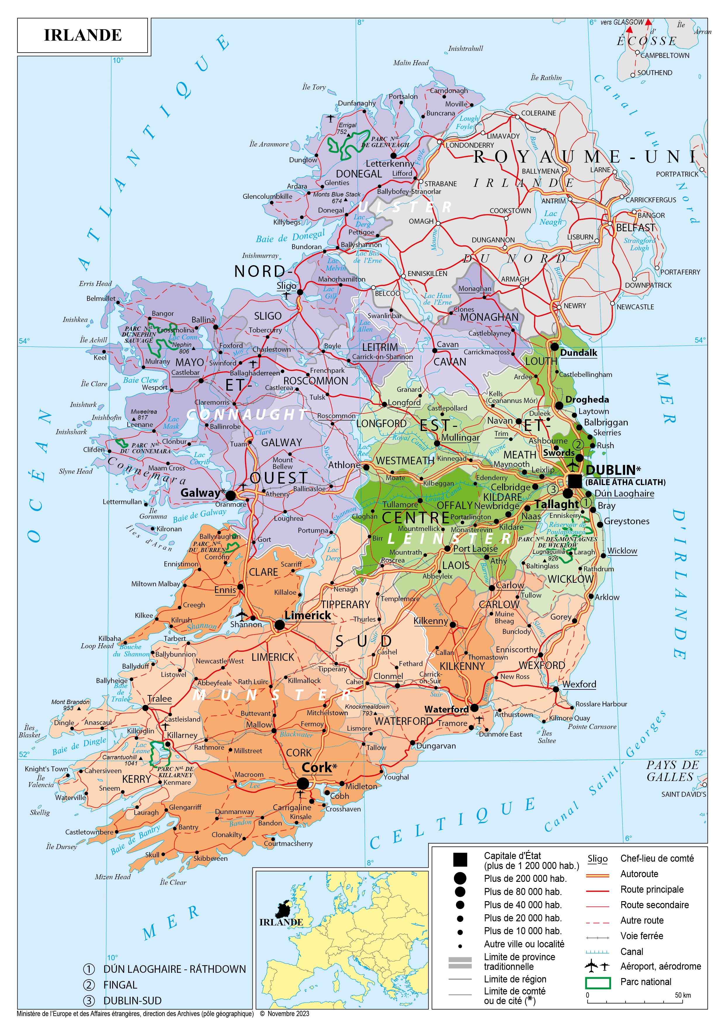 Irlande Navigation latérale fiche pays Dans cette rubrique Irlande Présentation de l'Irlande Conseils aux voyageurs Dernières minutes et alertes Sécurité Entrée / séjour Santé Informations utiles Voyages d'affaires Contacts utiles Politique et économie Relations bilatérales Présentation de l'Irlande Date de mise à jour le : 01 avril 2026 Information toujours valable à la date du jour Présentation du pays Données générales Nom officiel : IrlandeNature du régime : République parlementaireChef de l’Etat : Michael D. Higgins, Président (depuis le 11 novembre 2011, réélu le 26 octobre 2018 pour un nouveau mandat de 7 ans)Premier ministre (Taoiseach) : Micheál Martin (nommé le 23 janvier 2025) Données géographiques Superficie : 70 273 km²Capitale : DublinVilles principales : Cork, Galway, Limerick, WaterfordLangues officielles : anglais et gaélique irlandaisMonnaie : euro (mis en circulation le 01/01/2002)Fête nationale : 17 mars (St Patrick) Données démographiques Population : 5,149 millions au recensement de 2022 ; estimation de 5,38 millions en avril 2024 (dernières estimations officielles irlandaises)Croissance démographique : +1,9% d’avril 2023 à avril 2024Espérance de vie : 80,5 ans pour les hommes, 84,3 ans pour les femmes (2021)Taux d’alphabétisation : 99 %Religions (recensement de 2022) : catholiques (69,1 %), Eglise d’Irlande (anglicane, 2,5 %), orthodoxes (2 %), musulmans (1,6 %), sans religion (14,5 %), autres chrétiens (0,7 %), hindous (0,6%) autres (9 %).Indice de développement humain : 0,95 (au 7ème rang mondial, classement PNUD 2022) Politique intérieure Le gouvernement actuel connaît une grande stabilité depuis les élections générales de 2020. Depuis cette date, les deux grands partis centristes, Fine Gael (PPE) et Fianna Fáil (RE), se partagent le pouvoir et les principaux postes du gouvernement. Encouragé par une dynamique favorable, le Premier ministre Simon Harris (Fine Gael) a décidé à l’automne dernier de convoquer des élections législatives anticipées le 29 novembre 2024. Après avoir longtemps fait la course en tête, le Fine Gael s’est vu rattraper dans les derniers jours par ses rivaux, le Fianna Fáil, qui a remporté 48 sièges, et le Sinn Féin (GUE/NGL, 39 sièges), le parti du Premier ministre finissant 3ème avec 38 sièges. Les négociations en vue d’une reconduction de la coalition Fine Gael - Fianna Fáil ont rapidement abouti. Le leader du Fianna Fáil Micheál Martin, jusqu’alors ministre des Affaires étrangères, est redevenu le 23 février Premier ministre, poste qu’il avait déjà occupé de juin 2020 à décembre 2022. Comme au cours de la dernière législature, une permutation au poste de Premier ministre en cours de mandat entre leaders des deux grands partis est prévue par le programme de la coalition. Simon Harris, devenu ministre des Affaires étrangères et du Commerce et ministre de la Défense, devrait ainsi redevenir Premier ministre en novembre 2027. La coalition s’appuie également sur 9 députés indépendants pour compléter sa majorité. Politique étrangère La diplomatie de Dublin s’articule autour de quatre axes : les liens avec le Royaume-Uni et les Etats-Unis, l’engagement européen, les Nations Unies et les relations UE-Afrique. Il convient d’y ajouter une attention particulière à la situation au Proche-Orient, avec un fort tropisme propalestinien de la classe politique comme de la population, qui s’est à nouveau illustré depuis le déclenchement de la guerre entre Israël et le Hamas. Les liens historiques et géographiques entre l’Irlande et le Royaume-Uni se traduisent par des relations commerciales étroites, un dispositif spécifique en termes de circulation et de droits des citoyens et une implication conjointe dans le dossier nord-irlandais. Si les relations entre l’Irlande et son « voisin le plus proche » connaissent des difficultés depuis le Brexit, la signature en février 2023 du « Cadre de Windsor » a apaisé les tensions. La présence au couronnement de Charles III, le 6 mai 2023, du Président de l’Irlande, du Taoiseach et de la vice-présidente du Sinn Féin (et Première ministre désignée d’Irlande du Nord) Michelle O’Neill a également illustré le rapprochement bilatéral entre les deux pays. Le gouvernement irlandais a accueilli favorablement la victoire des Travaillistes aux élections générales du 4 juillet. En moins d’un an, le Premier ministre Keir Starmer s’est rendu en visite à Dublin (7 septembre 2024) et a accueilli trois fois ses homologues irlandais (Simon Harris le 17 juillet et le 6 décembre 2024, Micheál Martin les 5 et 6 mars 2025). A l’occasion de cette dernière rencontre, qualifiée de premier « sommet britanno-irlandais », une déclaration conjointe a été signée pour renforcer la coopération sur les questions de sécurité, d’économie et de culture. Les liens entre les Etats-Unis et l’Irlande sont très étroits. Signe de cette proximité, le Premier ministre irlandais est traditionnellement reçu à la Maison Blanche vers le 17 mars, jour de la Saint-Patrick (le 12 mars en 2025). Les IDE américains représentaient en 2022 492 Mds € et 80% du stock total en Irlande, à l’origine de quelque 209 000 emplois directs. L’administration Clinton a joué un rôle crucial dans la conclusion de l’accord du Vendredi Saint en 1998 et les Etats-Unis restent toujours impliqués au plus haut niveau dans les questions nord-irlandaises. D’origine irlandaise, le Président Biden s’était rendu en Irlande du 11 au 14 avril 2023. Lors du recensement de 2020, 32 millions d’Américains ont revendiqué une ascendance irlandaise (contre 40 millions 10 ans plus tôt). L’Irlande, qui dispose d’un fort excédent commercial avec les Etats-Unis, cherche à se prémunir de tout conflit commercial avec Washington et renforce par conséquent son dispositif commercial, diplomatique et 
