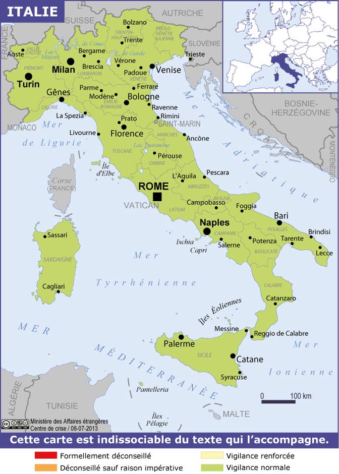 Italie Navigation latérale fiche pays Dans cette rubrique Italie Présentation de l'Italie Conseils aux voyageurs Dernières minutes et alertes Sécurité Entrée / séjour Santé Informations utiles Voyages d'affaires Contacts utiles Politique et économie Relations bilatérales Sécurité Date de mise à jour le : 08 avril 2026 Information toujours valable à la date du jour Imprimer Imprimer Vous voyagez à l'étranger ? Pour recevoir des alertes, inscrivez-vous sur Fil d'Ariane. S'inscrire sur Fil d'Ariane Donnez-nous votre avis Aidez-nous à améliorer notre service en répondant à notre enquête. Répondre à l'enquête utilisateurs Fermer Vérifiez que vous êtes bien assurés Avant de voyager, il est indispensable de vérifier que vous êtes bien assuré Quelle est la portée des Conseils aux Voyageurs ? Zones de vigilance Dernière actualisation le 09/03/2026, information toujours valable à la date du jour Risques encourus et recommandations associées Criminalité Vols Les vols à la tire sont fréquents dans les grandes agglomérations. Il convient donc d’être particulièrement vigilant dans les endroits suivants : les lieux et attractions touristiques ; les hôtels, les restaurants et les bars ; les transports publics (métro, trains couchette ou autobus urbains notamment) ; les aéroports et les gares ; les plages. Il est conseillé de surveiller constamment ses bagages, sacs et effets personnels. La subtilisation du bagage ou sac laissé à terre, en le dissimulant dans un bagage à fond vide, est un mode opératoire courant. Les vols dans les véhicules sont courants et les voleurs ciblent souvent les voitures de location. Ceux-ci pourraient utiliser des techniques de distraction ou simuler des accidents. Des cas d’escroqueries au pneu crevé ont été signalés aux abords des grandes villes : une personne signale au conducteur une crevaison (parfois intentionnellement provoquée) et lui propose son aide pour changer le pneu, pendant qu’un tiers vole discrètement les effets personnels à l’intérieur du véhicule en stationnement. Les vols peuvent se produire dans des stations-service, des aires de service en bordure des autoroutes et dans des stationnements. Les routes à proximité du littoral sont des zones particulièrement exposées. Les propriétaires de camping-cars doivent y être tout spécialement vigilants. Il convient de redoubler de prudence aux feux rouges. Des voleurs en scooter ou à pied profitent souvent de l’occasion pour arracher les sacs se trouvant sur le siège du passager. A Rome, il est recommandé d’être très vigilant à ses effets personnels dans le métro, en particulier sur la ligne B qui dessert la plupart des sites touristiques. Les précautions à prendre circuler avec le strict minimum : ne pas transporter ses documents d’identité et moyens de paiement dans un seul sac, circuler si possible avec des photocopies des documents d’identité et titres de voyage ou des copies numérisées dans son téléphone portable (en laissant les originaux en lieu sûr, par exemple dans le coffre-fort de l’hôtel), ne pas porter sur soi de fortes sommes d'argent en liquide, ni de bijou ou de montre de prix, préférer un sac ou une pochette à porter sous ses vêtements ; avoir à disposition le numéro de téléphone de sa compagnie d’assurance, du correspondant de sa banque et du standard permettant de faire opposition à tout moment sur sa carte bancaire ; fermer les portières et les vitres de son véhicule, même lorsque l’on circule en ville ; ne rien laisser de visible dans un véhicule en stationnement ; pour les voitures en général et les camping-cars en particulier, privilégier les espaces gardés pour les stationnements temporaires ou de longue durée ; à la plage, privilégier les "lidos" (même s’ils sont payants) qui permettent d’éviter les plages "libres", non surveillées (plage comme baignade). Cybercriminalité / Fraude La cybercriminalité est présente. Les auteurs de ces crimes peuvent compromettre les réseaux Wi-Fi publics pour voler des informations de cartes de crédit ou autres informations personnelles. On recense également des fraudes liées aux cartes de crédit et à l’utilisation des guichets automatiques. Lors de l’utilisation d’une carte de débit ou de crédit : redoubler de vigilance lorsque vos cartes sont manipulées par d’autres personnes pour un paiement ; utiliser des guichets automatiques bancaires situés dans des endroits publics ou à l’intérieur d’une banque ou d’un commerce ; éviter les lecteurs de cartes à l’aspect inhabituel ; couvrir le clavier d’une main lorsque l’on entre le code PIN ; vérifier son relevé de compte pour y détecter toute transaction non autorisée. Agressions sexuelles En cas d’agression sexuelle : demander une assistance médicale même en l’absence de signes de violence physique ; communiquer immédiatement avec le service de police local, et s’assurer qu’un rapport est déposé ; informer les agents du consulat général de France le plus proche. Dépôt d’une plainte en Italie En cas de vol de papiers et préalablement à toute démarche auprès des autorités consulaires, il est nécessaire de déposer plainte auprès des services de police locaux (Carabinieri ou Polizia di Stato). Il est recommandé à tout ressortissant français victime d’une infraction sur le territoire italien de déposer systématiquement plainte auprès des autorités locales de police, sans attendre le retour en France, afin de ne pas dépasser le délai légal octroyé, obstacle à toutes poursuites judiciaires futures. Pour les infractions suivantes, le délai pour déposer une plainte est de trois mois : atteintes aux personnes : injure, diffamation, menaces, violences volontaires ayant entraîné une incapacité inférieure ou égale à vingt jours, soustraction de mineur ou d’une personne incapable, blessures involontaires même 