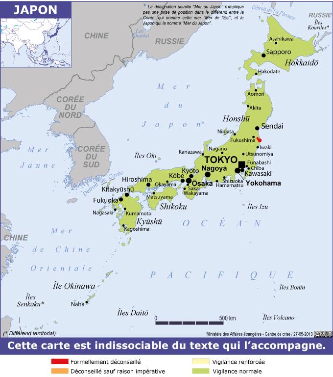 Japon Navigation latérale fiche pays Dans cette rubrique Japon Présentation du Japon Politique et économie Conseils aux voyageurs Dernières minutes et alertes Sécurité Entrée / séjour Santé Informations utiles Voyages d'affaires Contacts utiles Relations bilatérales Sécurité Date de mise à jour le : 27 mars 2026 Information toujours valable à la date du jour Imprimer Imprimer Vous voyagez à l'étranger ? Pour recevoir des alertes, inscrivez-vous sur Fil d'Ariane. S'inscrire sur Fil d'Ariane Donnez-nous votre avis Aidez-nous à améliorer notre service en répondant à notre enquête. Répondre à l'enquête utilisateurs Fermer Vérifiez que vous êtes bien assurés Avant de voyager, il est indispensable de vérifier que vous êtes bien assuré Quelle est la portée des Conseils aux Voyageurs ? Zones de vigilance Dernière actualisation le 09/03/2026, information toujours valable à la date du jour Avertissement concernant les animaux sauvages Des animaux pouvant être dangereux pour l’homme sont nombreux dans les zones naturelles forestières, y compris celles très fréquentées par les promeneurs. L’archipel fait actuellement face à une augmentation des attaques d’ours dans les régions du nord-ouest et dans la préfecture d’Hokkaido, principalement dans les zones rurales et montagneuses. Le bilan officiel fait état de plus de 220 blessés et 13 décès. Les attaques ont lieu non seulement dans la nature mais aussi dans des villages situés en zone rurale.Lors de tout déplacement dans des zones rurales et montagneuses (domaines skiables inclus), il convient d’adopter la plus grande vigilance et de respecter scrupuleusement les consignes de sécurité des autorités japonaises. Cartes de recensement des attaques et rencontres avec des ours :https://kumamap.com/en/mapHokkaido https://higumap.info/recentAkita https://www.sakigake.jp/special/maps/bear-encount/Niigata https://www.arcgis.com/apps/dashboards/20b4d06fb3b34776959a4e69c7a8511aTochigi https://www.shimotsuke.co.jp/feature/theme/%E3%81%A8%E3%81%A1%E3%81%8E%E3%82%AF%E3%83%9E%E7%9B%AE%E6%92%83%E6%83%85%E5%A0%B1 On peut aussi rencontrer des singes à la recherche de nourriture, y compris dans certaines agglomérations. Afin de limiter ce risque lors de randonnées, il importe de prendre les précautions usuelles bien connues des Japonais : être attentif à la signalisation spécifique (pictogrammes), suspendre une clochette à ses vêtements ou à son sac à dos, éviter de manger ou de présenter de la nourriture en présence des animaux, s’abstenir de s’approcher des groupes de singes, ne pas laisser de restes de nourriture. Avertissement concernant la montagne Les zones montagneuses peuvent être des zones à risque, où les conditions climatiques peuvent être particulièrement rudes notamment l’hiver. Il est aisé de s’y perdre. Il est donc vivement conseillé de respecter les recommandations locales, comme les éventuelles interdictions, notamment dans la pratique du ski hors-piste. Des accidents de ski hors-piste sont recensés chaque année, en particulier sur l’île d’Hokkaido. Fukushima Autour de la centrale nucléaire de Fukushima-1 (site industriel isolé sur le littoral de la préfecture de Fukushima) sont définies une zone interdite et des zones d’accès restreint. A l’exception de cette zone, clairement identifiée, rien ne s’oppose à se rendre au Japon ou à se déplacer sur le territoire japonais. Risques encourus et recommandations associées Risques naturels En raison de sa géographie, le Japon connaît de nombreuses catastrophes naturelles (séismes, éruptions volcaniques, glissements de terrain, typhons, crues et inondations). Consulter la fiche Risques climatiques. Activités sismiques Situé à la convergence de quatre plaques tectoniques, le Japon est secoué par 20 % des tremblements de terre les plus importants de notre planète. A tout moment et en tout lieu, un séisme aux conséquences très lourdes peut se produire : effondrement de bâtiments, mise hors service d’infrastructures et d’équipements. Tout séisme important est suivi d’une série de secousses secondaires. Consulter la fiche Séismes. En cas de séisme majeur ou inquiétant, il est recommandé de contacter sa famille ou ses proches afin de les rassurer. Il convient également de prendre contact avec l’Ambassade de France au Japon, chargée de centraliser l’ensemble des informations sur la situation de la communauté française résidente ou de passage. Dans tous les cas, conserver son calme, se protéger, suivre les instructions et attendre les secours, si nécessaire. Si des consignes d’évacuation et/ou de regroupement sont données par les autorités locales, rejoindre le lieu de regroupement le plus proche indiqué (en général parc ou école). Il est ensuite recommandé de communiquer à l’ambassade de France, et/ou à une autre ambassade de l’Union européenne, la liste des compatriotes ou ressortissants européens présents sur le lieu de regroupement avec, si possible, adresse et numéro de téléphone des personnes à prévenir. Ne pas oublier de préciser le lieu où l’on se trouve, ainsi que la date et l’heure. Activités volcaniques Le Japon connait un grand nombre de volcans considérés comme actifs. Les volcans placés en alerte par les autorités japonaises présentent un risque de projection de cendres, de coulées de lave et de gaz volcaniques. Il convient de se tenir informé de l’évolution de la situation et de se conformer strictement aux recommandations des autorités locales, en respectant notamment les périmètres d’exclusion autour des cratères. Le volcan Sakurajima situé dans la préfecture de Kagoshima, sur l’île méridionale de Kyushu, est l’un des volcans du Japon les plus actifs actuellement. Le niveau d’alerte, après avoir atteint le niveau 5 (évacuation des résidents des zones à proximité du volcan) en juillet 2022, deme