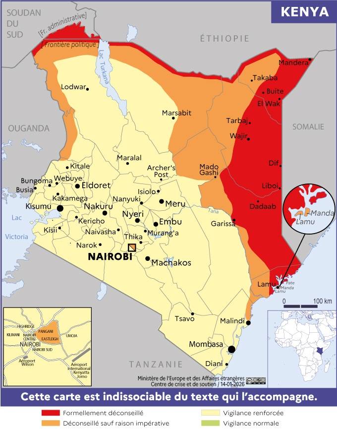 Kenya Navigation latérale fiche pays Dans cette rubrique Kénya Présentation du Kénya Conseils aux voyageurs Dernières minutes et alertes Sécurité Entrée / séjour Santé Informations utiles Voyages d'affaires Contacts utiles Politique et économie Relations bilatérales Sécurité Date de mise à jour le : 02 avril 2026 Information toujours valable à la date du jour Imprimer Imprimer Vous voyagez à l'étranger ? Pour recevoir des alertes, inscrivez-vous sur Fil d'Ariane. S'inscrire sur Fil d'Ariane Donnez-nous votre avis Aidez-nous à améliorer notre service en répondant à notre enquête. Répondre à l'enquête utilisateurs Fermer Vérifiez que vous êtes bien assurés Avant de voyager, il est indispensable de vérifier que vous êtes bien assuré Quelle est la portée des Conseils aux Voyageurs ? Zones de vigilance Dernière actualisation le 10/03/2026, information toujours valable à la date du jour Zones formellement déconseillées (rouge) Il est formellement déconseillé de séjourner à la frontière entre le Kénya et la Somalie, en raison des mouvements de troupes à la frontière, des menaces récurrentes et des incursions et attaques opérées par le mouvement Al Shabab sur le sol kényan. Le risque d’enlèvement est également important. La zone concernée s’étend jusqu’à 100 km à l’intérieur du pays. Elle inclut les localités de Mandera, Buite, El Wak, Dif, Liboi, Dadaab, Garissa (ainsi que la route menant de cette localité à Dadaab). Les axes routiers sont exposés aux risques d’attentats à l’explosif ou d’attaque par des bandes criminelles. Pour les mêmes raisons, la partie continentale du comté de Lamu est également formellement déconseillée. Les déplacements à la frontière avec le Soudan du Sud et avec l’Éthiopie sont formellement déconseillés, en raison des risques d’incursions par des bandes armées de part et d’autre. Zones déconseillées sauf raison impérative (orange) Compte tenu de l’insécurité récurrente, il est déconseillé de se rendre au nord de la ligne Kitale/ Archers’ Post/ Garissa (comtés de Turkana, Marsabit et Wajir), sauf raison impérative et sous réserve d’être accompagné d’une escorte policière. Cette région est marquée par des tensions intercommunautaires qui, sur fond de sécheresse et de compétition pour l’accès à l’eau et aux pâturages, donnent régulièrement lieu à des conflits localisés mais meurtriers. Il est possible d’accéder aux réserves nationales de Shaba, Buffalo Springs et Samburu. Compte tenu de l’activité de groupes terroristes, la région côtière de l’océan Indien au nord de la ville de Malindi est déconseillée sauf raison impérative. Malgré sa situation insulaire, il est également déconseillé sauf raison impérative de se rendre dans l’archipel de Lamu, situé dans un comté où sévissent régulièrement des groupes terroristes. L’accès ne doit se faire que par voie aérienne, les accès par le continent étant formellement déconseillés. Plusieurs quartiers de Nairobi (Eastleigh, Pangani, Kibeira et Mathare) sont déconseillées et il est recommandé d’y faire preuve de la plus grande prudence. Il est recommandé de faire preuve de vigilance renforcée dans le reste de la capitale en particulier dans les lieux publics les plus fréquentés, notamment par les ressortissants étrangers (centres commerciaux, bars, hôtels …). De manière générale, il convient de privilégier pour les sorties les lieux qui bénéficient d’un dispositif de sécurité effectif et dissuasif. Zones en vigilance renforcée (jaune) À l’exception des zones formellement déconseillées et déconseillées sauf raison impérative, le reste du territoire kényan est placé en vigilance renforcée. Risques encourus et recommandations associées Terrorisme Il existe une menace terroriste significative, notamment à l’initiative du Shebab al Islami, sur l’ensemble du Kénya, en particulier dans les régions frontalières de la Somalie (comtés de Mandera, Garissa, Lamu) où les déplacements sont formellement déconseillés, en raison d’attaques et d’enlèvements fréquents. Le pays est par ailleurs confronté à la menace de l’« Etat islamique », également présent dans son environnement régional immédiat, notamment en Somalie et au Mozambique. Depuis 2019, le Shebab al Islami a conduit deux opérations d’envergure au Kénya : dans la capitale Nairobi (attaque du complexe hôtelier Dusit en janvier 2019) et dans le comté de Lamu (attaque contre la base de Manda Bay en janvier 2020). Dans ce contexte et particulièrement à Nairobi et dans les grandes villes (Kisumu, Mombasa…), il convient de faire preuve d’une vigilance accrue dans les lieux publics touristiques ou très fréquentés, notamment par les ressortissants étrangers (centres commerciaux, bars, hôtels), qui pourraient constituer une cible privilégiée pour des attaques terroristes. Il est recommandé d’observer la plus grande vigilance et de privilégier les lieux de sortie et de séjour sécurisés, qui bénéficient d’un dispositif de sécurité visible et dissuasif (vigiles). En cas de présence à proximité directe du lieu d’un incident (explosion, attaque armée), il est recommandé de s’éloigner rapidement, de rassurer ses proches et de se signaler à l’ambassade. Délinquance La criminalité au Kénya demeure l’une des plus élevées d’Afrique : les vols à la tire (assortis de violence en cas de résistance), les agressions en voiture et les cambriolages sont fréquents. La vigilance est donc de mise, notamment dans les centres urbains (Nairobi, Kisumu, Mombasa) ainsi que sur l’ensemble de la côte et des régions touristiques. Les zones résidentielles n’échappent pas à ce phénomène. Des opérations de police sont fréquentes dans les comtés de Turkana, West Pokot, Elgeyo Marakwet, Baringo, Laikipia et Samburu, afin de traquer d
