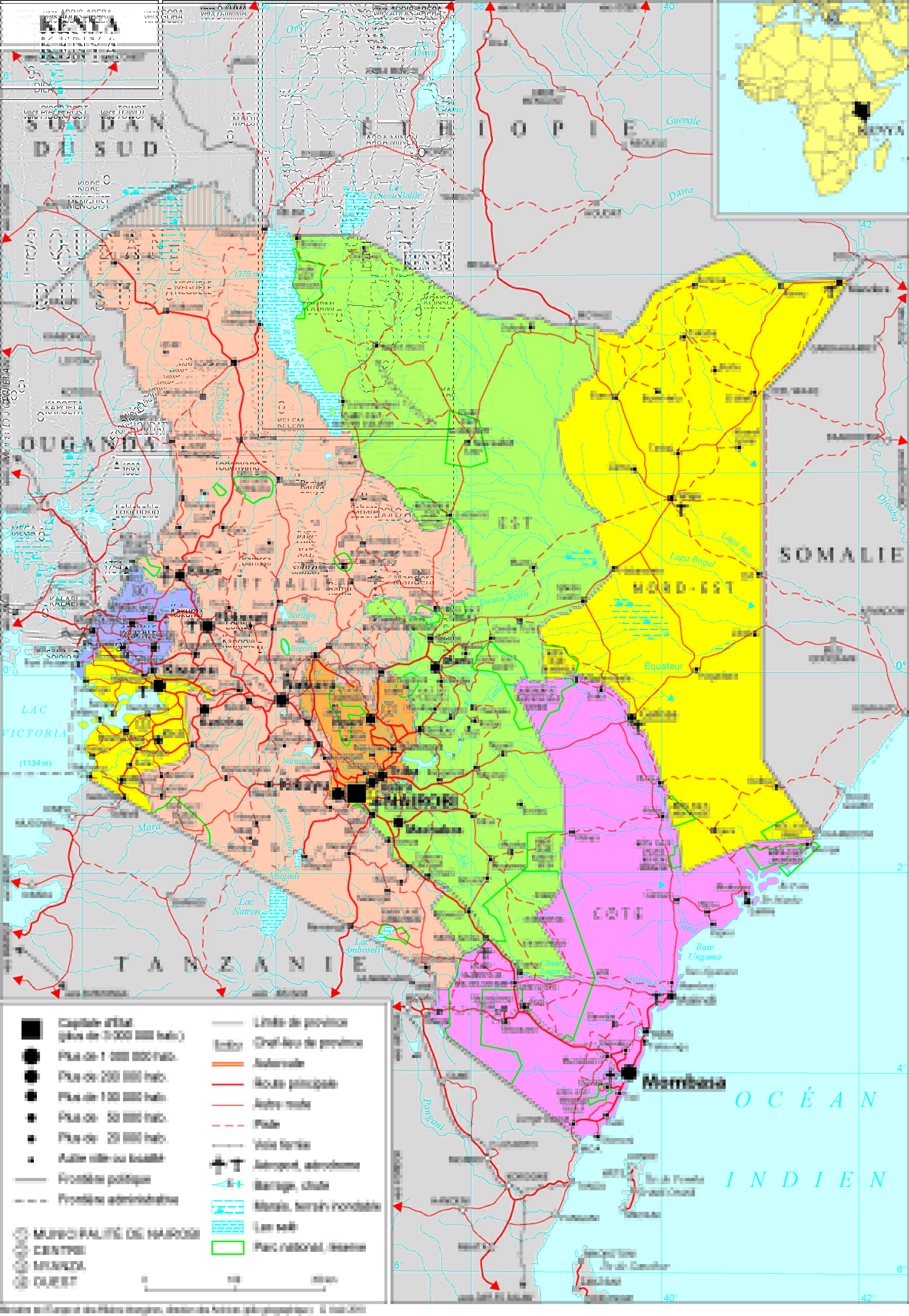 Kenya Navigation latérale fiche pays Dans cette rubrique Kénya Présentation du Kénya Conseils aux voyageurs Dernières minutes et alertes Sécurité Entrée / séjour Santé Informations utiles Voyages d'affaires Contacts utiles Politique et économie Relations bilatérales Présentation du Kénya Date de mise à jour le : 01 avril 2026 Information toujours valable à la date du jour Présentation du pays Données générales Nom officiel : République du KenyaNature du régime : régime présidentielChef de l’État : William Samoei Ruto (né le 21 décembre 1966) Données géographiques Superficie : 580 367 km²Capitale : NairobiVilles principales : Nairobi, Mombasa, Kisumu, Eldoret, Nyeri, Meru, EmbuLangue officielle : anglais, swahiliMonnaie : Shilling kenyan (1 EUR = 160,95 KES au 03/11/2023)Fête nationale : 12 décembre (Indépendance) Données démographiques Population : 54,03 millions (Banque mondiale, 2022)Densité : 93 habitants/km² (Banque mondiale, 2021)Taux de croissance démographique annuel : 2,3 % (ONU, 2020)Espérance de vie : 66,2 ans (ONU, 2015-2020)Taux d’alphabétisation 83% des 15 ans et plus (Banque mondiale, 2022)Religions : Protestants 45 % ; Catholiques 33 % ; Musulmans 10 % ; Animistes 10 % ; autres 2 %Indice de développement humain : 0,5 (Banque mondiale, 2020) Politique intérieure La vie politique kenyane a été longtemps dominée par la KANU (Kenya African National Union), parti de Jomo Kenyatta, premier président du Kenya et père de l’indépendance (1963). Après la restauration du multipartisme en 1991, le Kenya connaît sa première alternance démocratique en 2002, avec l’élection de Mwai Kibaki, qui succède à Daniel Arap Moi, président du Kenya de 1978 à 2022. La crise électorale de 2007-2008 pour la réélection de Mwai Kibaki (1.300 morts, 600.000 déplacés) constitue un tournant politique et conduit à des réformes institutionnelles pour œuvrer à la réconciliation nationale et préparer les élections de 2013 : adoption par référendum d’une nouvelle constitution en août 2010, création d’une commission électorale indépendante, décentralisation, réforme de la justice et de la police. Les élections générales de mars 2013 ont vu la victoire, dès le premier tour, avec 50,07 % des voix, d’Uhuru Kenyatta, chef de la coalition « Jubilee ». William Ruto est élu en tant que vice-président. Les élections présidentielles du 8 août 2017, largement remportées par Uhuru Kenyatta (54 % des suffrages exprimés contre 44 % pour son rival Raila Odinga) ont été annulées par la Cour suprême le 1er septembre. Le nouveau scrutin présidentiel, organisé le 26 octobre 2017 et boycotté par Raila Odinga, a été remporté par Uhuru Kenyatta avec plus de 98% des voix, mais avec une faible participation au niveau national. Le 20 novembre 2017, la Cour suprême a confirmé la réélection d’Uhuru Kenyatta. Après sa réélection à la présidence du pays, Uhuru Kenyatta s’est donné quatre priorités pour son nouveau mandat (Big Four Agenda) : 1/ la mise en place d’une couverture médicale universelle, 2/ la facilitation de l’accès au logement et notamment à la propriété, 3/ la création d’emplois et d’opportunités pour les jeunes, 4/ l’amplification des relations commerciales du Kenya avec ses partenaires extérieurs. Il a fait le choix de la réconciliation avec son opposant Raila Odinga et a mis en scène une poignée de main symbolisant la nouvelle alliance politique. A l’issue du scrutin présidentiel du 9 août 2022, les résultats ont donné William Ruto vainqueur. Il a prêté serment le 13 septembre 2022. Politique étrangère La politique étrangère du Kenya est centrée en priorité sur son environnement régional direct et la promotion de ses intérêts économiques. La situation en Somalie est pour le Kenya un sujet d’inquiétude majeur. Le pays a subi deux attaques majeures du groupe Al Shabaab : du 21 au 24 septembre 2013, le centre commercial du Westgate a été la cible du groupe terroriste tuant 68 personnes et faisant plus de 200 blessés ; le 2 avril 2015, l’université de Garissa a également été la cible d’une attaque qui a fait 152 victimes. Le 5 janvier 2020, la base américano-kenyane de Camp Simba a été prise pour cible par les Shebabs, conduisant à la mort de 3 soldats américains. Craignant les incursions de la milice islamiste Al Shabaab sur son territoire, le Kenya est intervenu militairement en Somalie en octobre 2011 et a créé une zone tampon le long de sa frontière. Depuis février 2012, les forces kenyanes participent à la mission de transition de l’Union africaine en Somalie (ATMIS, anciennement AMISOM). Près de 500 000 réfugiés vivent au Kenya, ceux-ci venant principalement de Somalie (275 000) et du Soudan du Sud (115 000), et le pays compte environ 300 000 déplacés internes. Le camp de Dadaab accueille à lui seul 230 000 personnes. Le Kenya est membre fondateur de la Communauté d’Afrique de l’Est (EAC), avec la Tanzanie et l’Ouganda. Il a joué un rôle moteur dans les différentes étapes de l’intégration de cette organisation intergouvernementale : union douanière en 2005 ; lancement d’un marché commun le 1er juillet 2010 ; projet d’union monétaire ; lancement en juin 2015 de la zone de libre-échange tripartite réunissant les 26 pays de l’EAC. Depuis novembre 2022, un contingent kenyan est déployé dans l’Est de la République démocratique du Congo (RDC) dans le cadre de la force régionale de l’EAC, qui vise à stabiliser la situation dans la région. L’institution est cependant en déficit d’une nouvelle impulsion politique et doit faire face à des difficultés financières. Par ailleurs, l’instauration de barrières non-tarifaires de la part de certains pays freine l’intégration économique de la région. Le Kenya est également membre de l’IGAD (Intergovernmental Authority on Development), qui