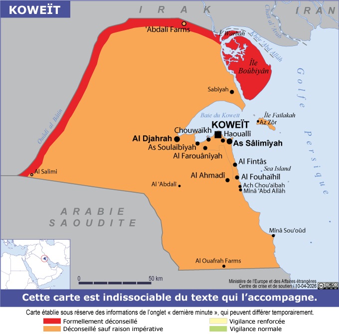 Koweït Navigation latérale fiche pays Dans cette rubrique Koweït Présentation du Koweït Conseils aux voyageurs Dernières minutes et alertes Sécurité Entrée / séjour Santé Informations utiles Voyages d'affaires Contacts utiles Politique et économie Relations bilatérales Sécurité Date de mise à jour le : 10 avril 2026 Information toujours valable à la date du jour Imprimer Imprimer Vous voyagez à l'étranger ? Pour recevoir des alertes, inscrivez-vous sur Fil d'Ariane. S'inscrire sur Fil d'Ariane Donnez-nous votre avis Aidez-nous à améliorer notre service en répondant à notre enquête. Répondre à l'enquête utilisateurs Fermer Vérifiez que vous êtes bien assurés Avant de voyager, il est indispensable de vérifier que vous êtes bien assuré Quelle est la portée des Conseils aux Voyageurs ? Zones de vigilance Dernière actualisation le 10/04/2026, information toujours valable à la date du jour Il demeure déconseillé aux ressortissants français, sauf pour des raisons impératives, de se rendre au Koweït. En outre, il est formellement déconseillé de se rendre dans une zone de 5 km de large à la frontière avec l’Irak (hormis la localité dite d’Abdali Farms) et dans les îles de Warbah et de Boubiyan, qui font l’objet de missions de sécurisation des forces armées. Recommandations générales Compte tenu de la situation régionale, les voyages vers le Koweït sont déconseillés. L’évolution de la situation dans la région doit faire l’objet d’une attention constante et soutenue. D’une façon générale, il est recommandé d’éviter tout rassemblement, ainsi que la proximité des lieux de culte. Il convient de faire preuve de discrétion dans les espaces publics, notamment dans les localités périphériques, en dehors de la capitale. Il est recommandé aux voyageurs de s’inscrire sur le Fil d’Ariane. Certaines zones du territoire sont interdites (zones militaires) ou balisées. En particulier, l’accès à la zone frontalière avec l’Irak est strictement contrôlé. Il convient de respecter ces restrictions. Les photographies d’infrastructures officielles (forces de sécurité, palais, aéroport, ports, industrie pétrolière…) sont également interdites et les contrevenants poursuivis. L’internet, les applications de rencontre et les réseaux sociaux étant particulièrement surveillés, il convient d’être prudent sur ses activités et publications et d’éviter toute expression ou prise de position publique critique des autorités ou du pays, qu’il s’agisse de sujets relatifs aux affaires intérieures ou à certaines questions régionales, notamment le conflit israélo-palestinien. Les excursions dans le désert peuvent être particulièrement dangereuses en fonction des conditions climatiques (tempêtes de sable, épisodes pluvieux). De plus, des mines résiduelles demeurent dans les zones désertiques. En cas de découverte de résidus suspects, il est recommandé de contacter le numéro d’urgence 112. Navigation en mer La navigation dans l’océan Indien demeure dangereuse, notamment à cause d’actes ponctuels de piraterie. Il est impératif de signaler tout projet de déplacement par voie maritime dans la région et de rejoindre la coopération maritime volontaire en transmettant sa position et ses intentions à : État-major ALINDIEN COMFOR EAU : par téléphone +971 74 265 21 265 ou par courriel à alindien-comfor-eau-marsec.contact.fct@intradef.gouv.fr ou alindien-marsec.operateur.fct@def.gouv.fr ; Consulter également la fiche consacrée à la Piraterie maritime. Situation régionale Les tensions régionales peuvent avoir des répercussions sur la situation au Koweït. L’évolution de la situation dans la région doit faire l’objet d’une attention constante et soutenue en cas de voyage au Koweït. Activités sportives à risques Les randonnées hors-piste dans le désert sont dangereuses en raison du risque de présence éventuelle de munitions et de mines résiduelles (Voir le paragraphe sur les recommandations générales). Arnaques téléphoniques Les escroqueries par téléphone se multiplient. La plus grande vigilance est recommandée : les coordonnées bancaires ne doivent jamais être transmises lors d’un appel. Liste des représentations françaises Ambassade de France au Koweït Al Hamra Tower, 40ème étage Sharq bloc 8 rue Al Shuhada Koweït Koweït Tel : +965 22022817 Ambassade de France au Koweït Réseaux sociaux Facebook Instagram X