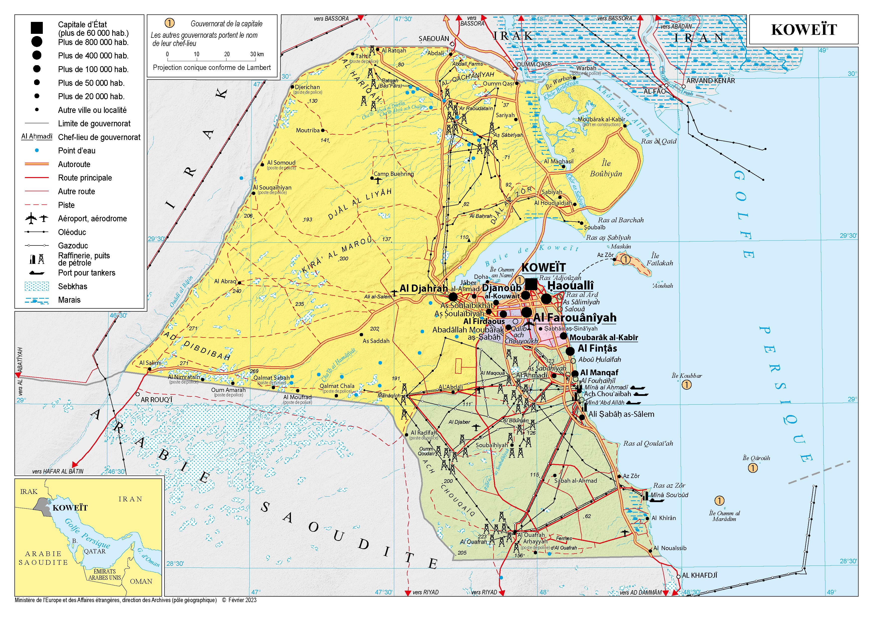 Koweït Navigation latérale fiche pays Dans cette rubrique Koweït Présentation du Koweït Conseils aux voyageurs Dernières minutes et alertes Sécurité Entrée / séjour Santé Informations utiles Voyages d'affaires Contacts utiles Politique et économie Relations bilatérales Présentation du Koweït Date de mise à jour le : 01 avril 2026 Information toujours valable à la date du jour Présentation du pays Données générales Nom officiel : État du KoweïtNature du régime : Monarchie parlementaire Chef de l’État : Son Altesse Cheikh Mechal Al-Ahmad Al-Jaber Al-Sabah (depuis le 16 décembre 2023)Prince héritier : Cheikh Sabah Al-Khaled Al-Hamad Al-Sabah (depuis le 1er juin 2024) Données géographiques Superficie : 17 818 km² Capitale : Koweït (Kuwait-City)Villes principales : Kuwait-City (4.2M d’habitants en 2022, Banque Mondiale), Jahra, Ahmadi Langue officielle : arabeMonnaie : dinar koweitien (1KD = 2,78 euros en septembre 2025) Fête nationale : 25 et 26 février (indépendance acquise en 1961 et libération) Données démographiques Population (2024) : 4.9 millions d’habitants (dont 1,6 million de nationaux, 1 million d’Indiens et 644 000 Egyptiens)Densité : 276 habitants/km² Croissance démographique (2023) : 2,5 % (Banque mondiale)Espérance de vie (2023) : 83 ans (Banque mondiale)Taux d’alphabétisation (2023) : 96,5 % (pour les Koweïtiens à partir 15 ans)Religions : musulmans (74,4% dont 2/3 de sunnites et 1/3 de chiites), chrétiens (16,4%), autres et non spécifiés (9,2%). Indice de développement humain : 0,852 (52ème rang mondial en 2024) Politique intérieure Le Koweït est longtemps apparu comme une exception dans la région, seule monarchie constitutionnelle, avec une culture du débat démocratique très ancrée et des institutions garanties par une constitution inchangée depuis l’indépendance du pays en 1961. Jusqu’à la suspension du Parlement par décret émiral le 10 mai 2024, le pouvoir politique reposait sur un équilibre constitutionnel réparti entre la famille régnante Al-Sabah (pouvoir exécutif) et le parlement (pouvoir législatif). Toutefois, les blocages politiques suscités par l’opposition parlementaire, et l’instabilité ministérielle des dernières années (10 gouvernements en quatre ans) ont conduit l’Émir à suspendre le parlement pour une durée de quatre ans et à annoncer une réforme de la Constitution. Dans ce contexte, le système politique du Koweït est dominé par la figure de l’Emir, le Cheikh Mechal al-Ahmad al-Jaber al-Sabah, qui a le dernier mot sur les décisions centrales du pays. Il a succédé à son demi-frère, l’Emir Cheikh Nawaf al-Ahmad al-Jaber al-Sabah, décédé le 16 décembre 2023. Selon la Constitution, l’Émir désigne son Prince héritier parmi les descendants de Moubarak Le Grand, ayant régné de 1896 à 1915, et considéré comme le père fondateur du Koweït moderne. Un décret émiral du 1er juin 2024 a désigné comme Prince héritier le Cheikh Sabah Al-Khaled Al-Hamad Al-Sabah, ancien Premier ministre (2019-2022) et ministre des Affaires étrangères (2011-2019). Nommé le 12 avril 2024, le gouvernement actuel du Koweït est dirigé par Cheikh Ahmad Abdullah Al-Sabah. Ce gouvernement a l’ambition de procéder à d’importantes réformes structurelles, visant la modernisation des infrastructures et la diversification d’une économie encore largement dépendante au secteur pétrolier. La société koweïtienne se distingue par sa diversité avec 1/3 de nationaux pour 2/3 de ressortissants étrangers. Environ 60 % des familles koweïtiennes sont d’origine bédouines et environ 30 % de la population est de confession chiite. Les femmes occupent des postes à responsabilité dans le secteur public (3 ministres sont des femmes, plusieurs présidentes de grands établissements et agences publiques) et dans le secteur privé (dont le secteur pétrolier, l’ingénierie et le secteur financier). Les femmes sont, en outre, majoritaires dans la plupart des filières d’enseignement supérieur. En 2024, le gouvernement a engagé une importante politique de déchéance de nationalité (plus de 60 000 retraits). Politique étrangère Le Koweït revendique une place singulière dans le paysage régional, en retrait ces dernières années du fait de la crise institutionnelle. Le pays a fait le choix, depuis le traumatisme de l’invasion irakienne (1990), d’une politique de bon voisinage, de modération et de médiation dans un contexte régional troublé. Le Conseil de coopération des Etats arabes du Golfe (CCEAG) constitue le premier cercle de la politique extérieure koweïtienne. Cette organisation régionale est composée de l’Arabie saoudite, de Bahreïn, des Emirats arabes unis, du Koweït, d’Oman et du Qatar. Le Koweït a assuré une médiation durant la crise entre le Qatar d’une part, et l’Arabie saoudite, les Emirats arabes unis, Bahreïn et l’Égypte d’autre part (2017-2021) en jouant un rôle dans leur réconciliation lors des accords d’Al-Ula, le 5 janvier 2021. La politique étrangère du Koweït est de plus en plus alignée sur le cadre fixé par le CCEAG et Riyad. Le Koweït exerce en 2025 la présidence du CCEAG depuis le sommet du 1er décembre 2024 qui s’est tenu à Kuwait City. Avec l’Arabie saoudite, les relations sont denses et proches : le nouvel Émir a effectué son premier déplacement officiel à l’étranger dans le Royaume, le 31 janvier 2024. La relation entre l’Irak et le Koweït est cordiale depuis la fin de la guerre du Golfe (invasion du Koweït par l’Irak) de 1990, mais marquée par des épisodes de tensions sur la délimitation de la frontière maritime. Ce dossier fait l’objet de tentatives de médiation de la part des autres Etats du CCEAG, en particulier de l’Arabie Saoudite. Le Koweït et l’Iran entretiennent des liens historiques. Le Koweït accueille une importante population chiite (30% environ de
