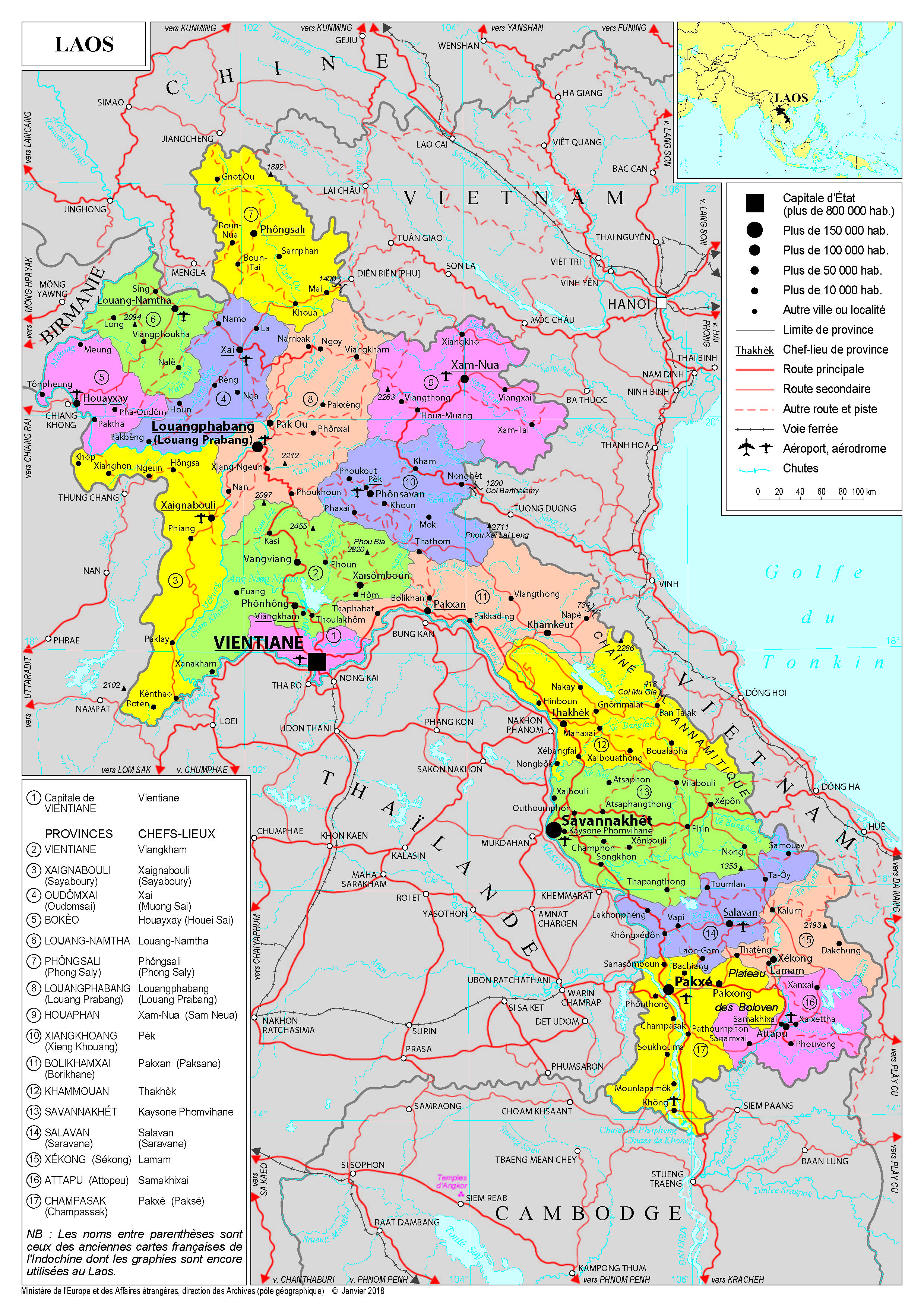 Laos Navigation latérale fiche pays Dans cette rubrique Laos Présentation du Laos Conseils aux voyageurs Dernières minutes et alertes Sécurité Entrée / séjour Santé Informations utiles Voyages d'affaires Contacts utiles Politique et économie Relations bilatérales Présentation du Laos Date de mise à jour le : 23 janvier 2026 Information toujours valable à la date du jour Présentation du pays Données générales Nom officiel : République démocratique populaire laoNature du régime : Parti uniqueChef de l’Etat : M. Thongloun SISOULITH, Président de la République depuis mars 2021, Secrétaire général du Parti révolutionnaire populaire lao depuis janvier 2021 (réélu en janvier 2026)Premier ministre : Dr Sonexay SIPHANDONE, en fonction depuis décembre 2022 Données géographiques Superficie : 236 800 km²Capitale : Vientiane (756 000 habitants)Villes principales : Savannakhet (126 000 habitants), Luang Prabang (90 000) et Paksé (88 000)Langue officielle : laoMonnaie : kip laotien Données démographiques Population : 7,8 millions d’habitants (2024, Banque mondiale)Densité : 23,8 hab./km2 (2023)Croissance démographique : 1,4% (2024, Banque mondiale)Espérance de vie : 69 ans (2023)Taux d’alphabétisation : 75,9% (2023, Banque mondiale)Religions : bouddhisme (65%), animisme (30%) et christianisme (1,5%)Indice de développement humain : 0,62 (2022, Banque mondiale), soit 140e/189 pays Politique intérieure La vie politique intérieure est rythmée par l’organisation tous les cinq ans du Congrès du Parti révolutionnaire populaire lao (Pathet lao, PRPL), parti unique au pouvoir depuis 1975. Le XIIème Congrès en janvier 2026 a acté le renouvellement du Comité central et des membres du Bureau politique et réélu Thongloun SISOULITH Secrétaire général du Parti, fonction traditionnellement doublée de celle de Président de la République. Après les élections législatives qui auront lieu en février prochain, l’Assemblée nationale se réunira en session plénière pour élire le Président de la République, le Premier ministre et confirmer la composition du gouvernement. M. Sonexay SIPHANDONE demeure en attendant Premier ministre. Le XIe Congrès avait mis l’accent sur le maintien de la stabilité politique, la réduction de la pauvreté, la lutte contre la corruption et le renforcement de la croissance économique dans un contexte budgétaire contraint. Le Laos, qui avait pour ambition de sortir de la catégorie des Pays les Moins Avancés (PMA) en 2026, a néanmoins dû revoir ses ambitions. L’impact de la pandémie de Covid-19 a notamment rendu l’exercice plus difficile. Politique étrangère Le Laos entretient des relations politiques privilégiées avec le Vietnam et la Chine. Le Vietnam, allié historique, est lié avec le Laos par un Traité spécial d’amitié et de coopération signé en 1977 (Hanoï assure la formation de la plupart des cadres du Parti populaire révolutionnaire lao et de l’armée). Les relations avec la Chine, plus récentes mais en rapide croissance, s’inscrivent dans un partenariat stratégique global de coopération, conclu en 2009. La Chine est ainsi le premier investisseur et créancier au Laos (elle détiendrait plus de 50% de la dette souveraine), ainsi que le deuxième partenaire commercial du pays, dont elle influence considérablement les politiques. La Thaïlande est son premier partenaire commercial et le deuxième investisseur. Le Laos cherche à diversifier ses relations. Dans ce cadre, il veille à approfondir son intégration régionale au sein de l’ASEAN (qu’il a rejointe en 1997), tout en cherchant à consolider ses relations avec des pays asiatiques et européens. Vientiane a assuré la présidence de l’ASEAN en 2024 sur le thème de la connectivité et de la résilience. Vientiane accueille par ailleurs le secrétariat de la Commission du Mékong (Mekong River Commission). Les relations du Laos avec le Japon et la Corée du Sud sont marquées par l’importance de l’aide au développement qui lui est octroyée (Tokyo en est le premier pourvoyeur). Un partenariat stratégique global a été signé avec le Japon lors de la visite de la princesse Aiko (premier déplacement à l’étranger) en novembre 2025. Au-delà de son environnement proche, le Laos est membre de l’Organisation internationale de la Francophonie (OIF) depuis 1991 et de l’Organisation mondiale du commerce (OMC) depuis 2013. Il est l’un des tout premiers États à avoir ratifié la convention d’Oslo sur les armes à sous-munitions (qu’il accueillera en septembre 2026 en tant que pays le plus affecté au monde par les mines) et le premier pays de l’ASEAN à avoir ratifié l’Accord de Paris sur le climat en 2016. Les relations du Laos avec l’Union européenne (UE) se structurent autour du cadre fixé par l’accord de coopération UE-Laos de 1997, et, au niveau régional, à travers l’ASEAN et l’ASEM. Depuis 2012, la programmation de la coopération se fait conjointement entre la délégation de l’Union européenne et les autres États membres intervenant au Laos. Cette programmation permet de coordonner l’action extérieure de l’UE et de partenaires bilatéraux (la Finlande, la France, l'Allemagne, la Hongrie, l'Irlande, le Luxembourg et la Suisse), en accroissant l’efficacité des efforts de développement et en identifiant des secteurs prioritaires en lien avec la stratégie nationale laotienne de développement. La programmation 2021-2025, déclinée en stratégie « Equipe Europe », a permis 550 MEUR d’engagements, articulée autour de trois priorités : économie verte et inclusive, capital humain et gouvernance. L’UE entretient également un dialogue sur les droits de l’Homme avec le Laos. Situation économique PIB : 16,5 milliards USD (2024, Banque mondiale)PIB par habitant : 2096 USD (2024, Banque mondiale)Croissance : 4% (2024, Banque mondiale) Composition du PIB : agriculture 