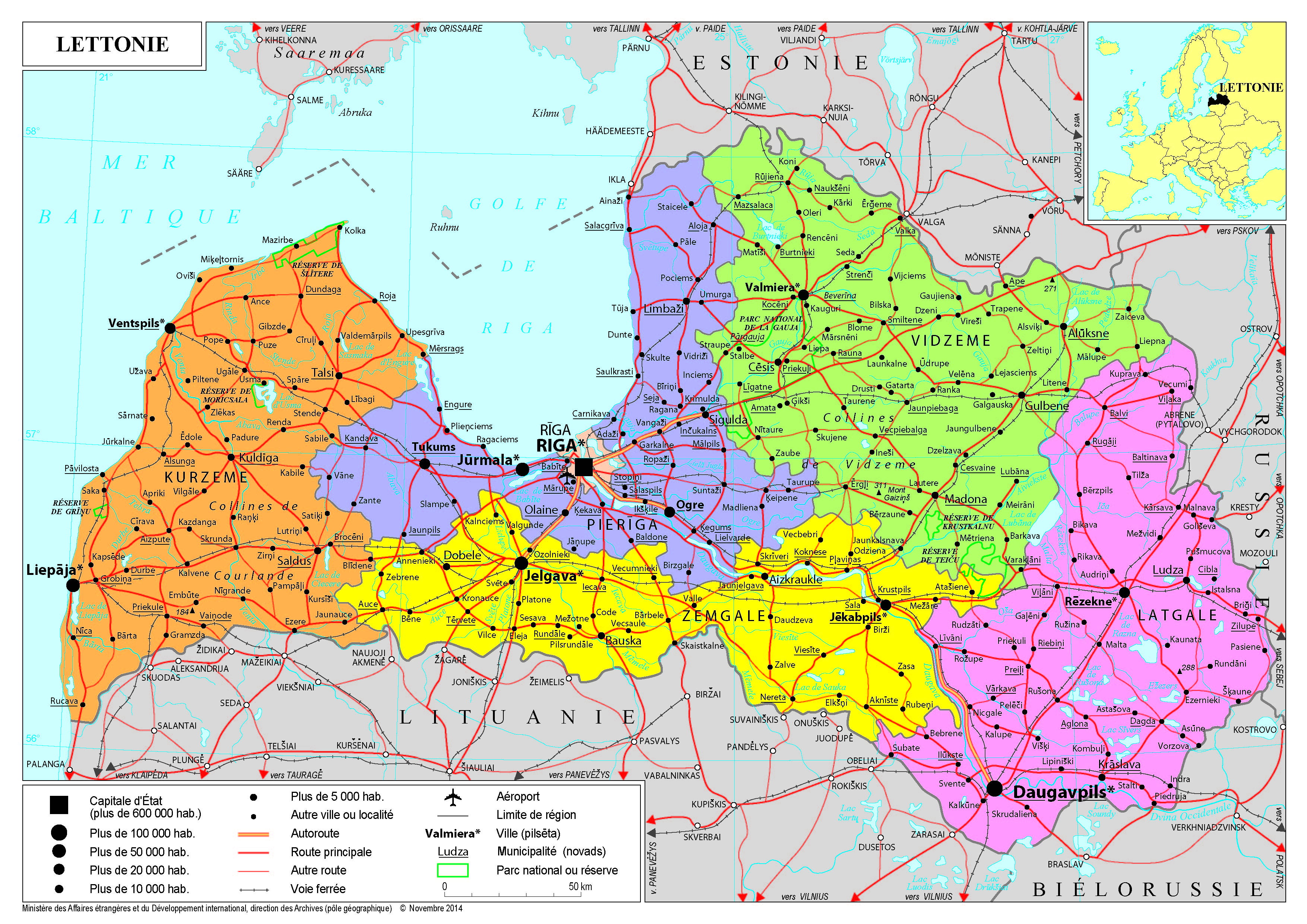 Lettonie Navigation latérale fiche pays Dans cette rubrique Lettonie Présentation de la Lettonie Conseils aux voyageurs Dernières minutes et alertes Sécurité Entrée / séjour Santé Informations utiles Voyages d'affaires Contacts utiles Politique et économie Relations bilatérales Présentation de la Lettonie Date de mise à jour le : 01 avril 2026 Information toujours valable à la date du jour Présentation du pays Données générales Nom officiel : République de LettonieNature du régime : République parlementairePrésident de la République : M. Edgars Rinkēvičs (8 juillet 2023)Première ministre : Mme Evika Siliņa (15 septembre 2023 Données géographiques Superficie : 64 594 km²Capitale : RigaVilles principales : Daugavpils, Liepāja, Jelgava, JūrmalaLangue(s) courante(s) : letton (unique langue officielle), russeMonnaie : euro (depuis le 1er janvier 2014)Fêtes nationales : 18 novembre (proclamation de l’indépendance en 1918), 4 mai (déclaration de restauration de l’indépendance en 1990) Données démographiques Population (2024) : 1 871 882Densité : 30 hab/km²Croissance démographique (2024) : -0,6 % par rapport à 2023Espérance de vie (2023) : 70,4 ans pour les hommes, 80,4 ans pour les femmesTaux d’alphabétisation (2021) : 99,99 %Religion(s) : Pas de religion officielle. Protestantisme luthérien, catholicisme romain, orthodoxie russeIndice de développement humain (2022) : 0,879 (37e rang) Politique intérieure Apparue sur la scène internationale en 1918, la Lettonie a été occupée par l’Union soviétique en juin 1940, par l’Allemagne nazie en juin 1941 et de nouveau par l’Union soviétique à partir de 1944. En 1991, elle a restauré son indépendance. La Constitution de la Lettonie attribue un rôle majeur à la Saeima, parlement monocaméral composé de cent membres élus pour quatre ans au scrutin proportionnel. Le président de la République est élu par les députés pour un mandat de quatre ans. Le Président nomme le Premier ministre. Edgars Rinkēvičs a été intronisé Président de la République le 8 juillet 2023. Il était auparavant et depuis 2011 ministre des affaires étrangères. Il participe aux sommets de l’OTAN. Evika Siliņa, ex-ministre des affaires sociales, est la Première Ministre depuis septembre 2023. Elle participe aux Conseils européens. La coalition gouvernementale, tripartite, réunit la « Nouvelle Unité », formation majoritaire de centre-droit, les « Progressistes » (centre-gauche) et « l’Alliance des Verts et des Agrariens (ZZS) » (parti libéral et régionaliste). Sous son impulsion, le Parlement a notamment voté en novembre 2023 un paquet législatif qui crée un partenariat civil ouvert à tous les couples. Les élections municipales se sont tenues en juin 2025, les prochaines élections législatives se tiendront au plus tard en octobre 2026. Politique étrangère Politique européenne Depuis la restauration de son indépendance en 1991, la Lettonie a effectué un parcours exemplaire pour entrer dans le premier cercle de l’intégration européenne : elle est entrée dans l’Union européenne le 1er mai 2004, dans l’espace Schengen en décembre 2007 et dans la zone euro en janvier 2014. Elle a assuré la présidence du Conseil de l’Union européenne au 1er semestre 2015 et l’assurera de nouveau au second semestre 2028. Présence dans les institutions européennes : Valdis Dombrovskis, ancien Premier ministre (2009-2014), est Commissaire européen à l’Economie, à la Productivité, à la Mise en œuvre et à la Simplification de la Commission Von der Leyen II (depuis le 1er décembre 2024). La Lettonie dispose de 9 députés au Parlement européen. Budget et plan de relance : Riga bénéficie au titre du CFP 2021-2027 d’un montant global de 10,5 Mds€, en hausse de 3Mds€ par rapport au précédent accord budgétaire. S’agissant du plan de relance, la Lettonie s’est vu accorder un total de 4Mds€. Avenir de l’UE : De manière générale, la Lettonie est attentive à tout risque de marginalisation et prône une plus grande unité et cohésion au sein de l’UE. Traditionnellement favorable à l’élargissement, la Lettonie compte avec ses voisines baltes parmi les plus fervents soutiens de l’adhésion de l’Ukraine et de la Moldavie à l’UE, tout en restant fermement attachés au principe du respect des mérites propres par les pays candidats. Pour le prochain CFP, les priorités de la Lettonie sont la politique de sécurité et de défense (renforcement de la frontière orientale, des capacités militaires et de l’industrie de défense), la continuation de la politique de cohésion, la convergence des niveaux de paiements directs au sein de la PAC et l’amélioration de la connectivité transfrontalière par le soutien aux projets d’infrastructure (Rail Baltica). Défense européenne : La Lettonie participe à certaines opérations extérieures de la PSDC (EUMAM Ukraine, Irini et Aspides). Accords de libre-échange : fidèle à sa tradition économique libérale, la Lettonie soutient, de manière générale, la conclusion de nouveaux accords de libre-échange. Politique étrangère Ukraine : Depuis le 24 février 2022, la priorité de politique étrangère de la Lettonie est de soutenir l’Ukraine « jusqu’à la victoire ». Elle évalue son soutien global à l’Ukraine depuis l’agression russe à 892 millions d’euros. Dans le cadre de l’accord « sur le soutien de long terme et les engagements de sécurité » signé le 11 avril 2024 par les présidents letton et ukrainien, la Lettonie entend poursuivre son effort en consacrant notamment 0,25% de son PIB au soutien militaire annuel à l’Ukraine jusqu’en 2026. Riga a lancé début 2024, conjointement avec Londres et dans le cadre de l’Ukraine Defence Contact Group (UDCG), une coalition en matière de drones. OTAN : La Lettonie fonde en premier lieu sa sécurité sur l’OTAN, dont elle est m