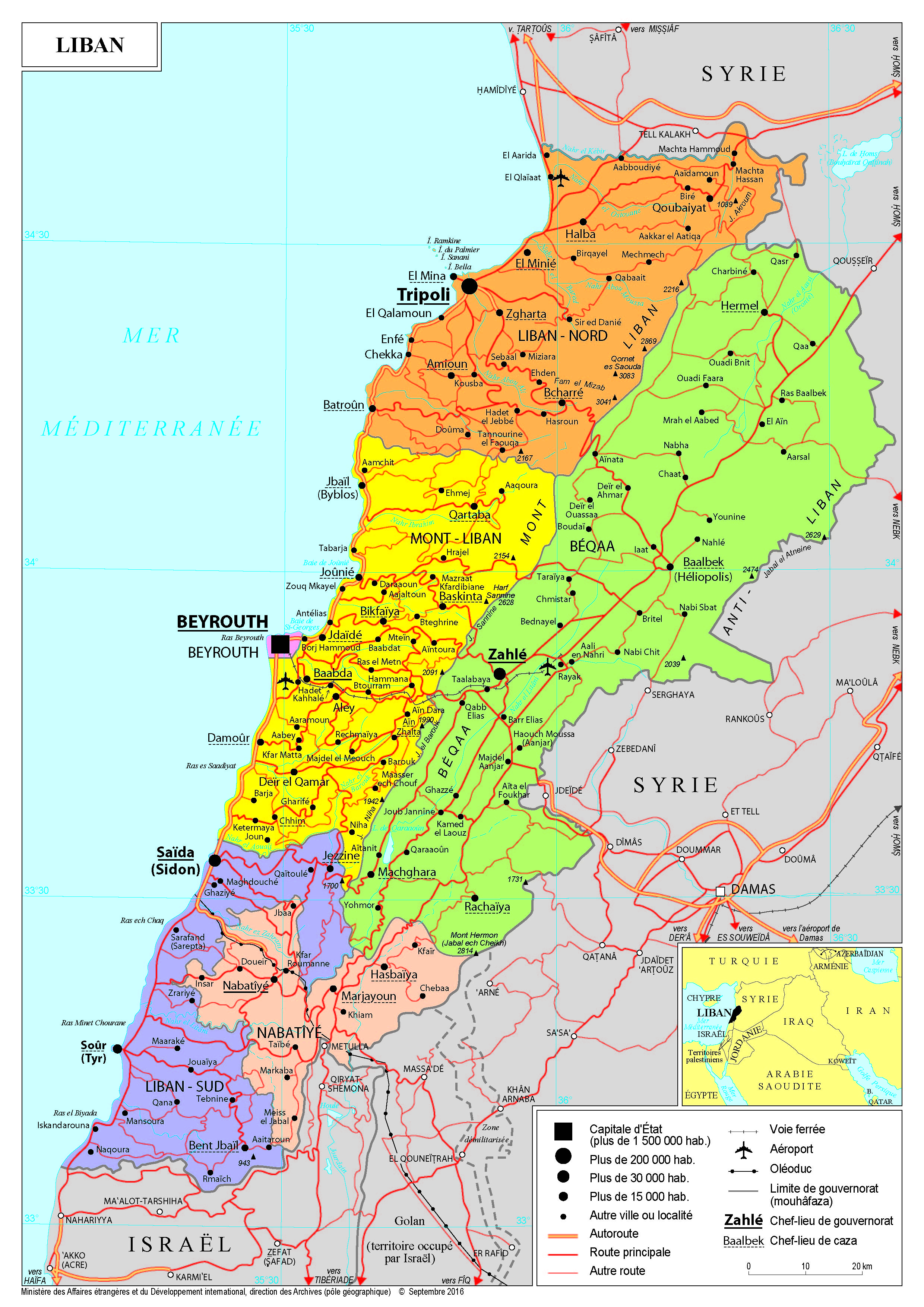 Liban Navigation latérale fiche pays Dans cette rubrique Liban Présentation du Liban Conseils aux voyageurs Dernières minutes et alertes Sécurité Entrée / séjour Santé Informations utiles Voyages d'affaires Contacts utiles Politique et économie Relations bilatérales Présentation du Liban Date de mise à jour le : 02 avril 2026 Information toujours valable à la date du jour Présentation du pays Données générales Nom officiel : République libanaiseNature du régime : République parlementaireChef de l’État : M. Michel Aoun (depuis le 31 octobre 2016) - Président du conseil des ministres : M. Najib Mikati (depuis le 10 septembre 2021) - Président du Parlement : M. Nabih Berry (depuis 1992) Données géographiques Superficie : 10.452 km²Capitale : BeyrouthVilles principales : Tripoli, Saïda, Tyr, ZahléLangue officielle : arabe (depuis 1943), statut particulier du français (langue de l’administration, large réseau d’établissements scolaires et universitaires francophones, membre de la Francophonie)Langues courantes : arabe libanais, français, anglaisMonnaie : livre libanaise (1 USD = 1512,9 LL)Fête nationale : fête de l’indépendance, 22 novembre Données démographiques Population (évaluation en l’absence de recensement depuis 1932) (2016) : 4,6 millions dont 174 222 réfugiés palestiniens enregistrés par l’UNRWA929 624 réfugiés syriens comptabilisés par le HCR et 50 000 Palestiniens de Syrie comptabilisés par l’UNRWADensité : 597 hab/km²Indice synthétique de fécondité : 2,1Espérance de vie : 76,7 ansTaux d’alphabétisation : 93,5 %Répartition par communautés confessionnelles (recensements électoraux 2005) : chiites (31%), sunnites (29%), druzes (5%), chrétiens maronites (20%), grecs-orthodoxes et autres catholiques (12%), Arméniens (3%)IDH : 0,791 Politique intérieure Le Liban est une République parlementaire. Le président de la République est chrétien maronite, le président du Conseil des ministres est sunnite et le président du Parlement un chiite. Le système législatif libanais est unicaméral. L’Assemblée nationale comprend 128 députés élus pour quatre ans. Les sièges sont répartis à parité sur une base confessionnelle (64 chrétiens, 64 musulmans).Du 25 mai 2014 (fin du mandat de Michel Sleiman) au 31 octobre 2016 (élection de Michel Aoun) le Liban a connu une période de vacance présidentielle. Durant plus de deux ans, les pouvoirs du président ont été transférés au gouvernement d’entente nationale de Tammam Salam. L’élection de Michel Aoun à la présidence de la République a constitué la première étape d’un processus de remise en marche des institutions libanaises. Le 18 décembre 2016, un gouvernement a été formé par le Premier ministre Saad Hariri. Des élections législatives ont eu lieu le 6 mai 2018 et ont permis au Parlement de se renouveler et donné la majorité à une alliance du Courant du Futur (souverainiste) avec le bloc composé du Hezbollah, du Courant Patriotique Libre (aouniste) du mouvement Amal. Le 31 janvier 2019, un nouveau gouvernement a été formé par Saad Hariri (Courant du Futur). Le 29 octobre 2019, confronté à un important mouvement de contestation, le Premier ministre Saad Hariri a remis sa démission au Président Michel Aoun. Son gouvernement a été chargé d’expédier les affaires courantes. La grave explosion qui a endeuillé Beyrouth le 4 août 2020 a conduit son successeur, Hassan Diab (désigné le 19 décembre 2019) à remettre à son tour sa démission le 10 août 2020 face à l’accumulation des critiques. Le 10 septembre 2021, après plus d’un an de tractations, Najib Mikati est parvenu à former un gouvernement. La communauté internationale comme la population libanaise continuent néanmoins d’attendre des autorités libanaises que celles-ci mettent en œuvre les réformes économiques nécessaires, y compris en lien avec le FMI. Les affrontements armés du 14 octobre 2021 à Beyrouth ont néanmoins démontré l’instabilité de la situation, dans un contexte d’opposition des partis au bon déroulé de l’enquête sur l’explosion du 4 août dans le port. Les partis d’opposition ainsi que la société civile se tournent à présent vers les échéances électorales de 2022 (législatives au printemps, présidentielles à l’automne), dont la tenue devra néanmoins être confirmée. Politique étrangère La politique extérieure du Liban est largement contrainte par l’évolution des équilibres régionaux et par les crises qui secouent ses voisins immédiats, et ce en dépit de la fin de la tutelle syrienne en 2005. Le Liban maintient son Ambassade à Damas et n’a pas rompu les relations diplomatiques avec le régime syrien. Les États arabes du Golfe constituent un appui traditionnel du Liban. Une partie de la classe politique libanaise entretient historiquement des relations denses avec l’Arabie Saoudite et ses voisins. Les relations entre le Liban et les capitales arabes du Golfe sont néanmoins rendues difficiles par la présence du Hezbollah sur la scène politique libanaise et les alliances nouées avec plusieurs autres partis. Le Liban est toujours formellement en guerre avec Israël et aucun cessez-le-feu permanent n’a été conclu entre les deux pays qui ont toutefois cessé leurs hostilités, en application de la résolution du conseil de sécurité des Nations unies 1701 d’août 2006. Depuis la guerre de 2006, les tensions avec Israël, au sud du Liban, restent présentes. Concernant le processus de paix, la position officielle du Liban se décline en plusieurs points : soutien à un État palestinien indépendant avec Jérusalem pour capitale, appel à des mesures contraignantes pour qu’Israël respecte ses obligations internationales, demande d’un retour des réfugiés palestiniens du Liban. Le Liban est un membre assidu et actif de la Francophonie multilatérale dont le président Charles Hélou