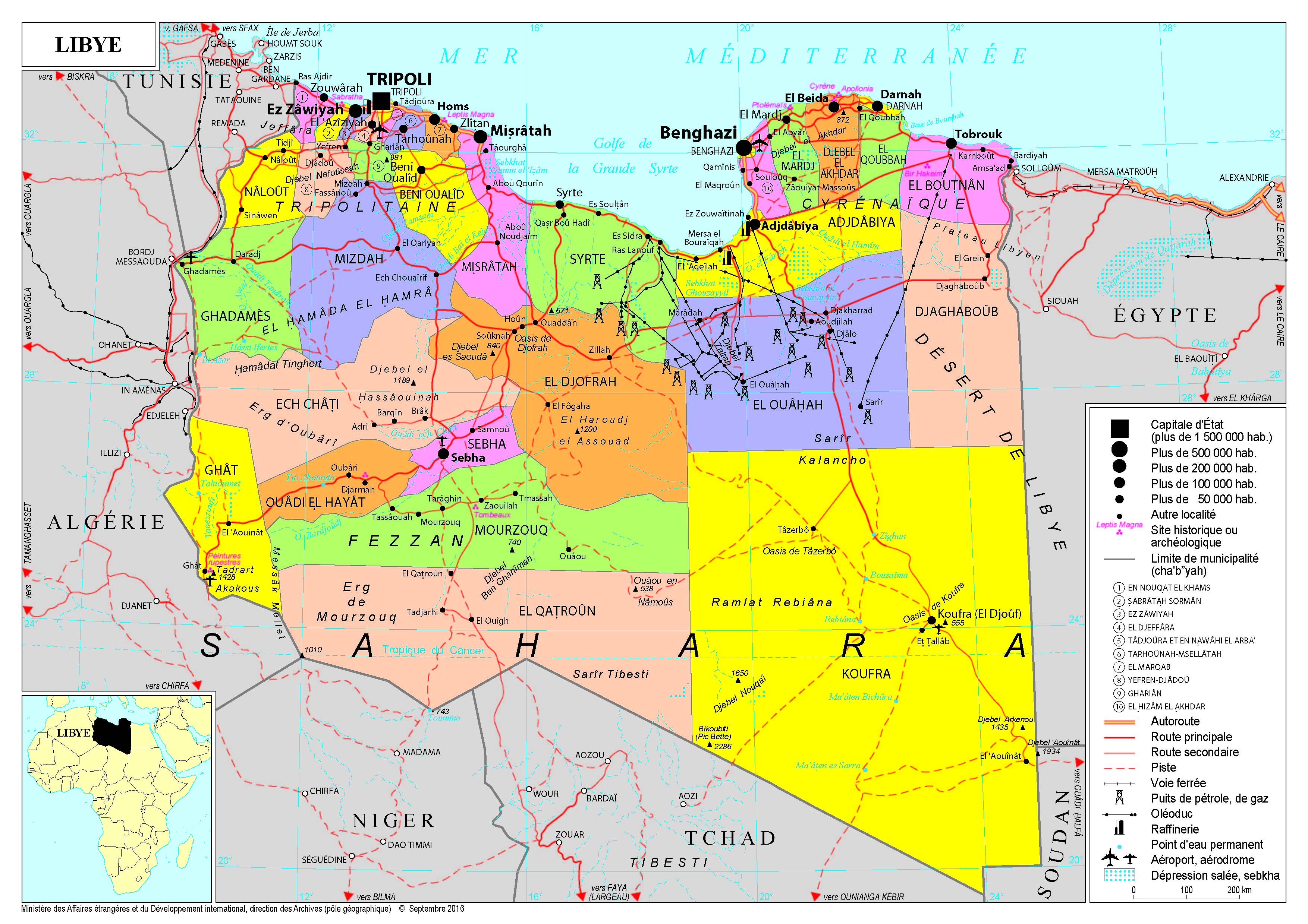 Libye Navigation latérale fiche pays Dans cette rubrique Libye Présentation de la Libye Conseils aux voyageurs Dernières minutes et alertes Sécurité Entrée / séjour Santé Informations utiles Voyages d'affaires Contacts utiles Politique et économie Relations bilatérales Présentation de la Libye Date de mise à jour le : 02 avril 2026 Information toujours valable à la date du jour Présentation du pays Données générales Nom officiel : État de Libye (dans l’attente de l’adoption d’une Constitution)Nature du régime : Parlementaire (Déclaration constitutionnelle transitoire d’août 2011 et Accord de Skhirat de 2015)Chef de l’État : M. Mohamed Al-Menfi, président du Conseil présidentiel depuis février 2021 (Accords de Genève) Données géographiques Superficie : 1 759 500 km²Capitale : TripoliVilles principales : Tripoli, Benghazi, Misrata, SebhaLangue (s) officielle (s) : ArabeLangue (s) courante (s) : Arabe dialectal, langues berbères, langues toubouMonnaie : Dinar libyen (LYD) 1€ = 5,26 LYD (10/09/2024 au taux officiel)Fête nationale : Fête de l’indépendance le 24 juillet, anniversaire de la Révolution de 2011, le 17 février ; anniversaire de la proclamation de la libération de 2011, le 23 octobre. Données démographiques Population : 6 888 388 (2023, Banque Mondiale)Densité : 4 hab./km2 (2021, Banque Mondiale)Croissance démographique : 1,1% (2023, Banque Mondiale)Espérance de vie : 72 ans (2022, Banque Mondiale)Taux d’alphabétisation : 89,9% (2014, PNUD)Religion (s) : Islam sunnite (97 %), autres (3 %)Indice de développement humain (2023) : 0,746 (PNUD) 92ème place sur 192 pays Politique intérieure La révolution libyenne dans le contexte des printemps arabes en 2011 a mis fin au régime de Mouammar Kadhafi après quarante-deux ans au pouvoir. Les premières élections libyennes libres en 2012, puis en 2014, ont finalement conduit à une guerre civile et à la division des institutions libyennes, avec des autorités concurrentes à l’Est et à l’Ouest de la Libye. Le processus de réconciliation, lancé sous l’égide des Nations Unies, a abouti à un accord politique en décembre 2015 à Skhirat (Maroc), ouvrant une nouvelle période de transition caractérisée par la formation d’un nouveau gouvernement et la création de nouvelles institutions politiques. Toutefois, en l’absence de progrès quant à la réunification politique, de nouveaux affrontements sont survenus en 2019, dans le cadre d’une offensive du commandant de l’Armée nationale libyenne (ANL), le maréchal Khalifa Haftar, pour prendre le contrôle de la capitale. Les hostilités, auxquelles ont pris part des contingents turcs, aux côtés du Premier ministre Fayez Al-Sarraj à l’Ouest, et des mercenaires russes de Wagner, aux côtés de l’ANL à l’Est, se sont poursuivies avant la stabilisation de la ligne de front en juin 2020 et la signature d’un accord de cessez-le-feu le 23 octobre 2020 sous l’égide des Nations Unies. Le cessez-le-feu est toujours respecté à ce jour. Le Forum de dialogue politique libyen (LPDF), organisé à Genève par les Nations Unies fin 2020, a permis la désignation de Mohamed Al-Menfi comme président du Conseil présidentiel et d’Abdelhamid Dbeiba comme Premier ministre du nouveau Gouvernement d’unité nationale (GUN), dont le mandat était d’assurer la tenue d’élections présidentielle et parlementaires le 24 décembre 2021.Après le report sine die des élections en décembre 2021, la Chambre des représentants (CdR) a retiré sa confiance au Premier ministre du GUN Abdelhamid Dbeiba. Elle a désigné en mars 2022 un gouvernement, le Gouvernement de stabilité nationale (GSN) dirigé par Fathi Bachagha – remplacé en mai 2023 par Oussama Hammad. Ce gouvernement n’est toutefois pas parvenu à s’installer dans la capitale et n’est pas reconnu par la communauté internationale. Le GUN se maintient au pouvoir malgré l’expiration, en juin 2022, de la feuille de route qui encadrait son mandat. La médiation onusienne vise à relancer le processus politique et à organiser les élections au plus tôt. Le 24 janvier 2025, l’ex-ministre des Affaires étrangères du Ghana et ancienne Représentante spéciale du Secrétaire général des Nations Unies (RSSGNU) pour la Corne de l’Afrique, Hannah Tetteh, a été nommée RSSGNU pour la Libye. Cette nomination a mis fin à une période de vacance de dix mois à la tête de la Mission d’appui des Nations Unies en Libye (MANUL) consécutive à la démission d’Abdoulaye Bathily en avril 2024. Politique étrangère Pays pétrolier pourvu d’un territoire grand comme trois fois la France et d’une population ne dépassant pas les 7 millions d’habitants, la Libye dispose de l’un des PIB/habitant les plus élevés d’Afrique (7ème après les Seychelles, l’île Maurice, le Gabon, le Botswana, la Guinée équatoriale et l’Afrique du Sud). La situation économique de la Libye, où les hydrocarbures représentent les deux tiers du PIB et 97% des revenus de l’État, est particulièrement volatile. L’économie du pays, très peu diversifiée, est ainsi tributaire du cours du baril, mais également de la situation sécuritaire et de l’évolution de la fragmentation politico-institutionnelle qui influent sur le niveau de production pétrolière. La capacité de production du pays (1,2 Mb/j) permet en théorie des revenus confortables. Mono-productrice, la Libye importe la quasi-totalité de ses besoins.Après une année 2022 rythmée par des blocages pétroliers (avril-juillet) et la hausse des recettes portée par des cours internationaux élevés, l’économie libyenne a connu un semblant de stabilité en 2023 grâce à une production pétrolière maintenue à 1,2 Mb/j. En 2023, la croissance est repartie à la hausse malgré la modération du prix du baril (+10,2% selon le FMI) après une chute en 2022 (-8,3%). Pour 2024, la Banque mondiale fai