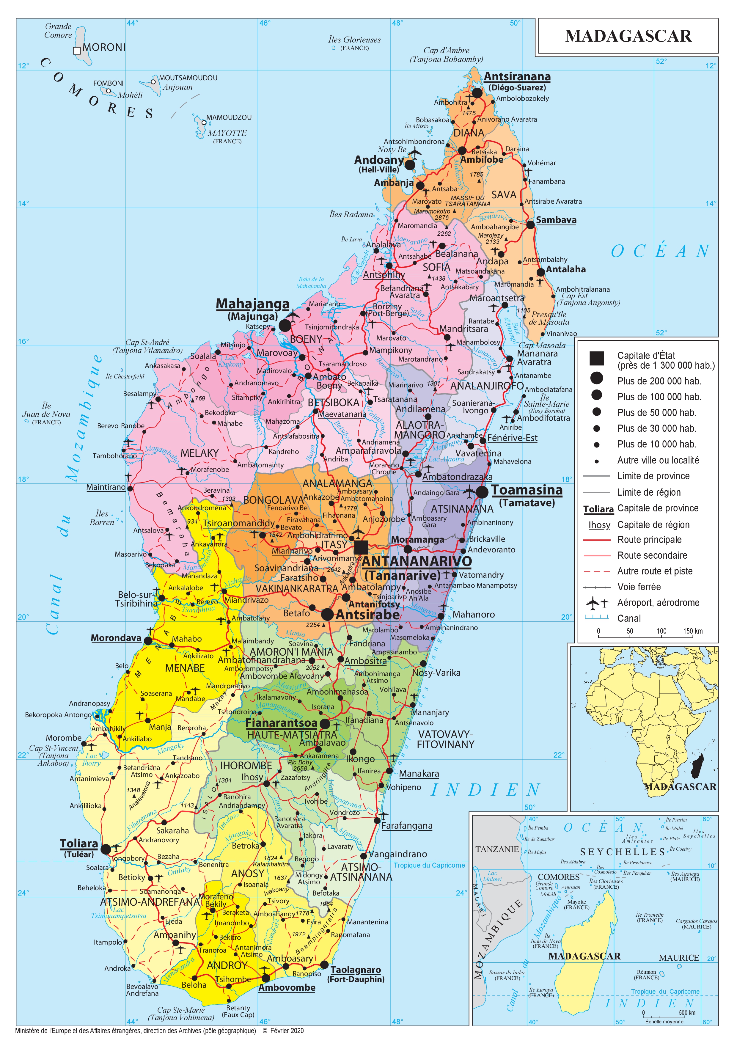 Madagascar Navigation latérale fiche pays Dans cette rubrique Madagascar Présentation de Madagascar Conseils aux voyageurs Dernières minutes et alertes Sécurité Entrée / séjour Santé Informations utiles Voyages d'affaires Contacts utiles Politique et économie Relations bilatérales Présentation de Madagascar Date de mise à jour le : 02 avril 2026 Information toujours valable à la date du jour Présentation du pays Données générales Nom officiel : République de MadagascarNature du régime : présidentielChef de l’État : Andry RAJOELINA, réélu en novembre 2023 Données géographiques Superficie : 587 040 km²Capitale : TananariveVilles principales : Tananarive, Tamatave, Antsirabe, Fianarantsoa, Majunga, Tuléar, Diego-SuarezLangues officielles : malgache, françaisLangues courantes : malgache, françaisMonnaie : ariary (1 € = 4 975 ariary au 15/01/2024)Fête nationale : 26 juin (indépendance en 1960) Données démographiques Population : 29,61 millions d’habitants en 2022 (Banque mondiale)Densité : 50 habitants/km² en 2021 (Banque mondiale)Croissance démographique : 2,4 % en 2022 (Banque mondiale)Espérance de vie à la naissance : 64 ans en 2021 (Banque mondiale)Taux d’alphabétisation (total adultes) : 77 % en 2022 (Banque mondiale)Indice de développement humain : 173e sur 191 pays en 2021 (PNUD) Politique intérieure La dernière élection présidentielle s’est tenue le 16 novembre 2023. Les résultats officiels ont été proclamés le 1er décembre et ont consacré la réélection dès le premier tour du chef de l’État sortant Andry Rajoelina, avec près de 59 % des suffrages exprimés et un taux de participation de 46 %. Ainsi que l’ont souligné les différentes missions d’observation internationales, aucun incident majeur n’a été relevé le jour du vote en dépit d’un contexte de défiance entre l’exécutif et l’opposition, qui avait quasi-unanimement appelé au boycott du scrutin. Un nouveau gouvernement a été nommé le 14 janvier 2024 ; il demeure dirigé par Christian Ntsay, Premier ministre depuis 2018. Des élections législatives et communales sont prévues au premier semestre 2024. Politique étrangère Madagascar fait partie de plusieurs organisations régionales et internationales : la Commission de l’océan Indien (COI), dont elle a assuré la présidence entre février 2022 et mai 2023, la SADC (Southern African Development Community - Communauté de développement d’Afrique australe), l’IORA (Indian Ocean Rim Association - Association des États riverains de l’océan Indien), l’Union africaine, le COMESA (Common Market for Eastern and Southern Africa - le Marché commun de l’Afrique orientale et australe) et l’Organisation internationale de la Francophonie (OIF). Situation économique PIB (2022) : 15,3 milliards USD (Banque mondiale)PIB par habitant (2022) : 517 USD (Banque mondiale)Croissance du PIB (2022) : + 3,8 % (Banque mondiale)Inflation (2022) : + 8,2 % (Banque mondiale)Principaux clients (en 2022) : États-Unis, Chine, FrancePrincipaux fournisseurs (en 2022) : Chine, Inde, Émirats arabes unis Avec un PIB par habitant de 517 USD en 2022, Madagascar fait partie des pays les moins avancés ; les inégalités sociales (plus de 80 % de la population vivent en dessous du seuil d’extrême pauvreté de 1,90 USD par jour) et géographiques (80 % de la population vivent en zone rurale, parfois très enclavée) sont prononcées. La croissance économique demeure modeste (+ 4 % prévu pour 2023), en raison notamment des conséquences de l’invasion russe de l’Ukraine. Liste des représentations françaises Ambassade de France à Madagascar 3, rue Jean-Jaurès - Ambatomena BP 204 101 Antananarivo Madagascar Tel : (+261) 20 22 398 98 Ambassade de France à Madagascar Réseaux sociaux Facebook X Consulat général de France à Antananarivo 3, rue Jean-Jaurès - Ambatomena BP 897 101 Antananarivo Madagascar Tel : (+33) 3 59 39 70 32 Consulat général de France à Antananarivo Réseaux sociaux Facebook X