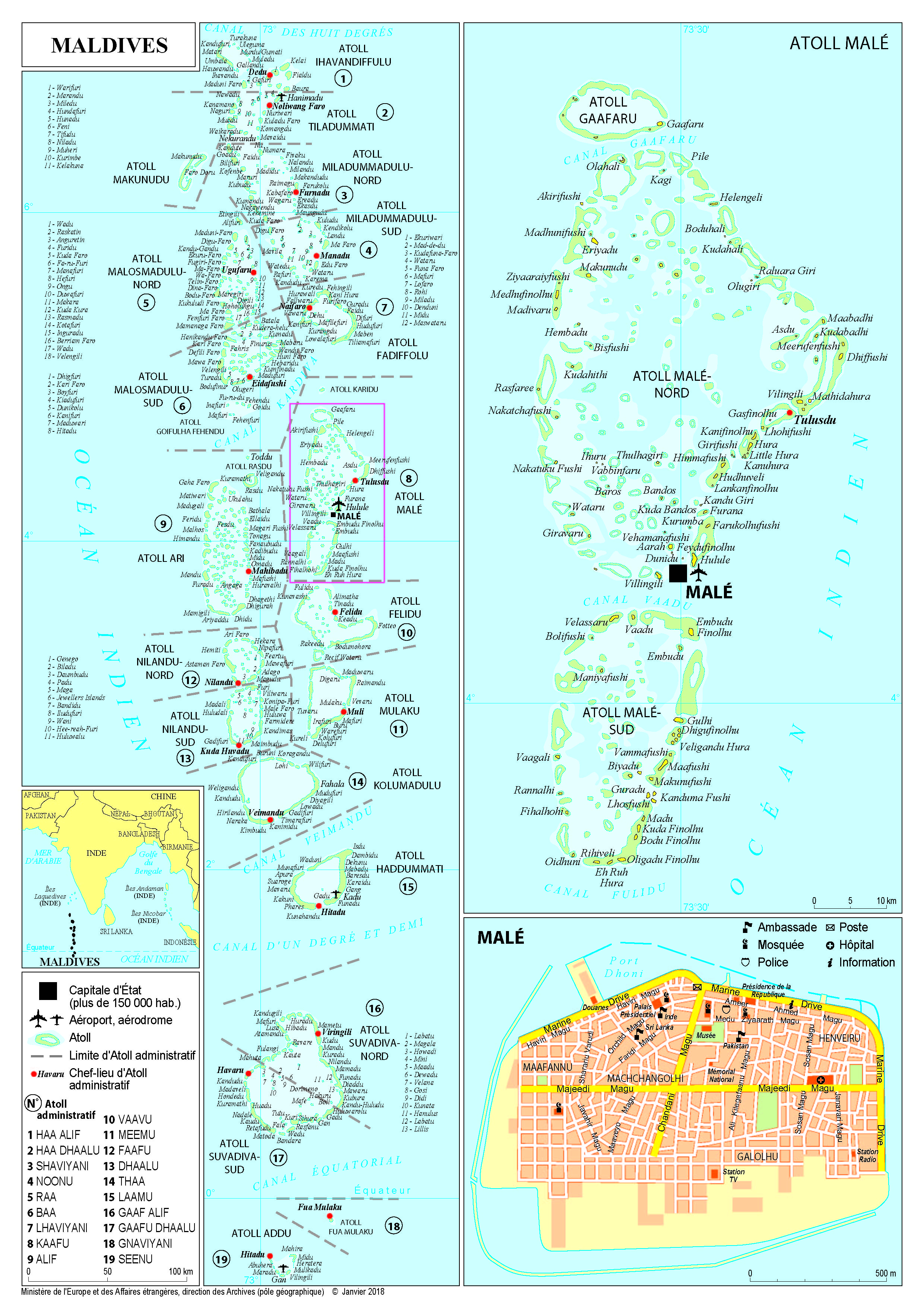 Maldives Navigation latérale fiche pays Dans cette rubrique Maldives Présentation des Maldives Conseils aux voyageurs Dernières minutes et alertes Sécurité Entrée / séjour Santé Informations utiles Voyages d'affaires Contacts utiles Politique et économie Relations bilatérales Présentation des Maldives Date de mise à jour le : 02 avril 2026 Information toujours valable à la date du jour Présentation du pays Données générales Nom officiel : République des MaldivesNature du régime : présidentielChef de l’État : M. Mohamed Muizzu (depuis le 17/11/2023). Données géographiques Superficie : 298 km², 200 îlots habités sur 1 200, regroupés en 19 atolls administratifs.Capitale : Malé.Langue officielle : le divehi.Langue courante : le divehi et l’anglais, couramment utilisé dans les administrations et le secteur hôtelier.Fête nationale : 26 juillet (Fête de l’Indépendance, acquise en 1965). Données démographiques Population : 524 000 (Banque mondiale, 2022).Densité : 1 720 hab/km². Malé compte 215 000 habitants pour une superficie de 5,7 km² (dont un tiers a été conquis sur la mer).Croissance démographique : +0,4% (2012, BM).Espérance de vie : 80 ans (2021, BM).Taux d’alphabétisation (Banque mondiale, 2021) : 98%.Religions : 99% islam sunnite (religion d’Etat qui s’impose à tous les Maldiviens depuis 1997) et 1% de chrétiens et de bouddhistes (résidents étrangers).Indice de développement humain : 0,740 (95ème sur 188 pays, PNUD, 2019). Politique intérieure Le président de la République des Maldives, Mohamed Muizzu, a pris ses fonctions en novembre 2023. Il dispose d’une majorité au sein de l’Assemblée nationale, le Conseil du peuple (Majlis), depuis les élections parlementaires du 21 avril 2024. Son parti, le Congrès national du peuple, a obtenu 68 sièges sur les 93 que compte le Majlis. Le principal parti d’opposition est le Parti démocrate maldivien, qui dispose de 10 sièges au Majlis.A l’occasion de sa prise de fonction, Mohamed Muizzu s’est engagé à relancer l’économie, affectée par les conséquences de la pandémie de Covid-19, en misant sur le secteur du tourisme. Il s’est aussi engagé à répondre aux enjeux liés à l’environnement, à l’emploi et aux problématiques de logement. Politique étrangère Le président Mohammed Muizzu a été élu en septembre 2023 à la suite d’une campagne « pro-Maldives » qui s’est traduite par une prise de distance vis-à-vis de l’allié traditionnel indien (fin de la présence militaire indienne) et un rapprochement avec la Chine. Le président M. Muizzu y a effectué sa première visite d’État en janvier 2024., durant laquelle 20 accords ont été signés, dont un protocole d’entente concernant la dette bilatérale des Maldives. Un accord de défense a également été conclu avec la Chine en mars 2024. Du fait de la situation géographique des Maldives et de la structure du territoire, rendant l’archipel particulièrement vulnérable au changement climatique, les autorités maldiviennes appellent à davantage de mobilisation de la communauté internationale, notamment sur la question de l’adaptation. Lors de la COP28, le président Muizzu a exhorté la communauté internationale à renforcer l’action climatique en vue d’accroître la résilience. Situation économique Après une forte récession du produit intérieur brut ou PIB en 2020 (-29,3%) liée à la pandémie de Covid-19, des signes de reprise de l’activité sont visibles (37% de croissance en 2021 et 13,9% en 2022, d’après le Banque mondiale) avec un retour massif du tourisme (1,8 million en 2023), principale source de revenu de l’archipel, notamment en provenance d’Europe (75% des flux). Cependant, malgré ce contexte de rebond de l’activité touristique, l’économie maldivienne reste vulnérable à moyen terme. En effet, le volume de la dette atteint 110,4% du PIB en 2022, dont 45% de dette extérieure et 55% de dette domestique. Le taux d’endettement est en baisse par rapport à 2021 (120% du PIB), mais reste très élevé par rapport à la période pré-Covid (78,8% en 2019) du fait notamment d’une augmentation du déficit budgétaire lié à la hausse des dépenses publiques (5,94 Mds USD en 2022). Les Maldives sont classées 161ème en termes de PIB (5,5 md USD, 2022, FMI) avec un PIB/hab élevé (14 000 USD/an, 2022, FMI). Outre le tourisme, 1/5 de la main d’œuvre de l’archipel travaille dans le secteur de la pêche qui constitue 1/6 du PIB. Bien que l’industrialisation se développe, l’artisanat reste majoritaire. Liste des représentations françaises Consulat honoraire de France à Malé Consul honoraire (anglophone) : Mme Fathimath Zuraig Mohamed 5ème étage, H.Aagadhage, Boduthakurufaanu Magu Malé Maldives Tel : +960 966 66 69 La France à Sri Lanka et aux Maldives Réseaux sociaux Ambassade de France à Sri Lanka et aux Maldives French Embassy in Colombo