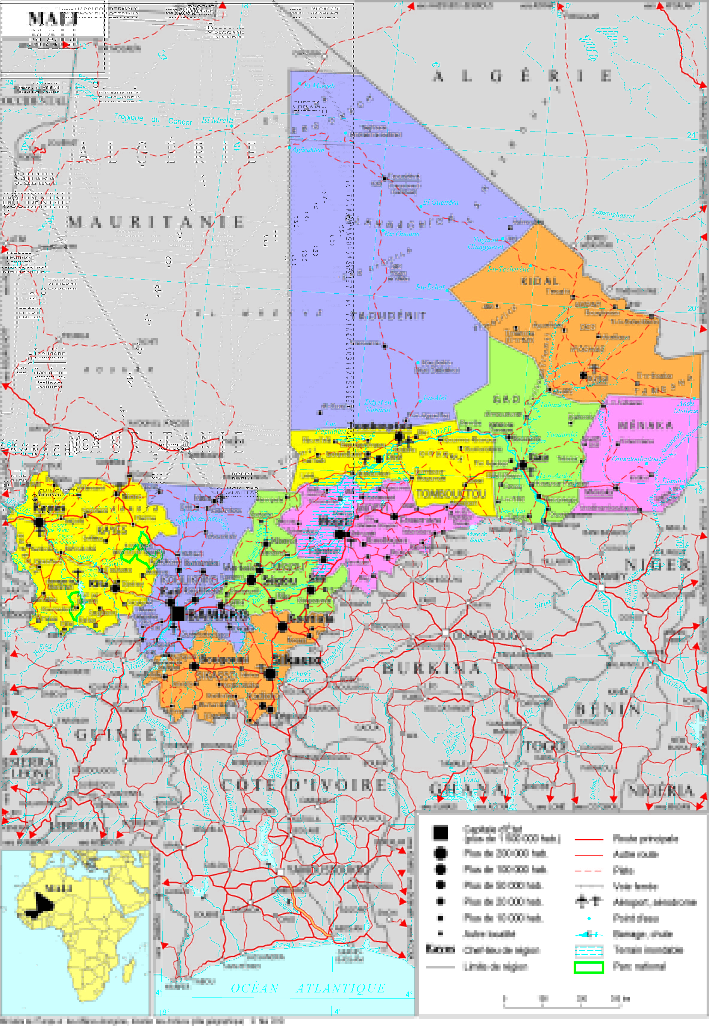 Mali Navigation latérale fiche pays Dans cette rubrique Mali Présentation du Mali Conseils aux voyageurs Dernières minutes et alertes Sécurité Entrée / séjour Santé Informations utiles Voyages d'affaires Contacts utiles Politique et économie Relations bilatérales Présentation du Mali Date de mise à jour le : 02 avril 2026 Information toujours valable à la date du jour Présentation du pays Données générales Nom officiel : République du MaliNature du régime : Régime de transitionPrésident de la transition : Assimi Goïta Données géographiques Superficie : 1 241 231 km²Capitale : Bamako (2 529 300 habitants)Villes principales : Sikasso, Mopti, Koutiala, Ségou, Kayes, GaoLangue de travail : françaisLangues courantes : mandingue (bambara, malinké, dioula), tamasheq, poular, senoufo, bobo, songhaïMonnaie : franc CFAFête nationale : 22 septembre (indépendance en 1960) Données démographiques Population : 22 395 485 habitants (Institut national de la statistique malien 2023)Croissance démographique annuelle : 3,3 % (Institut national de la statistique malien 2023) Espérance de vie : 61 (F), 59 (H) (à la naissance, ONU 2023)Religions : islam 94,8 %, christianisme 2,4 %, animisme 2 % (recensement de 2009)Indice de développement humain : 188e sur 193 pays (PNUD, 2023) Politique intérieure Le Mali a connu deux coups d’Etat (18 août 2020 et du 24 mai 2021) perpétrés par cinq colonels (dont le colonel Assimi Goïta, président de la transition). La transition malienne, qui devait initialement s’achever en 2022 en accord avec la CEDEAO, s’est vue prolonger à plusieurs reprises. Une première prolongation de la durée de la transition repoussant les élections présidentielles à février 2024 avait fait l’objet, en juillet 2022 d’un compromis avec la CEDEAO qui avait levé les sanctions économiques et financières qu’elle avait prises contre le Mali en janvier 2022. La fin de la transition a alors été fixée au 26 mars 2024. Un référendum constitutionnel s’est tenu le 18 juin 2023, ayant abouti à la promulgation, le 22 juillet 2023, de la Constitution de la 4ème République du Mali.Les autorités maliennes ont annoncé le 25 septembre 2023 le report de l’élection présidentielle initialement prévue les 4 et 18 février 2024. Les autres échéances électorales annoncées (élections locales en juin 2023 ; élections législatives à l’automne 2023) ont été annulées.L’échéance du 26 mars 2024 est passée sans qu’un nouveau calendrier ne soit annoncé. La crise malienne, telle qu’elle est aujourd’hui, découle également de la prise du contrôle du nord du pays par des groupes indépendantistes ainsi que des groupes djihadistes de 2012 à 2013 et du coup d’État de mars 2012. Elle avait alors suscité une mobilisation importante de la France et des partenaires internationaux du Mali dans tous les domaines (sécurité, stabilisation, développement, humanitaire). Sur le plan politique, la signature de l’Accord pour la paix et la réconciliation au Mali issu du processus d’Alger, en 2015 avait constitué une avancée positive, mais des difficultés importantes ont entravé sa mise en œuvre en dépit des efforts d’appui de la médiation internationale, présidée par l’Algérie. Le 25 janvier 2024, le Mali a mis fin à l’Accord d’Alger. Sur le plan sécuritaire, la menace posée par les groupes djihadistes s’est progressivement étendue vers le centre et le sud du pays, où ils s’attaquent aux symboles et aux représentants de l’Etat ainsi qu’aux populations civiles. L’opération Barkhane s’est définitivement retirée du Mali le 15 août 2022 (tout comme la Task Force européenne Takuba) et la fin officielle de l’opération a été annoncée par le Président de la République française le 9 novembre 2022. Le départ de la MINUSMA, demandé par les autorités maliennes de transition, s’est achevé le 31 décembre 2023. Politique étrangère Entouré de sept voisins, le Mali a historiquement développé une diplomatie favorisant l’intégration régionale et continentale mais s’est récemment retiré ou vu suspendu de plusieurs organisations régionales. Membre fondateur de l’Union économique et monétaire ouest-africaine (UEMOA) et de la Communauté économique des États de l’Afrique de l’Ouest (CEDEAO), il a été le premier pays à ratifier l’Acte constitutif de l’Union africaine en 2000. Il est également membre du comité de mise en œuvre du Nouveau Partenariat pour le développement de l’Afrique (NEPAD), de la Communauté des États sahélo-sahariens (CEN-SAD) et de l’Organisation internationale de la Francophonie. Suite aux coups d’Etat de 2020 et 2021, le Mali a été suspendu de la CEDEAO, de l’Union africaine et de l’Organisation internationale de la Francophonie. En mai 2022, le Mali a annoncé son retrait du G5 Sahel, dont il était un membre fondateur. Le Mali s’est rapproché du Burkina Faso et du Niger en constituant le 16 septembre 2023 l’Alliance des Etats du Sahel, qui s’est muée en confédération le 6 juillet dernier. Le 28 janvier 2024, par un communiqué conjoint, les trois pays ont annoncé leur retrait de la CEDEAO. Des personnalités maliennes de premier plan ont exercé un rôle important à la tête d’organisations clés : l’ancien chef de l’État Alpha Oumar Konaré à la présidence de la Commission de l’Union africaine (2003-2008), Soumaïla Cissé à la tête de la Commission de l’UEMOA (2004-2011), Michel Sidibé comme directeur exécutif d’ONUSIDA (2008-2019), Adama Ouane comme administrateur de l’Organisation internationale de la Francophonie (2015-2019) et Modibo Ibrahima Touré comme Représentant spécial et Chef du bureau intégré des Nations unies en Guinée-Bissau (depuis mai 2016). Situation économique PIB : 18,8 milliards USD (Banque Mondiale, 2022)PIB par habitant : 833,3 dollars US (Banque Mondiale, 2022) 