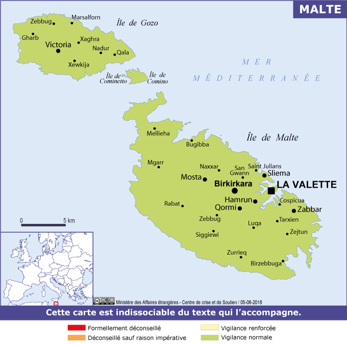 Malte Navigation latérale fiche pays Dans cette rubrique Malte Présentation de Malte Conseils aux voyageurs Dernières minutes et alertes Sécurité Entrée / séjour Santé Informations utiles Voyages d'affaires Contacts utiles Politique et économie Relations bilatérales Sécurité Date de mise à jour le : 15 avril 2026 Information toujours valable à la date du jour Imprimer Imprimer Vous voyagez à l'étranger ? Pour recevoir des alertes, inscrivez-vous sur Fil d'Ariane. S'inscrire sur Fil d'Ariane Donnez-nous votre avis Aidez-nous à améliorer notre service en répondant à notre enquête. Répondre à l'enquête utilisateurs Fermer Vérifiez que vous êtes bien assurés Avant de voyager, il est indispensable de vérifier que vous êtes bien assuré Quelle est la portée des Conseils aux Voyageurs ? Zones de vigilance Dernière actualisation le 11/03/2026, information toujours valable à la date du jour L’ensemble du territoire est en vigilance normale. Une vigilance particulière est recommandée dans le quartier de Paceville, au nord de la ville de Saint Julians, qui concentre l’activité nocturne de l’île, dans les bus de la ligne 1 (13, 14, 15, 16) qui le desservent et sur les bateaux de tourisme, en particulier lors de croisières festives et/ou nocturnes. En cas de tempête Les recommandations d’usage s’imposent : Ne pas se tenir près du rivage, y compris sur les promenades en bord de mer dans les villes côtières ; Ne pas circuler sur des routes bordées d’arbres (chutes d’arbres fréquentes en cas de vents violents) ; Consulter le site internet du ferry reliant Gozo à Cirkewwa (Malte) ainsi que celui reliant directement la Valette à Gozo pour s’assurer qu’il n’est pas prévu de perturbations du service en cas de mauvais temps Délinquance Des pickpockets sont susceptibles d’agir dans les transports et certains lieux publics à forte présence touristique (Paceville notamment). Des vols avec effraction dans les chambres d’hôtel ou les appartements de tourisme ont également été rapportés. Des agressions peuvent se produire dans les lieux à forte fréquentation touristique. Plusieurs plaintes pour agressions sexuelles ont aussi été recensées Dans ces conditions, la plus grande vigilance est naturellement de mise. En outre, des cas d’escroqueries locatives sont régulièrement rapportés, en particulier lors de réservation et de prépaiement de logement par internet (inexistence du logement à l’arrivée ou informations trompeuses). Il est très fortement recommandé là aussi d’être vigilants et d’aller vers des sites référencés ayant une solide réputation européenne et internationale, plutôt que via des annonces sur les réseaux sociaux, notamment Facebook, et de ne payer que des arrhes et non la totalité avant d’entrer en possession des clés du logement. Des produits stupéfiants de divers types peuvent circuler dans les bars et les établissements de nuit, y compris dans des boissons à l’insu des consommateurs, notamment dans la zone de Paceville/San Julians. Pour rappel, la consommation sur la voie publique de produits stupéfiants est strictement interdite et passible d’une amende et d’une peine de prison. Incivilités sur la voie publique : il est fortement conseillé de respecter les règles locales et de faire preuve de retenue dans l’espace public. En cas de problème, ne pas hésiter à se rendre au poste de police de votre lieu de séjour/résidence. Risque sismique Malte est située sur la faille de Pantelleria et à proximité de zones d’activité volcanique (sud de l’Italie, Sicile notamment). L’archipel maltais est occasionnellement soumis à des secousses telluriques, généralement de faible intensité (moins de 5 sur l’échelle de Richter). En cas de tremblement de terre lors d’un séjour touristique, il est recommandé d’entrer immédiatement en contact avec sa famille ou ses proches afin de les rassurer, ou, en cas de problème de communication avec l’extérieur, avec l’ambassade de France.Ne pas oublier que les communications sont, dans ce type de circonstances, rapidement saturées. En cas de séisme, il est recommandé de s’éloigner des zones côtières (risque de raz-de-marée). Consulter la fiche Séismes. Recommandations générales Il est recommandé de : laisser ses documents de voyage dans un endroit sûr et de ne sortir qu’avec des photocopies ; ne pas porter sur soi d’importantes sommes d’argent ; ne pas laisser d’effets personnels sans surveillance dans les lieux les plus fréquentés (en particulier les magasins et marchés de La Valette ou de Marsaxlokk, les plages, bars et boîtes de nuit de Sliema, Saint Julians et Paceville ou dans les voitures en stationnement) ; disposer d’une assurance couvrant les risques de vol. Activités sportives à risque Baignades Chaque année, plusieurs cas de noyade sont signalés à Malte, notamment dans la zone très fréquentée du Blue Lagoon, chenal situé entre les îles de Comino et Cominetto et dans lequel s’engouffrent de forts courants tournants.Il est recommandé de s’assurer que la baignade est surveillée et de consulter les drapeaux de sécurité : vert : eaux calmes ; jaune : risque modéré ; rouge : risques élevés, forts courants ; bleu/violet : présence d’organismes toxiques. Navigation de plaisance L’état de la mer, comme partout en Méditerranée, peut changer très rapidement. Il est donc indispensable de se renseigner sur les conditions météorologiques avant chaque sortie. Plongée Il est recommandé de ne pratiquer la plongée sous-marine qu’en compagnie de moniteurs certifiés, après avoir vérifié la fiabilité des équipements utilisés. Liste des représentations françaises Ambassade de France à Malte 130 Melita Street - Valetta VLT 1123 La Valette VLT 1123 Malte Tel : +356 2778 1747 ou 27 Ambassade de France à Malte Réseaux sociaux X Facebook