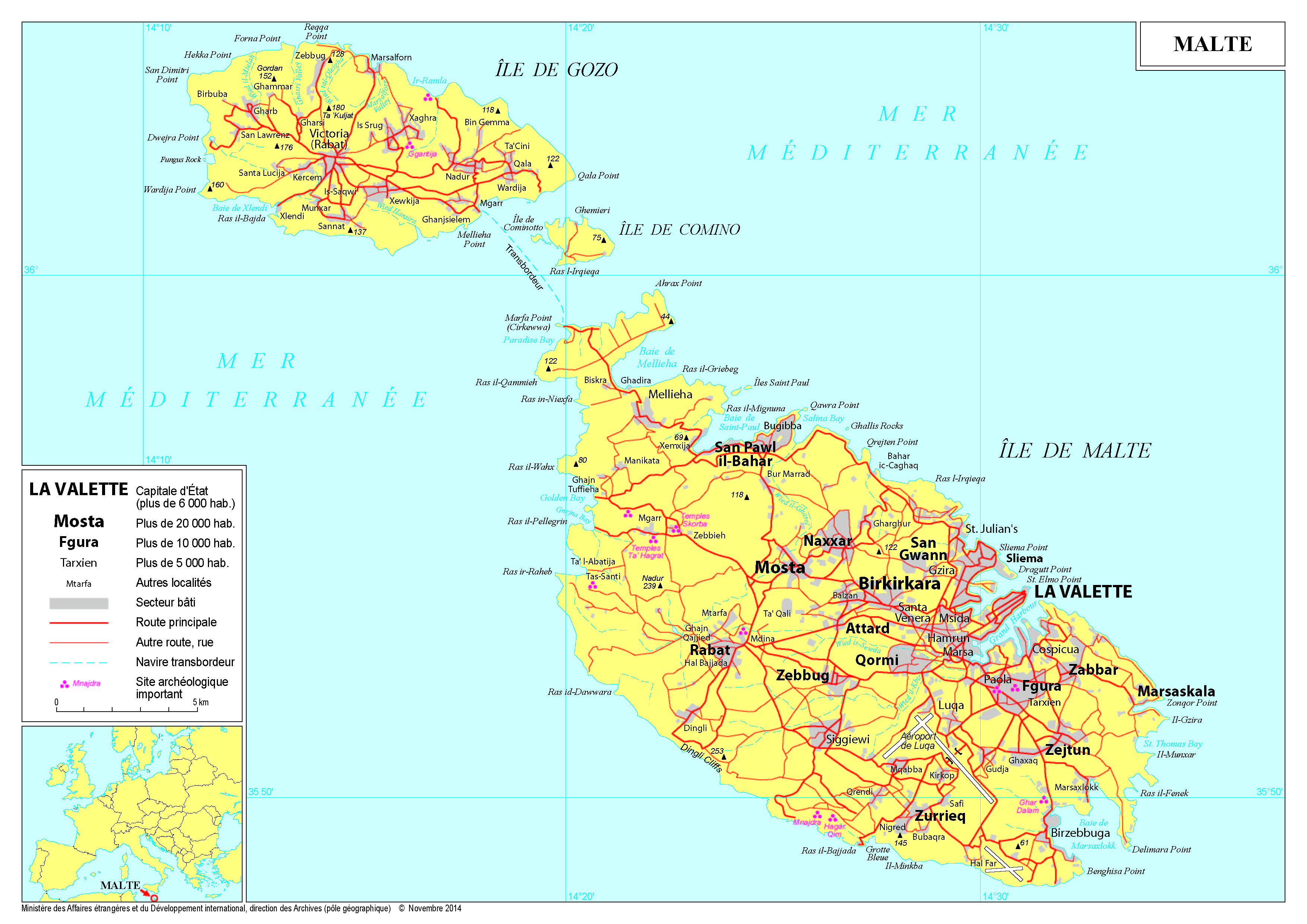Malte Navigation latérale fiche pays Dans cette rubrique Malte Présentation de Malte Conseils aux voyageurs Dernières minutes et alertes Sécurité Entrée / séjour Santé Informations utiles Voyages d'affaires Contacts utiles Politique et économie Relations bilatérales Présentation de Malte Date de mise à jour le : 02 avril 2026 Information toujours valable à la date du jour Présentation du pays Données générales Nom officiel : République de MalteNature du régime : démocratie parlementaireChef de l’Etat : Myriam Spiteri Debono Données géographiques Superficie : 316 km²Capitale : La ValetteVilles principales : Birkirkara, Mosta, Qormi, ŻabbarLangues officielles : maltais et anglaisMonnaie : euroFêtes nationales : la République n’a pas établi de jour précis, mais célèbre avec solennité plusieurs moments importants de son histoire : 8 septembre, jour de la Victoire ; 21 septembre, jour de l’Indépendance ; 13 décembre, jour de la République. Données démographiques Population (Eurostat, 2024) : 563 443 habitantsDensité : 1 633 habitants/km² (la plus élevée parmi les États membres de l’Union européenne)Croissance démographique : +28,6 % depuis 2012Espérance de vie (Banque Mondiale, 2022) : hommes 81 ans / femmes 85 ansTaux d’alphabétisation (Banque Mondiale, 2021) : 95 %Religion (s) : catholicisme, 83 % (religion d’État) ; islam, 8 %Indice de développement humain (2022) : 25e rang mondial Politique intérieure Myriam Spiteri Debono, ancienne présidente de la Chambre des représentants (1996-1998) et membre du parti travailliste, a été élue Présidente de Malte le 27 mars 2024. Elle a prêté serment le 4 avril 2024 pour un mandat de cinq ans, succédant à George Vella qui occupait cette fonction depuis 2019. Robert Abela a été reconduit dans ses fonctions de Premier ministre lors des élections législatives du 26 mars 2022. Le parti travailliste a recueilli 55,1 % des suffrages exprimés (soit 162 707 voix et 33 474 voix d’avance) face au parti nationaliste (41,7 % des voix, soit 112 333 votes). Ces élections ont connu le taux de participation le plus faible depuis l’indépendance de Malte (85,5%). Il s’agit du deuxième mandat de Robert Abela, nommé Premier ministre le 13 janvier 2020 à l’issue d’une crise politique ayant entraîné la démission de Joseph Muscat, au pouvoir depuis 2013. Cette crise était survenue dans le cadre de l’enquête sur l’assassinat de la journaliste d’investigation Daphné Caruana Galizia en 2017. Politique étrangère Malte est attachée au principe de neutralité, inscrit dans sa Constitution en 1987. Malte a été élue le 9 juin 2022 en tant que membre non permanent du Conseil de sécurité des Nations unies (CSNU) pour le biennium 2023-2024. Dans cette enceinte, ses priorités ont été la Libye, l’agenda « Femmes, Paix et sécurité », les enfants dans les conflits armés et la protection des océans. Malte a assuré par ailleurs la présidence 2024 de l’OSCE. Malte a défini quatre priorités pour sa présidence du Conseil de l’Europe (mai-novembre 2025) : l’autonomisation des jeunes dans la vie démocratique, la protection des enfants, la lutte contre la violence et la discrimination, et la défense de la Convention européenne des droits de l’homme Relations avec l’Union européenne : Nombre de députés au Parlement européen : 6/720Commissaire européen : Glenn Micallef (Equité intergénérationnelle, de la Culture, de la Jeunesse et du Sport). Malte est particulièrement impliquée sur les questions liées à la Méditerranée et aux crises régionales. Elle est attentive à la situation en Libye, en raison de la proximité géographique de l’archipel, des flux migratoires et des relations économiques anciennes qui la lient au pays. Attachée aux formats EU-MED et 5+5, La Valette a accueilli le lancement de la préparation du sommet des deux rives en janvier 2019, organisé le forum préparatoire « Jeunesse, Éducation, Mobilité » en avril 2019, et accueilli la sixième édition du MED7 le 14 juin 2019. Le 10ème sommet du MED9 s’est déroulé le 29 septembre 2023 à Malte. Concernée en tant que pays de première entrée dans l’Union européenne, Malte s’investit au niveau européen sur le sujet des migrations, aux côtés de ses partenaires du MED5, en plaidant pour une solidarité européenne plus marquée et pour une relocalisation durable des migrants. La fiscalité est un autre sujet d’attention pour les autorités maltaises. Situation économique PIB (Eurostat, 2024) : 22 milliards EURPIB par habitant (Eurostat, 2024) : 39 500 EURCroissance (Eurostat) : +4,2% au deuxième trimestre de 2024Chômage (Eurostat) : 3% en décembre 2024 La mise en place par les autorités maltaises à partir de mars 2020 de « filets de sécurité » pour un montant équivalent à environ 9 % du PIB a permis de contenir l’impact économique et social de la crise sanitaire sur le plan de la consommation et de la production industrielle. Dans le plan national de relance et résilience (PNRR) accepté par la Commission le 16 septembre 2021, les autorités maltaises ont confirmé leur souhait de ne recourir qu’au volet « subventions » de la facilité européenne de relance et résilience, pour un total de 316,4 millions d’euros, représentant environ 2,7 % du PIB. Les autorités maltaises souhaitent s’engager dans le développement durable et ambitionnent de décarboner l’archipel. En 2025, le gouvernement maltais lancera Malta Vision 2050, un projet qui vise à opérer une transformation économique, numérique et environnementale d’ici 2050 Liste des représentations françaises Ambassade de France à Malte 130 Melita Street - Valetta VLT 1123 La Valette VLT 1123 Malte Tel : +356 2778 1747 ou 27 Ambassade de France à Malte Réseaux sociaux X Facebook