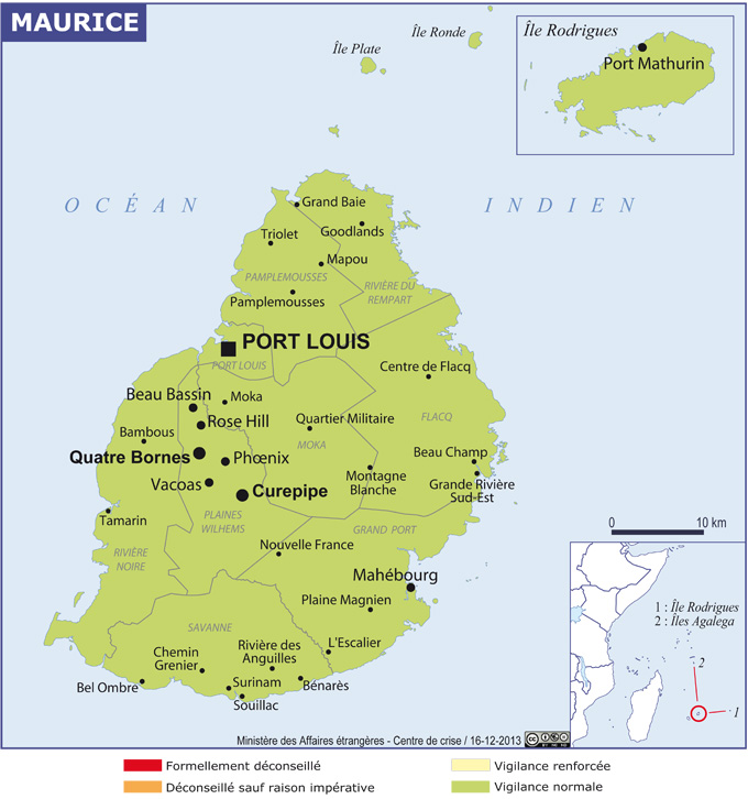 Maurice Navigation latérale fiche pays Dans cette rubrique Maurice Présentation de Maurice Conseils aux voyageurs Dernières minutes et alertes Sécurité Entrée / séjour Santé Informations utiles Voyages d'affaires Contacts utiles Politique et économie Relations bilatérales Sécurité Date de mise à jour le : 02 avril 2026 Information toujours valable à la date du jour Imprimer Imprimer Vous voyagez à l'étranger ? Pour recevoir des alertes, inscrivez-vous sur Fil d'Ariane. S'inscrire sur Fil d'Ariane Donnez-nous votre avis Aidez-nous à améliorer notre service en répondant à notre enquête. Répondre à l'enquête utilisateurs Fermer Vérifiez que vous êtes bien assurés Avant de voyager, il est indispensable de vérifier que vous êtes bien assuré Quelle est la portée des Conseils aux Voyageurs ? Zones de vigilance Dernière actualisation le 11/03/2026, information toujours valable à la date du jour L’ensemble du pays est placé en zone de vigilance normale. Risques encourus et recommandations associées Risques naturels Le territoire mauricien est soumis à d’importants aléas climatiques. Durant la saison cyclonique, de novembre à avril, il est recommandé de se tenir informé des conditions météorologiques : via le site Internet Mauritius Meteorological Services (en anglais) ; par téléphone via le service Telmet (numéro d’appel 8996 depuis un fixe et 171 depuis un portable) et le centre d’appels de Mauritius Telecom (joignable au 150) ; en cas de panne des émetteurs, via la télévision nationale publique (MBC) qui émet sur 684 et 819 KHz (AM). Les autorités mauriciennes ont mis en place un système d’alerte auquel il convient de se conformer strictement. Il est accessible sur le site de la météorologie nationale (en anglais). En cas d’alerte cyclonique, il est indispensable de prévoir à portée de main de l’eau en bouteilles, des bougies, des piles, une radio à piles, des torches, des bouteilles de gaz et quelques conserves alimentaires. Le confinement peut être décrété par les autorités mauriciennes pour une durée de deux à trois jours. Pour plus d’informations sur les comportements à adopter en cas d’alerte cyclonique, consulter la fiche Infos pratiques - risques climatiques ou le site de l’ambassade de France à Port-Louis. Recommandations générales Maurice est un pays globalement sûr, où les agressions sont rares mais en augmentation depuis 2025. On constate un phénomène nouveau d’agressions violentes et gratuites qui peuvent frapper les Mauriciens comme les étrangers. Une vigilance particulière doit être observée à tout instant et en tout lieu, et pas seulement dans les zones touristiques et balnéaires. Pour réduire les risques d’agression, des précautions d’usage doivent être observées. De manière générale, il est recommandé de : Ne pas se promener, a fortiori la nuit, dans des lieux désertés par le public (plages, parcs publics, notamment), ou de porter des objets de valeur le soir dans les centres villes ou les quartiers périphériques des agglomérations, afin de limiter le risque de vol. Ne pas montrer de signes ostentatoires de richesse et laisser tout objet de valeur dans des lieux sécurisés (ex : coffre d’hôtel). Laisser ses documents de voyage et d’identité dans un lieu sûr et se munir de photocopies lors de ses déplacements. Faire preuve de vigilance dans ses déplacements, y compris en voiture. Ne pas opposer de résistance en cas d’agression. Toujours garder ses effets personnels et ses bagages sous surveillance. Privilégier les excursions en groupe et encadrées par des professionnels, particulièrement lors de randonnées à l’intérieur du pays. S’assurer de la sécurité du lieu de séjour et éviter de séjourner dans des lieux isolés, les cambriolages étant fréquents. Ne pas laisser de sacs ou d’effets personnels apparents dans les véhicules stationnés sur les parkings publics (y compris à la plage). Activités sportives à risque Activités nautiques La plus grande prudence s’impose dans le domaine des sports nautiques (plongée sous-marine, planche à voile, kitesurf, bouées tractées par bateau, parachute ascensionnel, etc.) : Il est fréquent que des démarcheurs inexpérimentés et peu respectueux des normes sécuritaires sollicitent les touristes sur les plages. Ils disposent rarement d’une assurance de responsabilité civile. Les hôtels offrant une « case nautique » déclinent le plus souvent toute responsabilité en cas d’accident et ne disposent pas toujours des équipements de secours ou d’un maître-nageur-sauveteur pour venir en aide à des nageurs en difficulté. Il est vivement recommandé de contracter une assurance voyage pour toute la durée du séjour et couvrant les activités nautiques. De puissants courants marins causent régulièrement des disparitions et des noyades. Il convient de respecter les panneaux d’interdiction de baignade, de consulter les bulletins météo et de s’assurer des conditions de navigation avant toute sortie en mer. Liste des représentations françaises Ambassade de France à Maurice 14, rue Saint-Georges (entrée du consulat 5 rue Auguste Rouget) 11324 Port-Louis Maurice Tel : +33 3 59 39 71 85 Ambassade de France à Maurice Réseaux sociaux Facebook Instagram