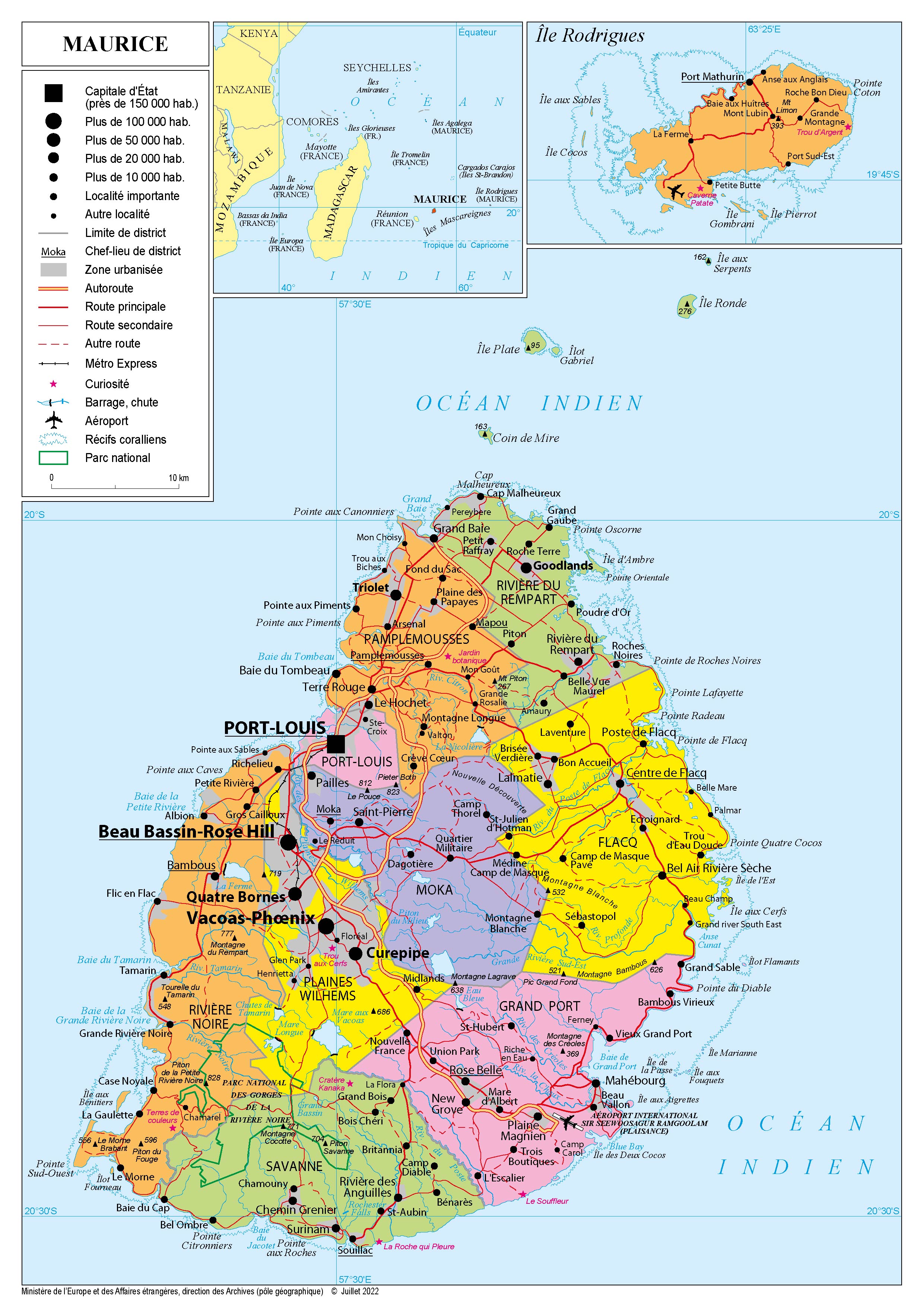 Maurice Navigation latérale fiche pays Dans cette rubrique Maurice Présentation de Maurice Conseils aux voyageurs Dernières minutes et alertes Sécurité Entrée / séjour Santé Informations utiles Voyages d'affaires Contacts utiles Politique et économie Relations bilatérales Présentation de Maurice Date de mise à jour le : 02 avril 2026 Information toujours valable à la date du jour Présentation du pays Données générales Nom officiel : République de MauriceNature du régime : parlementairePrésident de la République (depuis le 2 décembre 2019) : M. Prithvirajsing ROOPUNChef du gouvernement (et de l’exécutif) : M. Pravind JUGNAUTH Données géographiques Superficie : 1 865 km² et 1,1 million de km2 de zone économique exclusive (ZEE)Capitale : Port-LouisVilles principales : Quatre Bornes, Curepipe, Rose-HillLangues officielles : anglais, français (de facto car aucune langue officielle mentionnée dans la Constitution)Langues courantes : créole, anglais, françaisMonnaie : roupie mauricienne (1 € = 50 roupies mauriciennes au 01/06/2024)Fête nationale : 12 mars (indépendance du Royaume-Uni en 1968) Données démographiques Population (en 2022) : 1,26 million d’habitants (Banque mondiale)Densité (en 2022) : 675 habitants/km² (Banque mondiale)Croissance démographique (en 2022) : -0,3 % (Banque mondiale)Espérance de vie à la naissance (en 2021) : 74 ans (Banque mondiale)Taux d’alphabétisation (total adultes) en 2021 : 92 % (Banque mondiale)Indice de développement humain (IDH) : 72e rang mondial sur 193 pays (PNUD, 2022) Politique intérieure Le Premier ministre Pravind Jugnauth, arrivé à la tête du gouvernement mauricien en janvier 2017 à la suite de la démission du Premier ministre précédent, son père Sir Anerood Jugnauth, a été reconduit dans ses fonctions après la victoire de sa coalition, l’Alliance morisien, aux élections législatives du 7 novembre 2019. Celle-ci remporte alors la majorité absolue (42 sièges sur 70) à l’Assemblée nationale. Dans l’opposition, l’Alliance nationale, qui rassemble le Parti travailliste de l’ancien Premier ministre Navin Ramgoolam et le Parti mauricien social-démocrate de Xavier-Luc Duval (actuel chef de l’opposition parlementaire), n’obtient que 17 sièges ; le Mouvement militant mauricien de Paul Bérenger, engagé seul en campagne, n’en dispose pour sa part que de 9. Sur proposition du Premier ministre, l’Assemblée nationale mauricienne a élu le 2 décembre 2019 M. Prithvirajsing Roopun au poste de président de la République de Maurice et M. Marie Cyril Eddy Boissézon au poste de vice-président. Ces deux fonctions sont essentiellement protocolaires, le pouvoir exécutif étant détenu par le Premier ministre. Les prochaines élections législatives doivent avoir lieu d’ici au premier semestre 2025. Politique étrangère Maurice abrite le siège de la Commission de l’océan Indien (COI), dont elle a exercé la présidence annuelle de mai 2023 à mai 2024. Maurice accueille également le secrétariat général de l’IORA (Indian Ocean Rim Association - Association des États riverains de l’océan Indien), dont la France est devenue membre en décembre 2020. Elle est présente au sein de plusieurs organisations régionales et africaines : Union africaine, SADC (Southern African Development Community - la Communauté de développement d’Afrique australe), COMESA (Common Market for Eastern and Southern Africa - le Marché commun de l’Afrique orientale et australe). Maurice est également membre de l’Association des îles Vanilles, de l’Organisation internationale de la Francophonie (OIF) et du Commonwealth. Très faible émettrice de gaz à effet de serre, Maurice est active au sein du groupe des petits États insulaires en développement (PEID). Pour des raisons communautaires, historiques et géographiques, Maurice entretient une relation privilégiée avec l’Inde. Maurice a conservé une relation très forte avec l’Europe (France, Royaume-Uni, institutions européennes), sur le plan commercial mais aussi de la défense du droit international. Maurice a ainsi voté en faveur des résolutions onusiennes consécutives à l’invasion de l’Ukraine par la Russie. Une délégation de l’Union européenne, compétente également pour les Seychelles, est présente à Port-Louis. Situation économique Maurice connaît un niveau de développement élevé, se hissant en 2022 au 72ème rang mondial en termes d’indice de développement humain, grâce notamment au tourisme (qui comptait pour 20 % du PIB avant la pandémie) et aux activités liées au sucre, au textile, ainsi qu’au secteur financier et aux TIC. La croissance du PIB a atteint 6,9 % en 2023 et est estimée à 4,9 % en 2024. www.tresor.economie.gouv.fr/Pays/MU Liste des représentations françaises Ambassade de France à Maurice 14, rue Saint-Georges (entrée du consulat 5 rue Auguste Rouget) 11324 Port-Louis Maurice Tel : +33 3 59 39 71 85 Ambassade de France à Maurice Réseaux sociaux Facebook Instagram