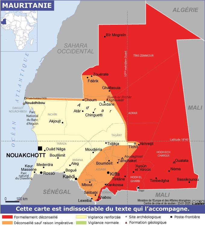 Mauritanie Navigation latérale fiche pays Dans cette rubrique Mauritanie Présentation de la Mauritanie Conseils aux voyageurs Dernières minutes et alertes Sécurité Entrée / séjour Santé Informations utiles Voyages d'affaires Contacts utiles Politique et économie Relations bilatérales Sécurité Date de mise à jour le : 02 avril 2026 Information toujours valable à la date du jour Imprimer Imprimer Vous voyagez à l'étranger ? Pour recevoir des alertes, inscrivez-vous sur Fil d'Ariane. S'inscrire sur Fil d'Ariane Donnez-nous votre avis Aidez-nous à améliorer notre service en répondant à notre enquête. Répondre à l'enquête utilisateurs Fermer Vérifiez que vous êtes bien assurés Avant de voyager, il est indispensable de vérifier que vous êtes bien assuré Quelle est la portée des Conseils aux Voyageurs ? Zones de vigilance Dernière actualisation le 11/03/2026, information toujours valable à la date du jour Zones formellement déconseillées (zone rouge) Compte-tenu de la situation sécuritaire dégradée au Mali voisin, il est formellement déconseillé de s’approcher des frontières de ce pays. Il est formellement déconseillé de se rendre dans les zones situées : au nord de la ville de Zouérate ; à l’est d’une ligne Ghallaouia – Akhrejit ; au nord-est d’une ligne Zouérate – Ghallaouia ; au sud-est d’une ligne Akhrejit – Kankossa ; dans la bande frontalière avec le Mali. Dans la partie nord-est du pays, aux confins des frontières malienne, algérienne et avec le Sahara occidental, l’existence d’activités illicites (passage à travers le territoire mauritanien de trafiquants armés, orpaillage illégal), ainsi que le risque d’infiltration de groupes terroristes, ont amené les autorités mauritaniennes à déclarer une « zone militaire ». Ce territoire est délimité à l’est et au nord par les frontières, à l’ouest par le 10ème méridien et au sud par la latitude 18°40’. Selon les termes du ministère mauritanien de la défense, « tout individu circulant ou transitant dans cette partie du territoire national serait traité comme cible militaire ». Une autorisation expresse de l’état-major ou du gouverneur de la région est requise pour y accéder (voir l’onglet Entrée/séjour). Zones déconseillées sauf raison impérative (zone orange) La zone frontalière de Nouadhibou jusqu’à Zouérate est déconseillée sauf raison impérative, à l’exception du poste frontière PK55. Il convient de ne pas quitter la piste sur cet itinéraire. Il est déconseillé sauf raison impérative de se rendre : au nord d’une ligne Choum – Aghouedir ; à l’est d’une ligne Aghouedir – Tichit ; au sud-est d’une ligne Tichit – Kaedi. Cette zone inclut les wilayas de l’Assaba, du Gorgol, et du Guidimaka. Zones de vigilance renforcée (zone jaune) Le reste du territoire est en vigilance renforcée. Franchissement du PK55 : sur la piste traversant le « no man’s land » séparant le Sahara occidental de la Mauritanie, la circulation dans les deux sens est libre depuis le 1er janvier 2000, sous réserve d’accomplir les formalités de passage (de 8h à 18h) : les autorités mauritaniennes délivrent des visas au niveau de la frontière. Les abords de cette piste sont minés, il est impératif de ne pas s’en écarter. Une conduite prudente est indispensable. Les déplacements de nuit sont dangereux. Les régions qui ne sont pas desservies par des routes goudronnées, comme le site touristique du Banc d’Arguin, justifient un déplacement à deux véhicules et le recours à des guides expérimentés. Risques encourus et recommandations associées Terrorisme La situation au Sahel et en particulier au Mali voisin (activités des groupes terroristes, trafics transfrontaliers, interventions des forces armées) continue d’exposer le territoire mauritanien à des risques d’infiltration de groupes hostiles. Il est formellement déconseillé de se rendre en zone rouge et d’emprunter les axes routiers vers le Mali. Il convient de respecter les recommandations générales ci-dessous. Sécurité routière L’état des routes et des véhicules, la divagation d’animaux, les comportements au volant, le recouvrement du bitume par le sable provoquent de nombreux accidents graves. Une vigilance particulière est requise dans l’ensemble du pays. Il est dangereux de circuler de nuit. Délinquance Dans la ville de Nouakchott, le niveau de délinquance observé est relativement faible en comparaison avec des villes de taille équivalente dans le monde. Néanmoins, on note une recrudescence des vols avec violence par des individus circulant à deux roues motorisés, dans les quartiers les plus sûrs de Nouakchott. Dans les zones périphériques de Nouakchott, les atteintes aux biens et aux personnes sont également en augmentation. Des agressions envers des femmes ont eu lieu sur les plages les plus proches de la capitale et la nuit en ville. Il est recommandé aux femmes de ne pas se rendre seules sur ces plages, ni se déplacer seules la nuit dans la capitale. En marge d’événements sportifs ou culturels organisés au stade olympique de Nouakchott, des délinquants opérant en bandes peuvent sévir et s’en prendre aux biens des spectateurs ou des personnes se trouvant dans les quartiers situés aux abords du stade, en les menaçant parfois à l’aide d’armes blanches. Il est recommandé de se tenir informés de l’organisation d’événements de ce type, d’adopter une attitude de prudence et de vigilance les jours de match ou de concert et d’éviter, en tout état de cause, de se déplacer à pied la nuit. Activités sportives aériennes Des accidents graves se sont produits lors de vols en montgolfière. Les conditions météorologiques extrêmes du Sahara (vents de sable, variations thermiques fortes et soudaines, relief accidenté) et les moyens techniques limités (guidage, atterrissage et assistance) requiè