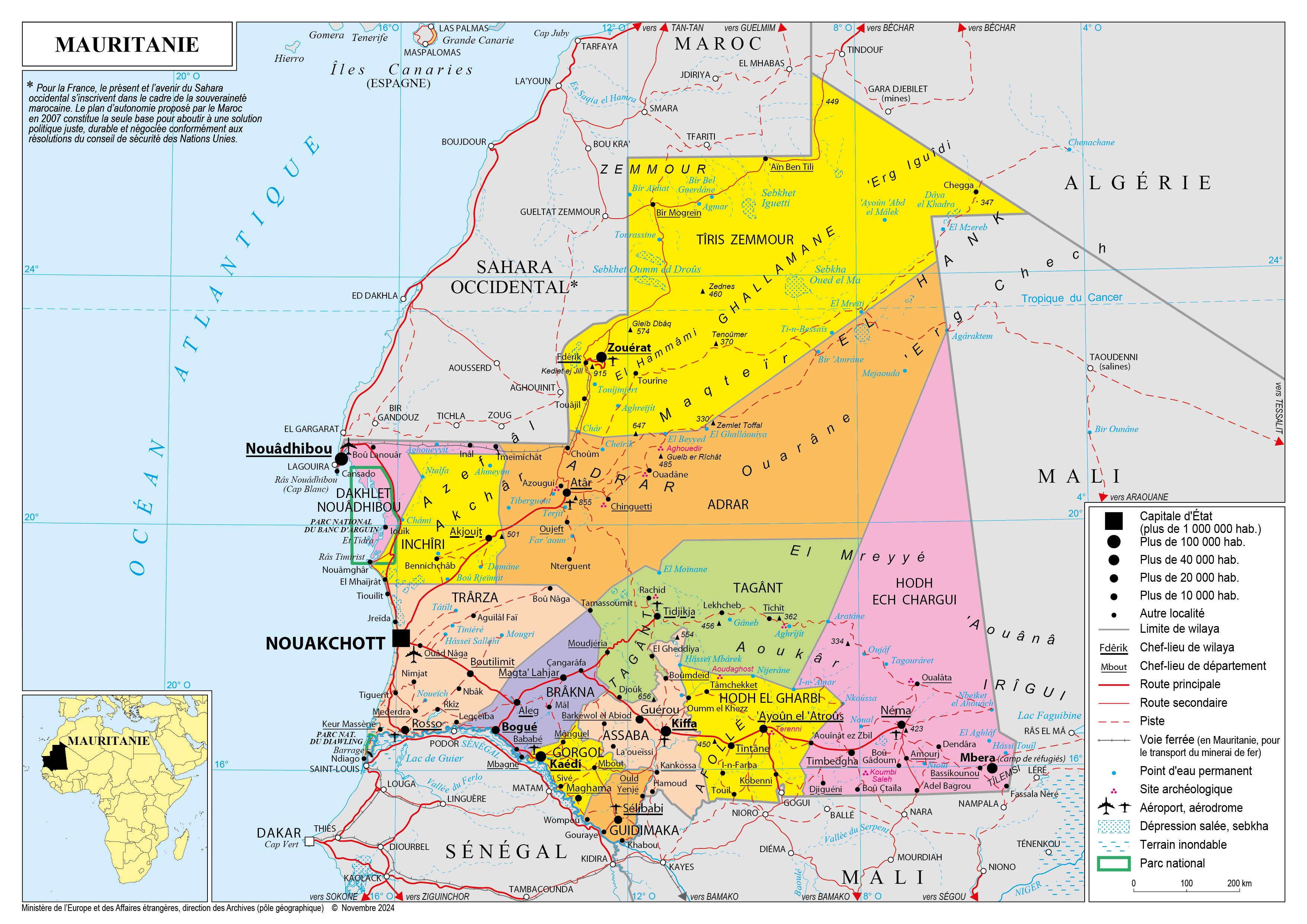 Mauritanie Navigation latérale fiche pays Dans cette rubrique Mauritanie Présentation de la Mauritanie Conseils aux voyageurs Dernières minutes et alertes Sécurité Entrée / séjour Santé Informations utiles Voyages d'affaires Contacts utiles Politique et économie Relations bilatérales Présentation de la Mauritanie Date de mise à jour le : 02 avril 2026 Information toujours valable à la date du jour Présentation du pays Données générales Nom officiel : République islamique de MauritanieNature du régime : République islamique, régime parlementaireChef de l’Etat : Mohamed Ould Cheikh El Ghazouani depuis le 1er août 2019, réélu le 29 juin 2024Chef du gouvernement : Mokhtar Ould Diay Données géographiques Superficie : 1 030 700 kilomètres carrésCapitale : NouakchottVilles principales : Nouadhibou, RossoLangue officielle : arabeLangues nationales : arabe, pulaar, soninké, wolofMonnaie : Ouguiya (MRU) en vigueur depuis le 1er janvier 2018, 1 MRU = 0,023 EUR (mai 2024) Données démographiques Population : 4,9 millions d’habitants (Banque mondiale, 2023)Taux de croissance démographique : 2,6 % (Banque mondiale, 2022)Espérance de vie : 65,5 ans (ONU, 2023)Religion : Islam, 99% (religion officielle)Indice de développement humain : 164ème sur 193 pays (PNUD, 2023) Politique intérieure La Mauritanie a effectué sa première alternance démocratique en 2019 avec l’accession au pouvoir du président Mohamed Ould Cheikh El Ghazouani (élu à 52% des suffrages), saluée par la communauté internationale. Celui-ci a ainsi succédé au président Mohamed Ould Abdel Aziz, qui était à la tête du pays depuis 2009. Lors de son premier mandat, le président Ghazouani avait fixé comme priorités à son gouvernement la lutte contre la pauvreté, les inégalités et la corruption ainsi que le développement économique. Il a également organisé des consultations avec l’opposition et la société civile. Les élections générales (législatives, régionales et municipales) se sont tenues en mai 2023 dans un calme relatif et ont été remportées par le parti présidentiel El Insaf. Le 29 juin 2024, le président Ghazouani a été réélu dès le premier tour avec 56,12% des voix. Les priorités annoncées du président Ghazouani pour son deuxième mandat sont le renforcement de l’État de droit, une meilleure gouvernance, le développement des secteurs productifs et l’auto-suffisance alimentaire, le développement du capital humain, l’inclusion sociale, la sécurité et la stabilité. Peu après sa réélection, le chef d’État mauritanien a nommé un nouveau gouvernement afin de mettre en œuvre ces priorités. Politique étrangère La politique extérieure de la Mauritanie est marquée par sa situation géographique, à la confluence de l’Afrique du Nord et de l’espace subsaharien. Membre fondateur l’Union africaine, la Mauritanie a été désignée le 9 février 2024 pour assurer la présidence tournante de l’organisation. La Mauritanie est également partie au processus de Nouakchott, un mécanisme de renforcement de la coopération sécuritaire entre les pays du Sahel et l’Architecture africaine de paix et de sécurité (APSA) dans la région, qui regroupe onze Etats sous l’égide de l’Union africaine. Nouakchott s’est engagée activement dans la sécurité collective en Afrique, notamment par le biais de ses casques bleus en République centrafricaine. La Mauritanie est liée par un accord d’association à la Communauté économique des États d’Afrique de l’Ouest (CEDEAO), qu’elle a quittée en décembre 1999. Elle participe à des organisations subrégionales ad hoc dont l’Organisation pour la mise en valeur du fleuve Sénégal (OMVS), la Grande Muraille verte (dont elle héberge l’agence panafricaine) ainsi que le Comité permanent inter-États de lutte contre la sécheresse dans le Sahel. Nouakchott était également pleinement engagée au sein du G5 Sahel, dont elle a accueilli le Secrétariat exécutif, le Collège de Défense ainsi que le sommet de juin 2020 – et dont elle avait pris la présidence en 2023. En dépit des retraits successifs du Mali, du Niger et du Burkina Faso, le G5 Sahel n’a pas été formellement dissout. La Mauritanie a par ailleurs adhéré à la Ligue arabe en novembre 1973 et participé à la création de l’Union du Maghreb arabe en février 1989. Le pays est membre de l’Organisation de la coopération islamique depuis sa création en septembre 1969, ainsi que de l’Organisation Internationale de la Francophonie. La Mauritanie participe également aux instances euro-méditerranéennes. Depuis 1990, elle est impliquée dans le dialogue 5 + 5. Associée au processus de Barcelone dès novembre 1995, elle en est devenue membre à part entière en novembre 2007, tout en continuant d’appartenir au groupe des États d’Afrique, des Caraïbes et du Pacifique concernés par l’accord de Cotonou. Depuis le 7 décembre 2023, la Mauritanie fait partie de l’accord de Samoa, qui établit un dialogue de partenariat reposant sur la coopération politique, la coopération économique et commerciale et la coopération au développement. A l’occasion de la visite conjointe du Président Sanchez et de la Présidente von der Leyen à Nouakchott le 8 février 2024, une augmentation considérable du soutien de l’UE a été annoncée, avec un « paquet » d’engagements nouveaux de plus de 210 M€ et des projets d’investissements majeurs dans le cadre du Global Gateway, en même temps qu’un partenariat stratégique pour la production d’hydrogène et d’acier verts (à hauteur de 60M€ sur les quatre prochaines années). La déclaration conjointe pour un partenariat migratoire UE-Mauritanie annoncée à cette occasion a par ailleurs été signé le 7 mars 2024. Un accord de pêche, le plus important pour l’UE sur le plan financier, a également été signé en 2021 pour une durée de cinq a