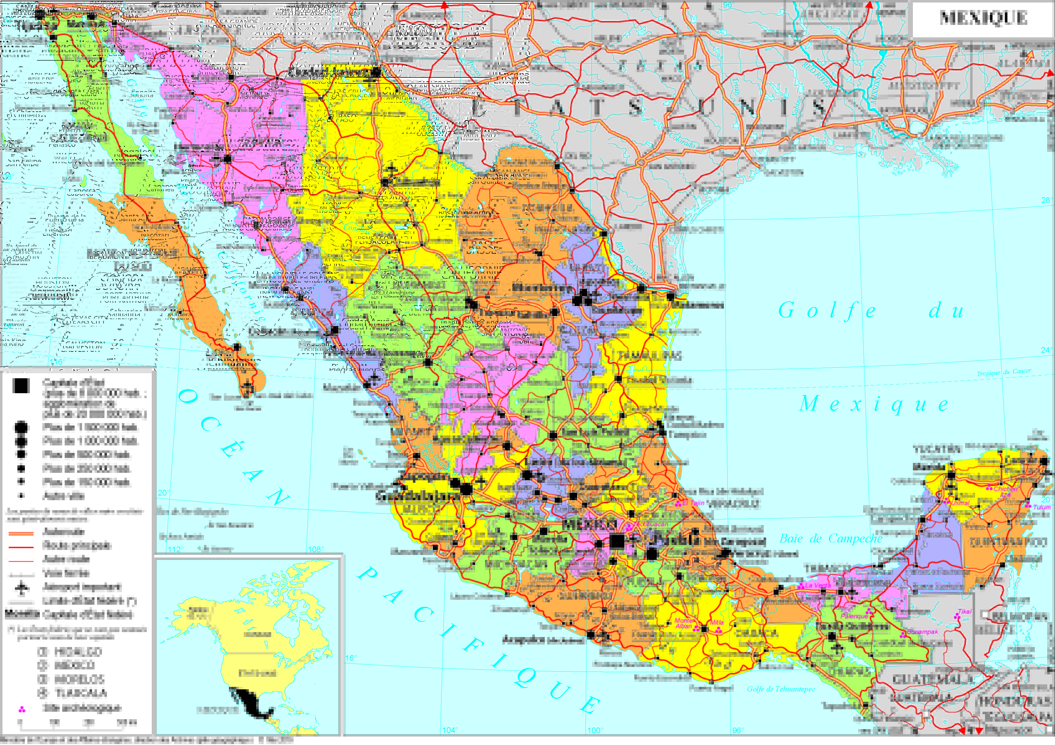 Mexique Navigation latérale fiche pays Dans cette rubrique Mexique Présentation du Mexique Conseils aux voyageurs Dernières minutes et alertes Sécurité Entrée / séjour Santé Informations utiles Voyages d'affaires Contacts utiles Politique et économie Relations bilatérales Présentation du Mexique Date de mise à jour le : 02 avril 2026 Information toujours valable à la date du jour Présentation du pays Données générales Nom officiel : États-Unis mexicainsNature du régime : République fédérale présidentielleChef de l’État : Claudia Sheinbaum (née le 24 juin 1962)Fête nationale : 16 septembre (commémoration du début du soulèvement du 16 septembre 1810 qui a conduit à la proclamation de l’Indépendance en 1821). Données géographiques Superficie : 1 972 547 km²Capitale : Ville de MexicoVilles principales : ville de Mexico (20,8 millions d’habitants), Guadalajara (4,3 millions d’habitants), Monterrey (3,5 millions d’habitants), Puebla (2,1 millions d’habitants)Langue officielle : espagnolLangues courantes : nahuatl (1,5 million) ; maya (800 000) ; mixtèque (510 000) ; zapotèque (505 000)Monnaie : 1 peso mexicain = 0.0514 euros (octobre 2023) Données démographiques Population (2023) : 128 455 567 (Banque mondiale)Taux de croissance démographique (2023) : 0.7 % (Banque mondiale)Espérance de vie (2022) : 75 ans (Banque mondiale)Taux d’alphabétisation (2020) : 95 % (Banque mondiale)Religions : 84 % catholiques, 10 % protestants ; un syncrétisme s’opère entre des croyances issues des cultures indiennes et l’expression populaire du catholicisme.Indice de développement humain (2021) : 0,758 - 86e rang mondial (PNUD) Politique intérieure Le Mexique est une République fédérale composée de 32 entités fédératives (31 États et la ville de Mexico). Le président est le chef de l’exécutif, élu pour un mandat de six ans non renouvelable, au suffrage universel direct à un seul tour et à la majorité relative. Le pouvoir législatif revient au Congrès, divisé en deux chambres : la Chambre des députés (500 représentants élus au suffrage universel direct tous les trois ans) et le Sénat (128 membres, soit quatre sénateurs par entité fédérative). Le président et les deux chambres ont l’initiative des lois. Les élections générales du 1er juillet 2018 ont porté pour la première fois au pouvoir un président se revendiquant de gauche, Andrés Manuel López Obrador (AMLO). Son parti MORENA (Movimiento Regeneración Nacional) a emporté, avec les partis de la coalition (Parti travailleur et Parti écologiste vert), les élections législatives et cinq gouvernements d’États fédérés sur les neuf faisant l’objet d’élections en 2018. AMLO a fait de la lutte contre la corruption, l’insécurité et les inégalités la priorité d’un programme baptisé "Quatrième Transformation" du Mexique en référence à l’Indépendance, la Réforme libérale juariste et la Révolution mexicaine du début du XXe siècle. La Constitution interdisant de briguer un second mandat présidentiel, les primaires de la coalition présidentielle ont abouties en septembre 2023 à la désignation de l’ex-maire de Mexico, Claudia Sheinbaum. Les 3 principaux partis d’opposition (PAN, PRI, PRD) réunis au sein d’une coalition ont désigné une candidate unique à l’issue des primaires, Xóchitl Gálvez (sénatrice du PAN). Le Mouvement citoyen (MC), 3ème force politique du pays avait lui pour candidat le député Jorge Álvarez Máynez. A l’issue des élections générales du 2 juin, Claudia Sheinbaum (Morena), ancienne maire de Mexico, est devenue la première femme présidente du Mexique avec un score historique de 59,7% des suffrages. Elle devance de 32 points Xóchilt Gálvez, candidate de la coalition de centre-droit, à 27,9%. Elle a largement profité de la forte popularité de l’actuel président et mentor. Sa prise de fonctions est prévue le 1er octobre 2024. La coalition présidentielle (Morena, PT, PVEM) a aussi remporté la majorité qualifiée des 2/3 à la Chambre des députés (majorité qu’elle avait perdue en 2021) et la majorité absolue au Sénat. Au niveau fédéral, la coalition remporte 7 des 9 postes de gouverneurs en jeu et contrôle désormais 24 des 32 Etats fédérés du Mexique. Claudia Sheinbaum a rendu public les premières nominations au sein de son gouvernement : Marcelo Ebrard, ex-chancelier, comme ministre de l’Economie ; Alicia Barcena, actuelle ministre des relations extérieures, comme ministre de l’environnement ; Juan Ramón de la Fuente, ex-RP ONU du Mexique, aux relations extérieures ; Julio Berdegué comme ministre de l’agriculture et du développement rural ; Rosaura Ruiz au nouveau ministère de la science, des humanités, de la technologie et de l’innovation ; Omar García Harfuch, ancien ministre de la sécurité de la ville de Mexico durant le mandat de Claudia Sheinbaum, ministre de la sécurité ; Mario Delgado, président de Morena, à l’Education ; Rosa Icela Rodriguez, actuelle ministre de la sécurité, à l’Intérieur ; Ernestina Godoy, comme conseillère juridique de la Présidente ; Rogelio Ramírez de la O conserve son poste de ministre des finances ; Ariadna Montiel reste à la tête du ministère du Bien-être. Politique étrangère Membre fondateur des Nations unies, le Mexique défend une position inspirée de son attachement au règlement pacifique des différends et au droit international, et à sa tradition diplomatique non-interventionniste ("Doctrine Estrada"). Le pays a été élu pour la cinquième fois de son histoire membre non-permanent du Conseil de sécurité des Nations unies pour le biennium 2021-2022. Il est membre du G20 et de l’OCDE. Le Mexique et la France ont co-présidé en 2021 le Forum Génération Egalité pour l’égalité femmes-hommes et le Fonds vert pour le Climat. Le Mexique a rejoint de nombreuses initiatives portées par l