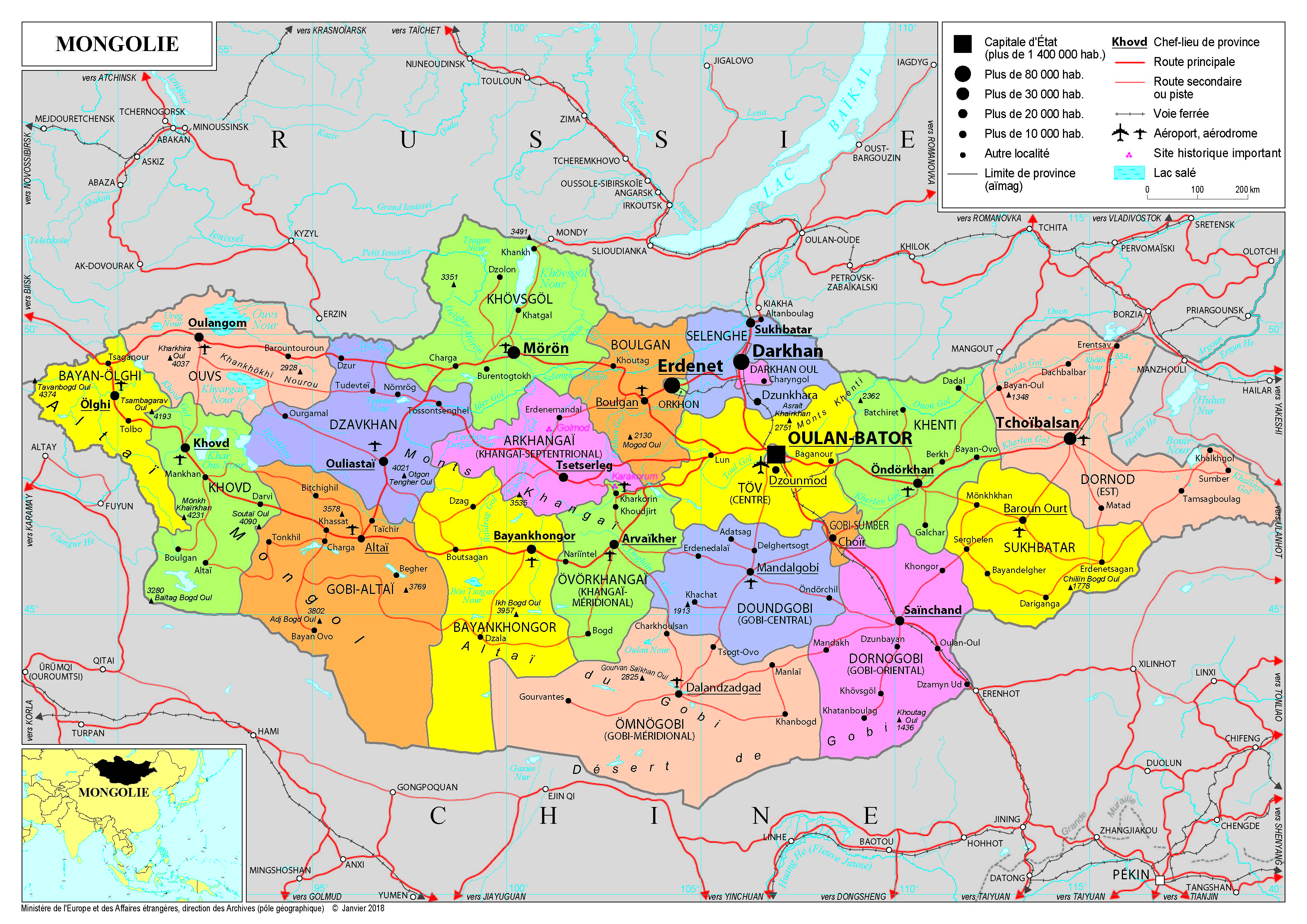 Mongolie Navigation latérale fiche pays Dans cette rubrique Mongolie Présentation de la Mongolie Conseils aux voyageurs Dernières minutes et alertes Sécurité Entrée / séjour Santé Informations utiles Voyages d'affaires Contacts utiles Politique et économie Relations bilatérales Présentation de la Mongolie Date de mise à jour le : 19 janvier 2026 Information toujours valable à la date du jour Présentation du pays Données générales Nom officiel : MongolieNature du régime : démocratie parlementaireChef de l’Etat : Président Ukhnaagiin KHÜRELSÜKH (depuis le 25 juin 2021)Chef du Gouvernement : Premier ministre Luvsannamsrai OYUN-ERDENE (depuis le 27 janvier 2021) Données géographiques Superficie : 1 553 556 km²Capitale : Oulan-BatorLangue officielle : mongolMonnaie : Togrog ou TugrikFête nationale : 11 juillet (« Naadam ») Données démographiques Population : 3,5 millions d’habitants (2023)Densité : 2,24 hab./km²Croissance démographique : 1.6% (2021, Banque mondiale)Espérance de vie : 71 ans (2021, Banque mondiale)Taux d’alphabétisation : 99% (2020, Banque mondiale)Religions : bouddhisme lamaïque, islam (4%)Indice de développement humain : 0,741, 96ème (PNUD, 2024) Politique intérieure La vie politique mongole traduit l’enracinement progressif de la démocratie et de l’Etat de droit dans ce pays depuis le changement de régime en 1990. La décision d’abolir la peine de mort début 2012 avec la ratification du Pacte international sur les droits civils et politiques, qui illustre l’engagement des autorités à promouvoir les droits de l’Homme, a été définitivement entérinée en droit interne le 1er juillet 2017. U. KHÜRELSÜKH a été élu Président le 9 juin 2021 avec 67,7% des suffrages. Trois priorités ont été annoncées : lutte contre le changement climatique ; indépendance de la justice ; préservation de l’indépendance de la Mongolie face à Moscou et Pékin. Le gouvernement OYUN-ERDENE, en place depuis le 29 janvier 2021, a été remanié deux fois à l’été 2022 puis à l’issue des élections législatives de juin 2024. Politique étrangère La Mongolie a mis en place des partenariats stratégiques avec la Russie en 2009, le Japon (2010), la Chine (2011), l’Inde (2015), les Etats-Unis en 2019 et la Corée du Sud en 2021. La Mongolie attache une grande importance au développement de ses relations avec ses « troisièmes voisins » - dont la France (mais également : Etats-Unis, Japon, Corée du Sud, UE, Allemagne). La Mongolie entretient des relations étroites avec le FMI, le PNUD et la Banque Mondiale pour mener à bien son développement. Elle a adhéré à la Banque Européenne pour la Reconstruction et le Développement (BERD) en juillet 2006. Elle est devenue le 57ème Etat participant de l’OSCE en novembre 2012. Une coopération entre la Mongolie et l’OTAN existe dans le cadre des relations de l’Alliance avec les « pays contacts ». La Mongolie participe à de nombreuses opérations de maintien de la paix (OMP) sous mandat des Nations unies dont elle est le quatrième contributeur mondial par rapport à sa population (885 soldats, essentiellement au Sud-Soudan et au Darfour) derrière le Rwanda, les Fidji et l’Uruguay. La Mongolie est membre de l’ASEM depuis 2006 et a accueilli le 11e sommet Asie-Europe à Oulan-Bator les 15 et 16 juillet 2016. Dans le domaine de la sécurité, elle est l’un des douze « partenaires du dialogue » de l’ARF (Forum régional de l’ASEAN). Elle est enfin l’un des pays fondateurs de la Banque asiatique d’investissement dans les infrastructures (AIIB) créée en octobre 2014 à Pékin. Les autorités mongoles mettent notamment en avant le concept des « routes de la steppe » afin de se positionner comme un espace de transit entre la Chine et la Russie en développant des projets d’infrastructures (ferroviaires, numériques, routières) susceptibles de renforcer la connectivité entre ces pays dans le cadre de la constitution d’un corridor économique reliant le projet russe « Trans-European belt » (TEPR) à l’initiative chinoise « Belt and Road Initiative ». La Mongolie organise depuis 2013 le Dialogue d’Oulan-Bator sur la sécurité en Asie du nord-est. Situation économique Avec un PIB de 18.8 Mds USD en 2023, l’économie mongole dispose de nombreux atouts (4e pays le plus richement doté en ressources naturelles, élevage). Plusieurs secteurs (mines, agroalimentaire, télécommunications, tourisme) recèlent un fort potentiel de développement. La Mongolie demeure très dépendante des combustibles fossiles, en premier lieu du charbon qui représente la majorité de son approvisionnement énergétique (70%), suivi du pétrole (27%), tandis que la part des renouvelables s’élève à seulement 2%. Le pays possède néanmoins l’un des plus gros potentiels au monde en termes d’énergies renouvelables. Placée sur liste grise du Groupe d’action financière (GAFI) à l’issue de la réunion plénière du 18 octobre 2019, la Mongolie en a été retirée en 2021. Liste des représentations françaises Ambassade de France en Mongolie 15, avenue de la Paix - 1er Khoroo - district de Chingeltei Oulan Bator 15160 Mongolie Tel : +976 11 32 45 19 Ambassade de France en Mongolie Réseaux sociaux Facebook X Section consulaire de l’Ambassade de France à Oulan Bator Enkhtaivany urgun chuluu-15 Poste Centrale - Boîte postale 687 Oulan Bator 15160 Mongolie Tel : +976 11 32 45 19 Ambassade de France en Mongolie Réseaux sociaux X