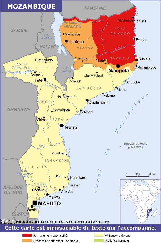 Mozambique Navigation latérale fiche pays Dans cette rubrique Mozambique Présentation du Mozambique Conseils aux voyageurs Dernières minutes et alertes Sécurité Entrée / séjour Santé Informations utiles Voyages d'affaires Contacts utiles Politique et économie Relations bilatérales Sécurité Date de mise à jour le : 02 avril 2026 Information toujours valable à la date du jour Imprimer Imprimer Vous voyagez à l'étranger ? Pour recevoir des alertes, inscrivez-vous sur Fil d'Ariane. S'inscrire sur Fil d'Ariane Donnez-nous votre avis Aidez-nous à améliorer notre service en répondant à notre enquête. Répondre à l'enquête utilisateurs Fermer Vérifiez que vous êtes bien assurés Avant de voyager, il est indispensable de vérifier que vous êtes bien assuré Quelle est la portée des Conseils aux Voyageurs ? Zones de vigilance Dernière actualisation le 11/03/2026, information toujours valable à la date du jour Zones formellement déconseillées (en rouge sur la carte) L’extrême nord du pays connait, depuis octobre 2017, un grand nombre d’attaques terroristes, d’inspiration islamiste, revendiquées par l’Etat Islamique au Mozambique. Des opérations militaires sont menées sur une large portion du territoire du Cabo Delgado. En dépit des offensives des forces de l’ordre mozambicaines et des forces armées du Rwanda, des groupes restent actifs, se déplaçant régulièrement et changeant régulièrement de mode opératoire. Plusieurs attaques visent autant les symboles de l’État (bâtiments publics, forces de sécurité) que les populations civiles (massacres, pillages, kidnappings…). Mais leurs actions concernent également les axes principaux de jour comme de nuit, et la zone de cabotage maritime. Par conséquent, il est formellement déconseillé de se rendre dans l’ensemble de la province du Cabo Delgado, y compris son chef-lieu Pemba, ainsi que dans le tiers Est de la province du Niassa et le long de la frontière avec la Tanzanie, jusqu’au Malawi. Il est également formellement déconseillé de séjourner dans les îles au large de ces districts (Ibo et Quirimbas). Dans la province de Nampula, il est formellement déconseillé de se rendre dans les districts de Memba, Errâti, Mecuburi, Lalaua et Nacaroa ainsi que la partie nord des districts de Nampula, Monapo, Meconta et Nacala, et la partie sud de Muecate. Zones déconseillées sauf raison impérative (en orange sur la carte) Des incursions djihadistes ont eu lieu dans les provinces limitrophes de Niassa et de Nampula. Sont déconseillés sauf raison impérative : la partie occidentale de la province du Niassa ; les districts de Nacala (Sud), Monapo (Sud), Mossuril, Muecate (Nord), , Nampula (Sud), Ribaue et Malima (y compris les villes de Nampula et Nacala) dans la province de Nampula. En cas de déplacement pour raison impérative, il convient de prendre des mesures de sécurité adaptées à ce type de menace. Zone de vigilance renforcée (en jaune sur la carte) En dehors des zones mentionnées ci-dessus, le reste du pays est en vigilance renforcée. Dans les parcs et réserves naturelles, des accidents peuvent survenir en raison de la présence d’animaux dangereux. Les risques routiers (comportements imprudents de certains automobilistes, état du réseau routier dégradé en dehors des grandes villes) sont d’autant plus importants que les services de secours ne sont pas en capacité d’intervenir rapidement. Les services de santé, insuffisamment présents sur l’ensemble du territoire et peu développés, ont une capacité de prise en charge limitée. Risques encourus et recommandations associées Terrorisme Le risque terroriste et d’enlèvement au Mozambique est élevé dans le nord-est du pays. Depuis octobre 2017, de nombreuses attaques de nature terroriste, menées par le mouvement armé djihadiste « Etat islamique au Mozambique », ont lieu dans la province de Cabo Delgado. Après les opérations de grande ampleur menées en 2021, notamment contre les villes de Mocimboa da Praia et de Palma, et la poursuite depuis lors des actions terroristes dans plusieurs zones de la province du Cabo Delgado et du nord de Nampula, la situation sécuritaire reste dégradée. Ces violences se sont étendues sporadiquement aux provinces voisines de Niassa et de Nampula. Délinquance de droit commun Les agressions et les vols à main armée (objets personnels, véhicules, cambriolages de logements), de jour comme de nuit, sont occasionnels à Maputo et dans les principaux centres urbains mais ont récemment augmenté. La pratique du car-jacking est devenue plutôt rare. La pratique des enlèvements contre rançon est récurrente à Maputo et dans les principaux centres urbains (notamment à Beira). À ce stade, les étrangers résidant au Mozambique et les touristes ne sont pas visés, mais le risque d’être victime de ce type de crime ne peut pas être écarté. Il est recommandé aux Français de signaler à l’ambassade de France tout incident ou toute menace dont eux ou leurs proches pourraient faire l’objet au Mozambique (appels anonymes, SMS, courriels). Des mesures de précaution (variation des itinéraires, renforcement de la protection personnelle, communication des déplacements à des proches) sont recommandées. Risque routier Les accidents graves de la circulation, dus au mauvais état du réseau routier, à l’imprudence des conducteurs, au manque d’entretien de certains véhicules ou à la traversée d’animaux domestiques ou sauvages, sont nombreux. Les dépassements sont souvent dangereux, en raison du non-respect de la distance de sécurité, d’un usage rare des clignotants et des risques inconsidérés pris par les automobilistes (dépassements malgré la présence de véhicules en face, forçant les autres automobilistes à rouler sur la bande d’arrêt d’urgence). Pour rappel, la conduite est à gauche au Mozambique. La conduite de nuit est à éviter absol