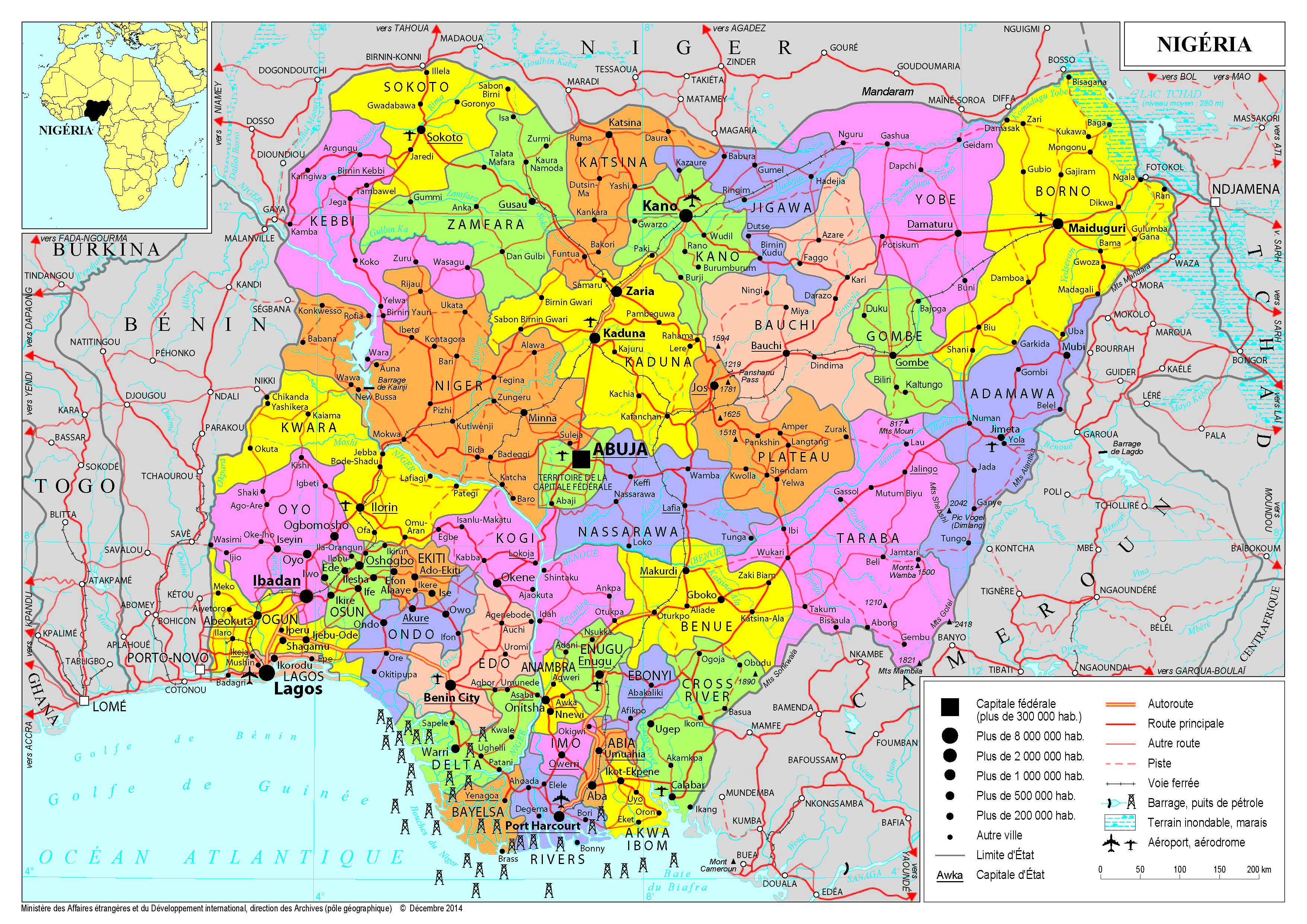 Nigéria Navigation latérale fiche pays Dans cette rubrique Nigéria Présentation du Nigéria Conseils aux voyageurs Dernières minutes et alertes Sécurité Entrée / séjour Santé Informations utiles Voyages d'affaires Contacts utiles Politique et économie Relations bilatérales Présentation du Nigéria Date de mise à jour le : 02 avril 2026 Information toujours valable à la date du jour Présentation du pays Données générales Nom officiel : République fédérale du NigériaChef de l’État et du Gouvernement : Bola Ahmed Tinubu (élu le 25 février 2023)Monnaie : naira (1 EUR = 500 NGN en janvier 2023)Fête nationale : 1er octobre Données géographiques Superficie : 923 773 km²Capitale : AbujaDivisions administratives : 36 Etats fédérésLangue officielle : anglaisLangues courantes : haoussa, yorouba, igbo, pidgin Données démographiques Population : 216 millions d’habitants (FNUAP), 410 millions en 2050 (World Population Prospects, ONU). Pays le plus peuplé d’Afrique, et le 7e au monde.Villes principales : Lagos (25 millions d’habitants), Ibadan (5,8 M), Kano (4,9 M), Benin City (2,6 M), Port Harcourt (2,3 M). Lagos est la 3e plus grande ville du monde, et la première d’Afrique.Densité : 230,44 habitants / km² (France : 118)Taux d’accroissement naturel : 2,5 % (FNUAP, 2023)Indice de fécondité : 5,08 enfants par femme (FNUAP, 2023)Espérance de vie à la naissance : 56 ans (FNUAP, 2023) Politique intérieure Le Nigéria est une République fédérale, constituée de 36 Etats et du Territoire de la capitale fédérale (FCT), autour d’Abuja. La Constitution de la Quatrième République, adoptée en 1999, est tirée de celle de 1979, elle-même inspirée de la constitution des Etats-Unis d’Amérique. Le Président du Nigéria est élu au scrutin uninominal majoritaire à deux tours, tous les quatre ans. Les électeurs nigérians élisent en même temps les membres de l’Assemblée nationale (NASS), composée d’une chambre haute, le Sénat, et d’une chambre basse, la Chambre des représentants. Le Sénat compte 109 sénateurs, à raison de trois par Etat, et 360 représentants siègent à la Chambre. Les représentants sont élus au sein de circonscriptions, dont le nombre varie selon les Etats. Lagos compte ainsi 24 députés, tandis que le petit Etat de Bayelsa n’en élit que cinq. Les gouverneurs des Etats, qui jouent un rôle particulièrement important au Nigéria, sont élus tous les quatre ans selon le même mode de scrutin que le Président. Ils soumettent les actes qui relèvent de leurs compétences à l’Assemblée de l’Etat (House of Assembly). A l’échelon local, les Local Government Areas (LGA) disposent de leur propre pouvoir exécutif, ainsi que d’une assemblée. Les LGA, les Etats fédérés et le gouvernement fédéral forment les trois « tiers » de l’Etat nigérian. Depuis la mort de Sani Abacha (8 juin 1998), qui a marqué la fin de la dictature militaire, le Nigéria était gouverné par le People’s Democratic Party (PDP). Trois chefs d’Etat ont été élus sous ses couleurs : Olusegun Obasanjo (1999-2007), Umaru Yar’Adua (2007-2010) et Goodluck Jonathan (2010-2015). Le président Buhari, a quant à lui été élu, en mars 2015, avec le soutien de l’All Progressives Congress (APC), coalition créée en 2013. Il a été réélu le 23 février 2019 avec 55,6 % des suffrages et un taux de participation historiquement bas (35,6 % des inscrits). Son principal opposant était Atiku Abubakar, candidat du PDP et vice-président d’O. Obasanjo, de 1999 à 2007. L’APC détient la majorité dans les deux assemblées et contrôle 22 des 36 Etats. Les élections présidentielle et législatives au Nigéria ont eu lieu le 25 février 2023. Elles se sont achevées par la victoire de Bola Ahmed Tinubu, candidat de l’All Progressive’s Congress (parti de la majorité) face, en particulier, à Atiku Ababukar (PDP), Peter Obi (Labour Party) et Rabiu Kwankwaso (NNPP). Le scrutin, marqué par des dysfonctionnements techniques au cours du processus électronique de transmission des résultats des bureaux de vote, s’est déroulé sans violences, contrairement aux élections présidentielles précédentes. Le taux de participation, de 27% des inscrits, a été faible. Les votes se sont répartis entre trois principaux blocs électoraux, M. Tinubu remportant 36,6% des suffrages, M. Abubakar 29% et M. Obi, 25,4%. Plusieurs candidats déçus ont déposé des recours devant le Tribunal électoral, demandant l’annulation du scrutin. L’élection des gouverneurs d’Etats fédérés s’est tenue le 18 mars. Initialement prévu le 11 mars, le scrutin s’est tenu avec un décalage d’une semaine, mis à profit par la Commission électorale (INEC) pour vérifier le fonctionnement des appareils électoraux (BVAS) et améliorer la transmission des résultats. L’APC a remporté 16 Etats, contre 9 pour le PDP, 1 pour le Labour Party (Abia) et 1 pour le NNPP (Kano). Les élections doivent se tenir à nouveau dans deux Etats (Adamawa et Kebbi). Politique étrangère Le 9 juillet 2023, le Sommet ordinaire de la Communauté économique des États de l’Afrique de l’Ouest (CEDEAO) organisé à Bissau s’est conclu par l’élection du président nigérian Bola Tinubu, qui remplace ainsi le dirigeant bissau-guinéen Umaro Sissoco Embalo. Le Nigéria avait déjà occupé la présidence de la CEDEAO entre août 2018 et juin 2019. La CEDEAO, dont le siège se trouve à Abuja, a d’ailleurs été fondée par le traité de Lagos, en 1975. L’accord d’adhésion du Nigéria à la Zone de libre-échange continentale de l’Union africaine (ZLECAf), a été signé le 7 juillet 2019. En revanche la conclusion de l’Accord de partenariat économique régional Afrique de l’Ouest (CEDEAO + Mauritanie) avec l’Union européenne reste suspendue à l’accord du Nigéria. Le Nigéria est membre de la Commission du bassin du lac Tchad (CB