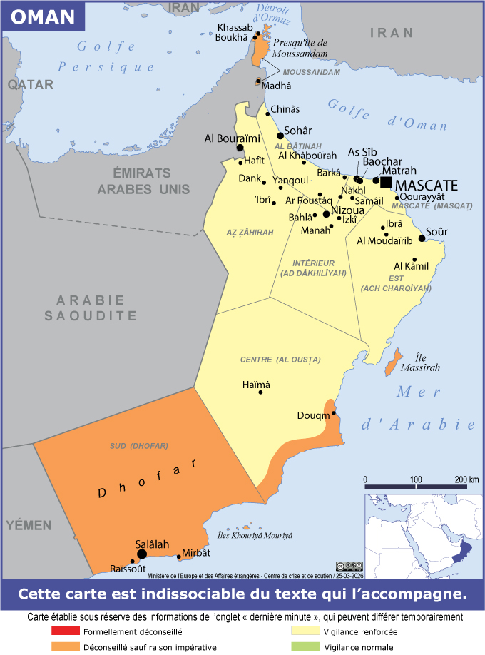 Oman Navigation latérale fiche pays Dans cette rubrique Oman Présentation d'Oman Conseils aux voyageurs Dernières minutes et alertes Sécurité Entrée / séjour Santé Informations utiles Voyages d'affaires Contacts utiles Politique et économie Relations bilatérales Sécurité Date de mise à jour le : 25 mars 2026 Information toujours valable à la date du jour Imprimer Imprimer Vous voyagez à l'étranger ? Pour recevoir des alertes, inscrivez-vous sur Fil d'Ariane. S'inscrire sur Fil d'Ariane Donnez-nous votre avis Aidez-nous à améliorer notre service en répondant à notre enquête. Répondre à l'enquête utilisateurs Fermer Vérifiez que vous êtes bien assurés Avant de voyager, il est indispensable de vérifier que vous êtes bien assuré Quelle est la portée des Conseils aux Voyageurs ? Zones de vigilance Dernière actualisation le 25/03/2026, information toujours valable à la date du jour Les Français, résidents comme de passage, sont invités à consulter régulièrement les messages de sécurité mis à jour sur le site Internet de l’ambassade de France à Mascate. Compte tenu de la situation régionale, les zones ci-dessous sont déconseillées sauf raison impérative (en orange sur la carte sécuritaire) Gouvernorat de Moussandam. Ile de Massirah. Gouvernorat du Dhofar. Bande côtière de la frontière yéménite jusqu’au nord de Douqm (ville de Sirab). Il est déconseillé de se rendre dans la zone frontalière du Yémen, sauf raison impérative. Les voyageurs qui pour cette raison souhaiteraient se rendre dans les zones frontalières de l’Oman avec le Yémen doivent prendre préalablement contact avec l’ambassade de France à Mascate. Les Français qui se rendent dans le gouvernorat du Dhofar en dehors de la frange côtière doivent s’assurer que les mesures adéquates ont été prises concernant leur sécurité personnelle et maintenir en toutes circonstances un niveau de vigilance renforcée. Il convient de se tenir informé de l’actualité générale et locale avant tout déplacement dans le Dhofar. Il est conseillé de laisser à ses proches des indications précises sur l’itinéraire, la destination et le calendrier de déplacement.Les détenteurs d’un passeport diplomatique ou de service doivent informer préalablement le ministère omanais des Affaires étrangères lorsqu’ils se rendent dans certaines zones du territoire (régions du Dhofar et de Mussamdam et île de Masirah). Risques encourus et recommandations associées Risque terroriste Le risque d’infiltrations au Dhofar de groupes armés à partir du Yémen doit être pris en compte, même si les autorités omanaises sont très vigilantes sur le contrôle aux frontières. Les Occidentaux, y compris les Français, doivent toutefois être particulièrement prudents car ils sont une cible désignée des groupes terroristes. Risque lié au transport maritime - Navigation La navigation de plaisance dans l’océan Indien en général demeure dangereuse, notamment à cause d’actes ponctuels de piraterie.Il est impératif de signaler tout projet de déplacement dans la région et de se soumettre au contrôle maritime volontaire en transmettant sa position et ses intentions aussi souvent que possible à : État-major ALINDIEN COMFOR EAU : par téléphone (+971 26 57 41 22 - +971 26 57 41 02 - +971 56 79 30 34) ou par courriel (alindien-comforeau@imfeau.ae : inscrire en objet « pour cellule contrôle naval ») ; Ambassade de France auprès du sultanat d’Oman : par téléphone : +968 24 681 809 ou +968 24 681 810. Il est fortement recommandé aux voyageurs empruntant des embarcations de vérifier au préalable qu’elles remplissent les conditions de sécurité requises par les autorités omanaises et d’exiger la mise à disposition de gilets de sauvetage pour tous les passagers. Manifestations Depuis 2013, le pays n’a connu que quelques manifestations, le plus souvent de faible ampleur, qui se sont déroulées dans certaines villes du pays. Il convient de se tenir à l’écart de tout rassemblement, de rester vigilant et de s’informer. Situation régionale La montée des tensions régionales peut avoir des répercussions sur la situation à Oman. L’évolution de la situation dans la région doit faire l’objet d’une attention constante et soutenue. Risques naturels Le pays est de plus en plus exposé à des épisodes de fortes intempéries, voire à des tempêtes tropicales. Ces intempéries entraînent des vents violents ainsi que des pluies fortes et extrêmement soudaines. Celles-ci provoquent la crue brusque des cours d’eau et wadis. Le phénomène, meurtrier à plusieurs reprises en 2024, s’avère très dangereux pour les campeurs et les promeneurs. Il convient donc en toute circonstances d’être attentif aux conditions météorologiques, de ne jamais s’aventurer dans des wadis en cas de risque de pluie, de ne pas chercher à traverser des routes inondées et de se conformer impérativement aux recommandations des autorités locales. Recommandations générales Informer les services consulaires de sa présence à Oman. Signaler tout incident de sécurité. Ne pas déroger aux mesures de sécurité élémentaires, en particulier dans certains faubourgs de la capitale et en camping. Respecter les us et coutumes locales et adopter en toutes circonstances un comportement discret (voir rubrique Infos utiles). La géographie du pays, composée de zones arides, et le très faible peuplement constituent des facteurs de risque. De larges zones du pays n’étant pas couvertes par le téléphone portable, il est conseillé de signaler à un tiers son itinéraire avant toute excursion et de voyager en groupe à plusieurs véhicules en étant muni du nécessaire (eau, nourriture, pharmacie). Il est déconseillé de pratiquer le camping seul. Activités sportives à risque Les excursions dans les régions désertiques (Wahibas, Rub al Khali, etc.) sont potentiellement d