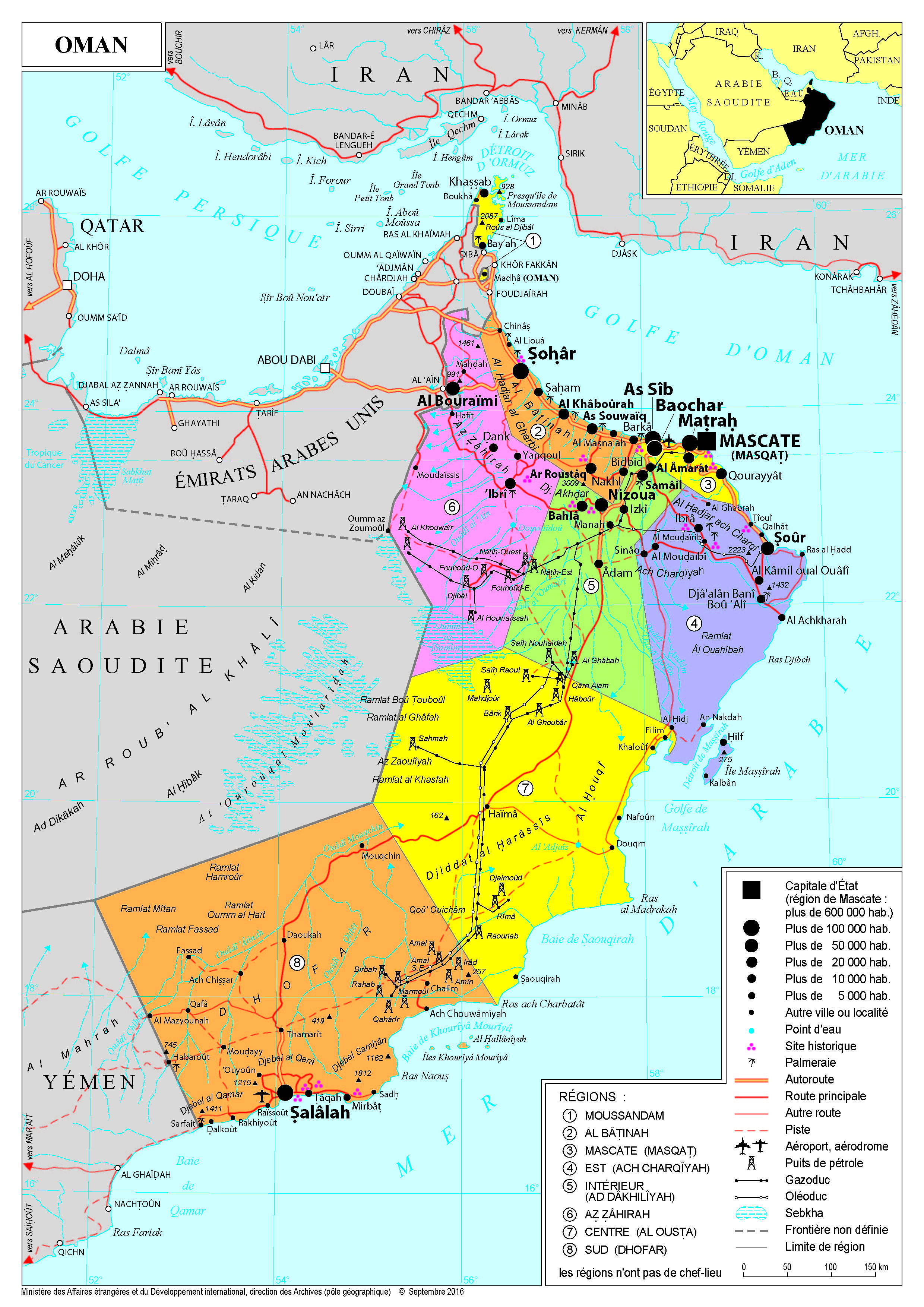 Oman Navigation latérale fiche pays Dans cette rubrique Oman Présentation d'Oman Conseils aux voyageurs Dernières minutes et alertes Sécurité Entrée / séjour Santé Informations utiles Voyages d'affaires Contacts utiles Politique et économie Relations bilatérales Présentation d'Oman Date de mise à jour le : 19 janvier 2026 Information toujours valable à la date du jour Présentation du pays Données générales Nom officiel : Sultanat d’OmanNature du régime : monarchieChef de l’Etat et du gouvernement : Sultan Haïtham bin Tarik al Saïd Données géographiques Superficie : 312.460 km2Capitale : MascateVilles principales : Salalah, Sur, Sohar, NizwaLangue (s) officielle (s) : arabeMonnaie : rial omanais (1 OMR = 2.38€ le 05/07/2023)Fête nationale : 18 novembre Données démographiques Population (2022) : 4.9 millions dont 2,1M d’expatriésDensité : 15 hab/km2 (2023)Croissance démographique (2021) -0.5%Espérance de vie (2020) : 75 ansTaux d’alphabétisation (2018) : 96 %Religion (s) : islam 85.9 % (majorité ibadite, minorités sunnite et chiite), hindouisme, christianismeIndice de développement humain (2021) : 0.816, 54ème pays Politique intérieure Exposé par sa situation géographique à plusieurs menaces transversales (trafics, migrations illicites, piraterie), Oman est un partenaire essentiel pour la sécurisation des routes maritimes régionales. Partageant avec l’Iran le contrôle du détroit d’Ormuz, naturellement tourné vers l’Asie et l’Afrique, le Sultanat reste fermement attaché à son rôle de médiateur entre l’Iran et l’Occident. Le Sultanat d’Oman est fortement marqué par le règne du sultan Qabous de 1970 à 2022, qui s’est caractérisé par le développement du pays et l’édification d’une administration qui ont fait d’Oman un pays moderne. Le Sultan Qabous a également fortement contribué à l’émergence d’une identité nationale en gommant les particularismes communautaires et en affaiblissant le rôle des tribus. Dès la fin des années 1990, il a engagé un processus d’ouverture constitutionnelle avec la création d’une commission nationale des droits de l’homme, de conseils municipaux, l’adoption d’une Loi fondamentale en 1996. Sans remettre en cause l’autorité du sultan, des revendications se sont fait jour dans la foulée des printemps arabes en 2011, auxquelles il a été répondu par une série de mesures sociales et politiques. Haïtham bin Tarik Al Saïd a succédé à son cousin germain, le sultan Qabous, décédé le 10 janvier 2020.Le nouveau sultan est arrivé au pouvoir dans une période difficile en matière économique et sanitaire. Il s’est assuré du soutien des forces armées en nommant son frère comme ministre de la Défense. Il a par ailleurs rompu avec le mode de transmission du pouvoir qui prévoyait jusque-là que le conseil de la famille royale (composé de 24 membres) choisisse, dans les trois jours suivant la vacance du trône, un successeur. Il a par la suite intégré dans la Loi fondamentale, en janvier 2021, un nouveau mécanisme successoral permettant de désigner un "Prince héritier, doté de charges et prérogatives spécifiques". Son fils Sayyid Dhi Yazan bin Haitham bin Tarik Al Saïd a été choisi. Cette annonce a été accueillie positivement, car vue comme un élément de stabilisation. Politique étrangère La diplomatie omanaise est fondée sur des principes constants : assurer à tout prix la sécurité régionale, en particulier celle du détroit d’Ormuz ; ne rompre les liens diplomatiques avec personne ; ne pas s’impliquer dans les conflits régionaux, mais proposer sa facilitation chaque fois qu’elle est acceptée. L’indépendance de la politique étrangère du Sultanat lui permet d’entretenir des relations de bon voisinage avec l’ensemble des pays de la région, notamment l’Iran, à rebours, jusqu’à peu, de plusieurs de ses partenaires du Conseil de coopération des Etats arabes du Golfe (CCEAG). Pour mémoire, Oman partage avec l’Iran le contrôle du détroit d’Ormuz. Le Sultanat s’est aussi positionné comme facilitateur des relations entre l’Iran et l’Occident ; En organisant des rencontres discrètes entre l’Iran et les Etats-Unis, Oman a accueilli les négociations entre 2013 et 2015 sur le programme nucléaire iranien. A l’issue de celles-ci un accord définitif a pu être trouvé le 14 juillet 2015. Le Sultanat joue aussi un rôle de facilitateur dans la crise yéménite, notamment entre l’Arabie saoudite et les Houthis, et s’efforce de soutenir la reprise du processus de transition politique. Mascate accueille d’ailleurs actuellement le bureau du porte-parole houthi Mohammed Abdelsalam. L’insécurité régionale a tout de même conduit Oman à rejoindre, en 2017, la coalition islamique militaire contre le terrorisme, formée par l’Arabie en 2015. Les relations avec l’Arabie saoudite se sont renforcées avec la première visite officielle du sultan Haïtham en juillet 2021 et celle en Oman du prince héritier saoudien en décembre 2021. Oman entretient des liens privilégiés avec la Grande-Bretagne, ancienne puissance "tutélaire", premier partenaire militaire et premier investisseur, et avec les Etats-Unis, garants de la sécurité du pays (accord de défense de 1980, accord de libre-échange en 2006). Bien qu’adossé à ses voisins de la Péninsule arabique, Oman a le regard tourné vers l’Océan Indien. Les flux de voyageurs et de marchandises avec le sous-continent indien et l’Afrique de l’Est sont le reflet de la réalité géographique et humaine omanaise. Le commerce international du Sultanat est largement orienté depuis une vingtaine d’années en direction de l’extrême Orient asiatique, plus de 80% des exportations de pétrole partant vers la Chine. Oman s’est par ailleurs rapproché d’Israël sans normaliser ses relations avec Tel Aviv : la visite du Premier ministre B. N