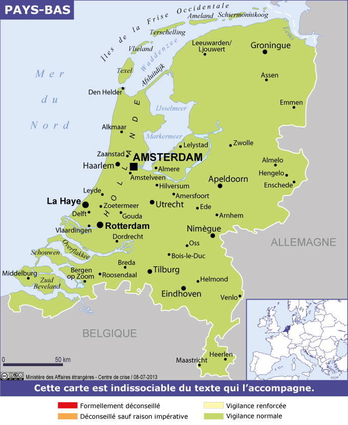 Pays-Bas Navigation latérale fiche pays Dans cette rubrique Pays-Bas Présentation des Pays-Bas Conseils aux voyageurs Dernières minutes et alertes Sécurité Entrée / séjour Santé Informations utiles Voyages d'affaires Contacts utiles Politique et économie Relations bilatérales Sécurité Date de mise à jour le : 27 mars 2026 Information toujours valable à la date du jour Imprimer Imprimer Vous voyagez à l'étranger ? Pour recevoir des alertes, inscrivez-vous sur Fil d'Ariane. S'inscrire sur Fil d'Ariane Donnez-nous votre avis Aidez-nous à améliorer notre service en répondant à notre enquête. Répondre à l'enquête utilisateurs Fermer Vérifiez que vous êtes bien assurés Avant de voyager, il est indispensable de vérifier que vous êtes bien assuré Quelle est la portée des Conseils aux Voyageurs ? Zones de vigilance Dernière actualisation le 11/03/2026, information toujours valable à la date du jour L’ensemble du territoire est en vigilance normale (en vert). Risques encourus et recommandations associées Terrorisme Le niveau d’attentat est considéré comme « substantiel » par les autorités néerlandaises (niveau 4 sur une échelle de 5). Une attitude générale de vigilance est recommandée dans les lieux publics, notamment aux heures de grande affluence. Délinquance Les Pays-Bas sont considérés comme relativement sûrs, néanmoins certains actes de délinquance (vols à la tire assez fréquents, vols dans les véhicules) sont recensés dans certains secteurs des grandes villes : Amsterdam : dans le secteur touristique (dont le « quartier rouge », à proximité de la gare) et secteur de Bijlmermeer ; Rotterdam : quartiers au sud de Feijenoord). Des vols peuvent également survenir lors de transits à l’aéroport de Schiphol et dans les trains entre Rotterdam, La Haye et Amsterdam. Une attention particulière est recommandée à bord de l’Eurostar. Phénomènes liés à la drogue Il convient d’être vigilant à l’encontre des rabatteurs qui invitent les étrangers à les suivre pour leur vendre des produits stupéfiants. Ils sont très actifs dans les gares, les quartiers touristiques, mais aussi sur les autoroutes du sud du pays (Hollande du Sud, dans la région de Rotterdam, Brabant, à Roosendaal ou Breda ; Zélande, à Terneuzen ; Limbourg, près de Maastricht), où leur conduite agressive provoque parfois des accidents graves. La possession de produits stupéfiants peut entraîner une interpellation par la police néerlandaise avec un risque de condamnation à une peine d’emprisonnement .Il est rappelé que la possession et la vente de drogues sont illégales aux Pays-Bas. Les vendeurs de rue, qui ciblent particulièrement les touristes, peuvent chercher à escroquer les acheteurs (farine, sucre, cachous, herbes, etc.), leur vendre des drogues de mauvaise qualité, mais aussi des produits hautement toxiques, voire mortels. La transaction peut également être l’occasion d’intimidations ou de vols. Tout comme en France, la conduite sous l’emprise de produits stupéfiants est interdite aux Pays-Bas et donne lieu à une interpellation systématique.Il convient également d’être vigilant à l’égard des risques de « spiking », consistant à droguer une personne (majoritairement une femme) à son insu en plaçant une substance qui altère son jugement dans sa boisson. Recommandations générales Il est recommandé d’éviter de se déplacer avec des objets de valeur et d’importantes sommes d’argen Liste des représentations françaises Ambassade de France aux Pays-Bas Anna Paulownastraat 76 2518 BJ La Haye Pays-Bas Tel : +31 70 312 58 00 Ambassade de France aux Pays-Bas Réseaux sociaux Facebook X Instagram YouTube Consulat général de France à Amsterdam De Boelelaan 7 1083 HJ Amsterdam Pays-Bas Tel : +31 20 249 9164 Consulat général de France à Amsterdam Représentation permanente de la France auprès de l’Organisation pour l’interdiction des armes chimiques (OIAC) | La Haye OIAC Ambassade de France Anna Paulownastraat 76 2518 BJ La Haye Pays-Bas Tel : (31) 0 70 312 58 00 Représentation permanente de la France auprès de l’Organisation pour l’interdic…