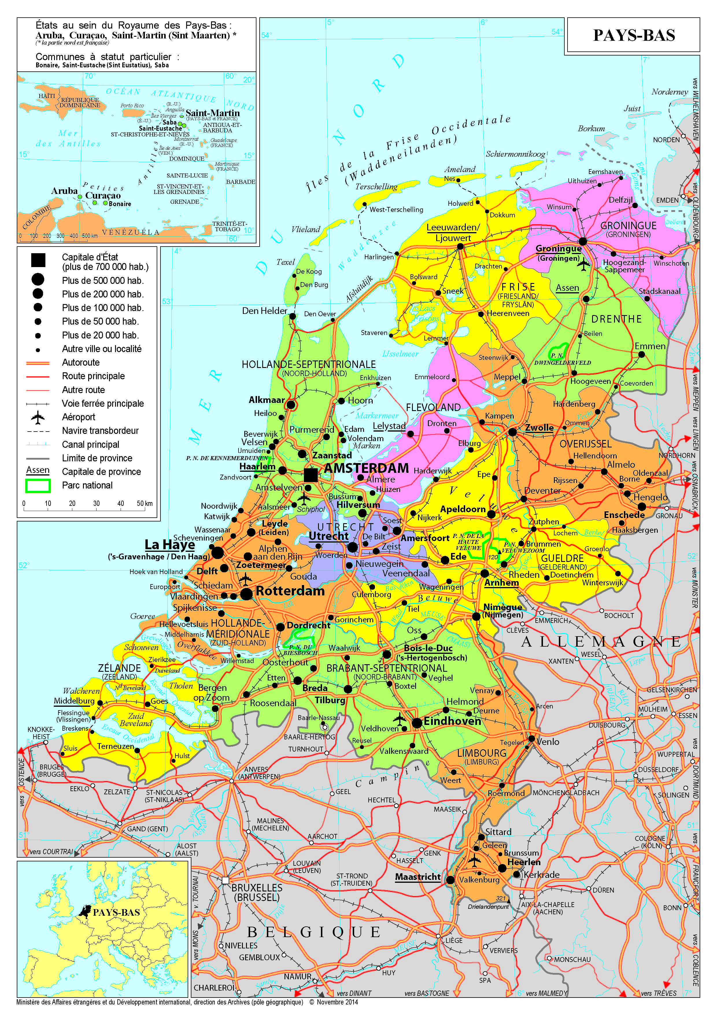 Pays-Bas Navigation latérale fiche pays Dans cette rubrique Pays-Bas Présentation des Pays-Bas Conseils aux voyageurs Dernières minutes et alertes Sécurité Entrée / séjour Santé Informations utiles Voyages d'affaires Contacts utiles Politique et économie Relations bilatérales Présentation des Pays-Bas Date de mise à jour le : 02 avril 2026 Information toujours valable à la date du jour Présentation du pays Données générales Nom officiel : Royaume des Pays-BasNature du régime : Monarchie constitutionnelle à régime parlementaireChef de l’État : le Roi Guillaume-Alexandre (Willem-Alexander) depuis le 30 avril 2013Chef du Gouvernement : M. Dick Schoof depuis le 2 juillet 2024 Données géographiques Superficie : 41 543 km2Capitale : Amsterdam (le gouvernement et les administrations centrales siègent à La Haye)Villes principales : Amsterdam, Rotterdam, La Haye, Utrecht, EindhovenLangue(s) courante(s) : néerlandais (langue officielle)Monnaie : EuroFête nationale : 27 avril (Koningsdag, anniversaire du Roi) Données démographiques Population : 18,10 millions (2025)Croissance démographique : 0,55 % / an (2024)Espérance de vie à la naissance : 81,9 ans (2024)Taux d’alphabétisation : 100 % (2025)Religions : catholiques (17 %), protestants (13 %), musulmans (6 %), sans appartenance religieuse déclarée (58 %) (2023).Indice de développement humain (rapport du PNUD 2022-2023) : 0,955 ; 8e rang. Politique intérieure Les Pays-Bas sont une monarchie constitutionnelle de longue tradition parlementaire. Le Roi Willem Alexander est le roi des Pays-Bas depuis le 30 avril 2013, à la suite de l’abdication de sa mère, la Reine Béatrix. Le Parlement néerlandais se compose de deux chambres. La Deuxième chambre (chambre basse - Tweede kamer) élabore les lois et contrôle l’action du gouvernement. Elle compte 150 députés élus au suffrage universel direct à la proportionnelle intégrale sur des listes nationales, pour un mandat de quatre ans. Ce mode de scrutin permet à de nombreux partis politiques d’y être représentés, nécessitant la formation de coalitions pour l’obtention d’une majorité. La Première chambre (chambre haute ou Sénat - Eerste Kamer) compte 75 membres élus au suffrage universel indirect par les douze provinces du royaume pour quatre ans. Son rôle dans le vote de la loi est restreint par rapport à celui de la Deuxième chambre, qui lui transmet après approbation les projets. Elle peut approuver ou rejeter un texte, sans y apporter d’amendement. La Chambre basse et la Chambre haute sont appelées ensemble les États généraux ou le Parlement. Après la chute de la coalition en juin 2025, des élections législatives ont été convoquées le 29 octobre. Le parti D66 (centre gauche, libéral), a remporté 26 sièges (+17 par rapport à 2023), tout comme le parti de droite radicale PVV (-11 sièges), mais avec une avance de 29 668 voix sur celui-ci. Le D66 et le PVV sont suivis par le VVD (libéraux) avec 22 sièges (-2), GroenLinks-PvdA (verts-travaillistes) avec 20 sièges (-5), le CDA (chrétiens-démocrates) avec 18 sièges (+13) et JA21 (droite radicale) avec neuf sièges (+8). Les partis négocient à présent un accord de coalition.Le gouvernement démissionnaire, qui n’est plus formé que par le VVD et le BBB (32 sièges sur 150 à la Chambre basse) reste en poste jusqu’à l’aboutissement des négociations de coalition. Il est mené par le Premier ministre Dick Schoof, ancien secrétaire général du ministère de la Justice et ancien directeur des services de renseignement. Dans son discours au Parlement le 3 juillet 2023, le Premier ministre avait rappelé l’engagement de son pays au sein de l’UE et de l’OTAN, réitéré le soutien apporté à l’Ukraine et s’était positionné en faveur de l’autonomie stratégique en matière d’énergie, de sécurité alimentaire et de matières premières. Il a également annoncé son intention de rouvrir le débat sur les accords européens en matière de migration ou d’agriculture, et d’arrêter toute surtransposition des normes dans le domaine environnemental. Politique étrangère La politique étrangère des Pays-Bas est caractérisée par un attachement au multilatéralisme, que les récentes crises ont renforcé : proactifs quant aux réformes de certaines institutions (OMC, OMS et OTAN), les Pays-Bas sont très attachés au système des Nations unies. Atlantistes, ils entretiennent des liens privilégiés avec les États-Unis, tout en ayant une relation commerciale substantielle avec la Chine. Les Pays-Bas accueillent de nombreuses institutions juridiques internationales à La Haye, tels que la Cour permanente d’arbitrage (CPA), la Cour internationale de justice (CIJ), ou encore la Cour pénale internationale (CPI) et l’Académie de droit international. La Haye est également le siège de l’Organisation pour l’interdiction des armes chimiques (OIAC). La ville accueille les Offices européen et Benelux des brevets, ou encore certains services de l’Agence spatiale européenne (EEAS), de l’OTAN et de l’Organisation pour la sécurité et la coopération en Europe (OSCE). S’y trouvent enfin les agences européennes Europol et Eurojust. Dans le contexte de la guerre en Ukraine et en cohérence avec leurs positions suite au crash du vol MH17, les Pays-Bas défendent une ligne de grande fermeté envers la Russie. Celle-ci s’est notamment traduite par une hausse du budget de la défense (augmentation de +25 % du budget de 2023 pour atteindre 2 % du PIB (25 Mds €) en 2025 et poursuite de l’augmentation pour 2026 (26,8Md€)), tout comme un soutien à l’Ukraine sur le plan bilatéral (envoi d’équipements y compris militaires défensifs et offensifs, parmi lesquels 24 avions F-16, et conclusion d’un accord bilatéral de sécurité sur 10 ans en mars 2024) et multilatéral (participation à la mission EUMAM Ukraine, formation avec le Danemar