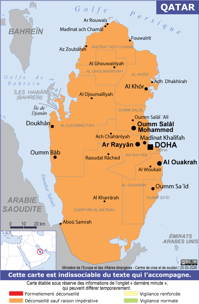 Qatar Navigation latérale fiche pays Dans cette rubrique Qatar Présentation du Qatar Conseils aux voyageurs Dernières minutes et alertes Sécurité Entrée / séjour Santé Informations utiles Voyages d'affaires Contacts utiles Politique et économie Relations bilatérales Sécurité Date de mise à jour le : 25 mars 2026 Information toujours valable à la date du jour Imprimer Imprimer Vous voyagez à l'étranger ? Pour recevoir des alertes, inscrivez-vous sur Fil d'Ariane. S'inscrire sur Fil d'Ariane Donnez-nous votre avis Aidez-nous à améliorer notre service en répondant à notre enquête. Répondre à l'enquête utilisateurs Fermer Vérifiez que vous êtes bien assurés Avant de voyager, il est indispensable de vérifier que vous êtes bien assuré Quelle est la portée des Conseils aux Voyageurs ? Zones de vigilance Dernière actualisation le 25/03/2026, information toujours valable à la date du jour Il demeure déconseillé aux ressortissants français, sauf pour des raisons impératives, de se rendre au Qatar. Compte tenu de la situation régionale, les voyages vers le Qatar sont déconseillés. Il convient de consulter régulièrement les mises à jour de ce site. Le taux de criminalité au Qatar est l’un des plus faibles du monde. Risque terroriste Pour rappel, le risque d’attentat étant élevé, les Français résidents ou de passage à l’étranger sont appelés à faire preuve de vigilance maximale. Il convient en particulier de se tenir à l’écart de tout rassemblement et d’être prudent à l’occasion des déplacements. Il est également recommandé de se tenir informé de la situation et des risques, en consultant les recommandations des Conseils aux voyageurs. Les Français de passage sont invités à s’enregistrer sur le fil d’Ariane, afin de recevoir les alertes concernant le pays où ils se trouvent. Recommandations générales Il est interdit de photographier des bâtiments publics ou des installations militaires. Il est recommandé de s’abstenir de photographier des Qatariens sans leur consentement. Il est préférable d’avoir les coordonnées téléphoniques et l’adresse courriel de l’ambassade de France sur soi pour parer à toute difficulté. Il est recommandé de se signaler auprès de l’ambassade en cas d’arrestation ou de détention. Risque lié au transport maritime – Navigation La navigation de plaisance dans l’océan Indien en général demeure dangereuse, notamment à cause d’actes ponctuels de piraterie.Il est impératif de signaler tout projet de déplacement dans la région et de se soumettre au contrôle maritime volontaire en transmettant sa position et ses intentions aussi souvent que possible à : > État-major ALINDIEN COMFOR EAU : par téléphone (+971 26 57 41 22 - +971 26 57 41 02 - +971 56 79 30 34) ou par courriel (alindien-comforeau@imfeau.ae : inscrire en objet « pour cellule contrôle naval »). Liste des représentations françaises Ambassade de France au Qatar West Bay, Diplomatic area PO Box 2669 Doha Qatar Tel : +974 77 81 62 81 Ambassade de France au Qatar Réseaux sociaux X Instagram YouTube