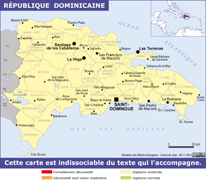 République dominicaine Navigation latérale fiche pays Dans cette rubrique République dominicaine Présentation de la République dominicaine Conseils aux voyageurs Dernières minutes et alertes Sécurité Entrée / séjour Santé Informations utiles Voyages d'affaires Contacts utiles Politique et économie Relations bilatérales Sécurité Date de mise à jour le : 30 mars 2026 Information toujours valable à la date du jour Imprimer Imprimer Vous voyagez à l'étranger ? Pour recevoir des alertes, inscrivez-vous sur Fil d'Ariane. S'inscrire sur Fil d'Ariane Donnez-nous votre avis Aidez-nous à améliorer notre service en répondant à notre enquête. Répondre à l'enquête utilisateurs Fermer Vérifiez que vous êtes bien assurés Avant de voyager, il est indispensable de vérifier que vous êtes bien assuré Quelle est la portée des Conseils aux Voyageurs ? Zones de vigilance Dernière actualisation le 12/03/2026, information toujours valable à la date du jour L’ensemble du territoire de la République dominicaine est en vigilance renforcée (en jaune sur la carte sécuritaire). Risques encourus et recommandations associées Risques juridiques Les touristes et résidents étrangers sont régulièrement les cibles privilégiées d’arnaques diverses et variées dont l’unique objectif est de soutirer une forte somme d’argent à la victime, soi-disant pour éviter des procédures judiciaires qui peuvent s’avérer longues, complexes et partiales. Les arnaques les plus courantes relèvent du secteur de l’immobilier (il est recommandé d’avoir recours à un conseil pour s’assurer que tous les papiers relatifs à la propriété sont en règle) et du secteur juridique (il est recommandé d’être particulièrement vigilant dans le choix d’un avocat, les cas d’allongements des procédures ou d’arrangements avec la partie adverses étant courants pour gonfler les honoraires). Attention également aux rencontres avec des Dominicains et Dominicaines, qui peuvent entrainer des recours devant les tribunaux pour des affaires d’agression ou de viol montées de toutes pièces dans le but d’obtenir des réparations financières, alors que la personne se présentait initialement comme consentante. Risques liés aux transports Les routes dominicaines sont dans l’ensemble de qualité, mais l’insécurité routière est très importante en raison des comportements aléatoires des automobilistes, des deux-roues et des piétons. Les traversées des grands axes routiers par les piétons et l’absence de respect des règles de circulation par les deux-roues occasionnent de nombreux accidents mortels. Il convient d’être particulièrement attentif et d’éviter, sauf raison impérieuse, de circuler la nuit. Pendant la saison des pluies, la circulation est rendue plus difficile et dangereuse en raison de l’accumulation d’eau sur les routes.Il est recommandé de verrouiller les portes et les vitres du véhicule, même en cas de stationnement de courte durée. Les sanctions sont sévères pour tout conducteur reconnu responsable d’un accident ayant entraîné des dommages corporels, allant jusqu’à l’emprisonnement. En cas d’accident grave dans la région de Saint-Domingue, mais également dans le Cibao et la Zone Nord, il convient d’appeler immédiatement le 911 et de se rendre dès que possible à la Casa de Conductores pour toutes les formalités consécutives à un accident. Il existe deux Casas de conductores : l’une à Saint-Domingue (193, av. Bolivar – Tél. : +1 809 3812424) et l’autre à Santiago (3, Calle 16 de agosto – Tél. : +1 809 2414848). Les secours routiers sont quasi inexistants en dehors de ces zones. Criminalité et délinquance La République dominicaine connaît depuis plusieurs années une progression de la délinquance et de la criminalité (du simple vol à l’arraché jusqu’aux agressions à main armée, de jour comme de nuit), liée notamment au trafic et à la consommation de stupéfiants, qui touche non seulement les Dominicains mais également les touristes et les résidents étrangers.Les principales zones touristiques du pays concernées sont : Bavaro – Punta Cana (et notamment la périphérie des nombreux hôtels « tout-inclus »), Saint-Domingue (notamment la Zone Coloniale) et la péninsule de Samana (notamment Las Terrenas). La plus grande prudence et le strict respect des recommandations de sécurité s’imposent lors des déplacements dans ces secteurs. Il est recommandé : de ne pas porter sur soi des objets de valeur (montre, bijoux…) et/ou d’importantes sommes d’argent ; de ne laisser ni document ni effets personnels dans les véhicules et d’éviter de se garer dans des endroits sans surveillance (vols par bris de glaces fréquents) ; de ne pas se promener avec son téléphone portable à la main et de ne pas consulter son téléphone portable dans sa voiture avec la fenêtre ouverte (les vols à l’arrachée de téléphones étant très fréquents). Risques naturels La République dominicaine est située dans une région fréquemment touchée par des catastrophes naturelles. La saison cyclonique s’étend de juin à novembre et se caractérise par des orages violents et de fortes rafales de vent, qui peuvent paralyser les transports et endommager les infrastructures. Il est conseillé aux voyageurs d’éviter de circuler pendant les tempêtes tropicales, les routes s’inondant très rapidement. Il est donc impératif de se tenir informé des conditions atmosphériques pendant toute cette période et d’appliquer à la lettre les recommandations des autorités locales et de l’ambassade. Consulter la fiche Risques climatiques (cyclones/ouragans). Les conditions météorologiques dans la zone Caraïbes peuvent être suivies sur les sites suivants : National Hurricane Center ; Météo France Antilles Guyane. L’ensemble du pays est fortement exposé au risque sismique. La République dominicain
