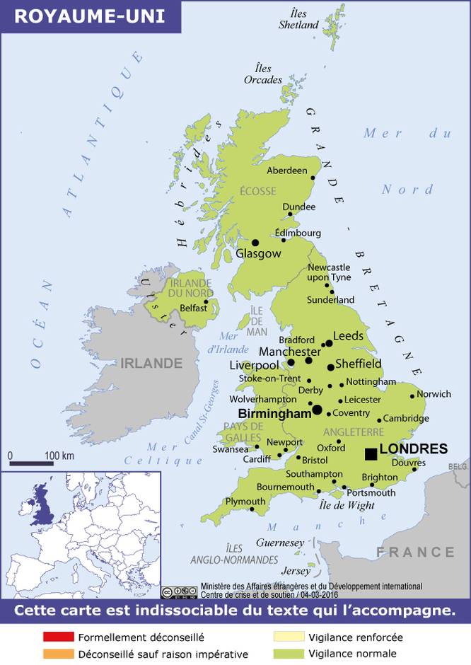 Royaume-Uni Navigation latérale fiche pays Dans cette rubrique Royaume-Uni Présentation du Royaume-Uni Conseils aux voyageurs Dernières minutes et alertes Sécurité Entrée / séjour Santé Informations utiles Voyages d'affaires Contacts utiles Politique et économie Relations bilatérales Sécurité Date de mise à jour le : 23 mars 2026 Information toujours valable à la date du jour Imprimer Imprimer Vous voyagez à l'étranger ? Pour recevoir des alertes, inscrivez-vous sur Fil d'Ariane. S'inscrire sur Fil d'Ariane Donnez-nous votre avis Aidez-nous à améliorer notre service en répondant à notre enquête. Répondre à l'enquête utilisateurs Fermer Vérifiez que vous êtes bien assurés Avant de voyager, il est indispensable de vérifier que vous êtes bien assuré Quelle est la portée des Conseils aux Voyageurs ? Zones de vigilance Dernière actualisation le 12/03/2026, information toujours valable à la date du jour Le territoire britannique est placé en vigilance normale. Risques encourus et recommandations associées Menace terroriste Le risque d’alerte terroriste au Royaume-Uni est actuellement classé au niveau 3 sur 5 "substantial" par les autorités du pays, y compris en Irlande du Nord. Il est recommandé : d’appliquer les recommandations des autorités : ne jamais laisser de bagages sans surveillance et signaler tout comportement ou objet suspect ; de faire preuve d’une grande vigilance dans les transports publics et les sites touristiques les plus fréquentés ; en cas d’attaque terroriste, de quitter les lieux rapidement, de se cacher en un lieu aussi sûr que possible, et d’informer les autorités (999). Délinquance de voie publique La police britannique lutte activement contre les incivilités sur la voie publique et en particulier contre les agressions physiques, notamment chez les jeunes. Il est interdit de porter ou transporter une arme blanche (couteau de poche, surtout avec mécanisme bloquant la lame, pointe, cutter…, etc.), du gaz de défense ou toute substance chimique susceptible d’être considérée comme une arme (acide). Il est recommandé : de ne pas faire étalage de bijoux, liquidités ou documents d’identité, notamment dans les zones touristiques, les lieux les plus fréquentés et les grandes villes ; de privilégier les trottoirs à contresens de la circulation (cas de vol à la tire par des conducteurs de scooters) ; d’éviter de se promener seul, de nuit, dans certains quartiers excentrés ou d’emprunter des rues isolées dans les grandes villes. Risque spécifique lié aux transports de type VTC Des cas de harcèlement sexuel ont été signalés, ayant pour auteurs des individus exerçant, parfois sans autorisation, une activité de véhicule de transport avec chauffeur. Il est conseillé, particulièrement de nuit, de ne se fier qu’aux services de transports accrédités par les grandes agglomérations (pour Londres : https://tfl.gov.uk/modes/taxis-and-minicabs/ - site en anglais). Sécurité routière Les règles de circulation sont quasiment identiques à celles en vigueur en France, mais la conduite à gauche requiert généralement un temps d’acclimatation. Le taux maximal d’alcool dans le sang est de 0,8 g/l en Angleterre et au Pays de Galles et 0,5 g/l en Écosse. En automobile, les limitations de vitesse normales (sauf indication contraire des panneaux de signalisation) sont les suivantes : 48 km/h sur voies urbaines ; 96 km/h sur voies non urbaines ; 112 km/h sur autoroutes et voies rapides. Des aménagements de vitesse sont en place pour les poids lourds, véhicules tractant des remorques ou autobus (https://www.gov.uk/speed-limits – site en anglais) Il est recommandé : à pied, d’être particulièrement vigilant lors de la traversée des voies et grands axes et de développer le réflexe de regarder d’abord à droite puis à gauche ; de ne traverser qu’aux endroits strictement prévus à cet effet. (Voir aussi la rubrique "Infos utiles") Recommandations générales De manière générale, il est conseillé : d’enregistrer dans son téléphone les numéros d’urgence : 999 (urgence absolue), 911 (contact avec la police), 101 (contact avec la police hors urgence), 111 (conseils médicaux gratuits par téléphone (NHS) ; de ne pas transporter tous ses papiers et son argent dans un seul sac et de sortir avec le strict minimum ; conserver en lieu sûr (dans le coffre de la chambre d’hôtel, par exemple) l’argent et les documents d’identité ou titres de voyage (ne circuler qu’avec une photocopie dans le périmètre de l’hôtel). En cas d’infraction à la loi britannique, tout voyageur s’expose à des sanctions pénales parfois très lourdes : peines d’amende assorties de peines d’emprisonnement immédiates. C’est le cas notamment pour coups et blessures (bagarres), port d’armes blanches et accusation d’agression sexuelle ou de viol pour lesquels les accusés devront pouvoir prouver le consentement de la victime présumée (voir rubrique « Législation locale »). L’abus d’alcool ou la consommation de drogue sont des facteurs aggravants. En cas d’arrestation, vos droits sont précisés sur le site gov.uk. Liste des représentations françaises Ambassade de France au Royaume-Uni 58 Knightsbridge Londres SW1X7JT Royaume-Uni Tel : +44 20 70 73 1000 Ambassade de France au Royaume-Uni Réseaux sociaux YouTube X Instagram Facebook Consulat général de France à Edimbourg Consulat général de France à Edimbourg Edimbourg EH1 1RF Royaume-Uni Tel : +44 13 1619 2828 Consulat général de France à Edimbourg Réseaux sociaux Facebook X Consulat général de France à Londres 21 Cromwell road Londres SW7 2EN Royaume-Uni Tel : +44 20 7660 4400 Consulat général de France à Londres Réseaux sociaux X Délégation de la France auprès de la Banque européenne pour la reconstruction et le développement (BERD) | Londres BERD 1 Exchange Square Londres EC2A 2EH Royaume-Uni Tel :