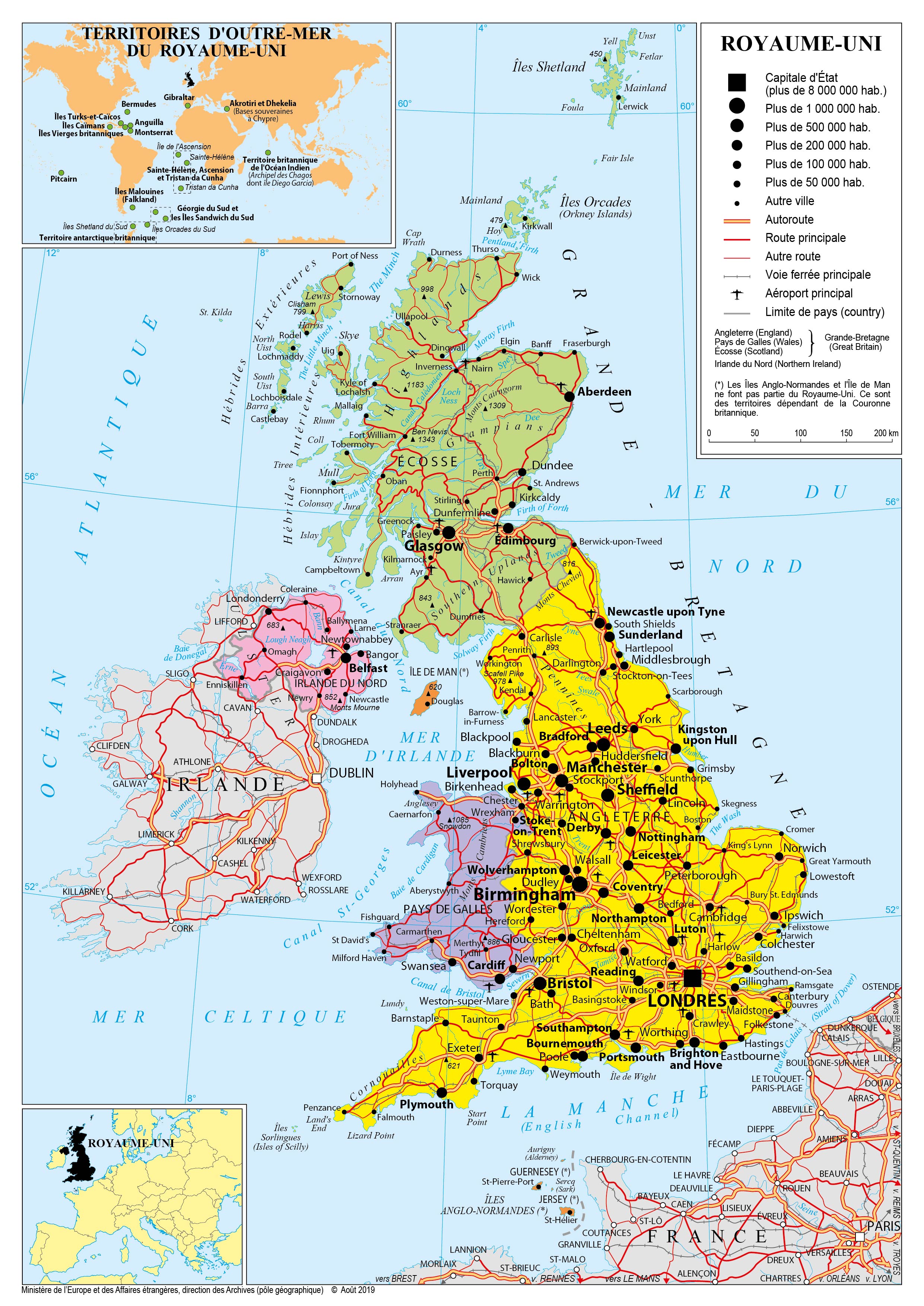 Royaume-Uni Navigation latérale fiche pays Dans cette rubrique Royaume-Uni Présentation du Royaume-Uni Conseils aux voyageurs Dernières minutes et alertes Sécurité Entrée / séjour Santé Informations utiles Voyages d'affaires Contacts utiles Politique et économie Relations bilatérales Présentation du Royaume-Uni Date de mise à jour le : 02 avril 2026 Information toujours valable à la date du jour Présentation du pays Données générales Nom officiel : Royaume-Uni de Grande-Bretagne et d’Irlande du NordNature du régime : Monarchie constitutionnelle. Démocratie parlementaire.Chef de l’Etat : Charles III, Roi du Royaume-Uni (depuis le 8 septembre 2022)Chef du gouvernement, Premier ministre : Keir Starmer (depuis le 5 juillet 2024) Données géographiques Superficie : 244 820 km²Capitale : Londres (London)Villes principales : Londres, Birmingham, Leeds, Liverpool, Glasgow, Sheffield, Manchester.Langue officielle : anglaisLangue courante : anglaisMonnaie : livre sterling - symbole : £ Données démographiques Population (2023) : 68,3 M d’habitants (estimation Office for National Statistics, ONS)Angleterre (2023) : 57,7M d’habitants ; dont Londres : 9M (estimations ONS)Écosse (2023) : 5,5M (estimation ONS)Pays de Galles (2023) : 3,2M (estimation ONS)Irlande du Nord (2022) : 1,9M (estimation ONS)Population active (2021) : 34,743M (donnée Banque mondiale)Densité (2023) : 280 habitants/km²Croissance démographique : entre 0,2 et 0,3 % d’ici 2050Religions : deux religions d’État, anglicanisme en Angleterre et presbytérianisme en Écosse Indice de développement humain (2022 - PNUD) : 0,940. 15e rang mondial (16e en 2016 et 28e en 2011) Politique intérieure Après 14 ans au pouvoir, les Conservateurs ont perdu les élections générales anticipées convoquées par Rishi Sunak le 4 juillet 2024. Les Travaillistes, menés par Keir Starmer, ont confirmé dans les urnes, avec l’obtention de 411 sièges (403 aujourd’hui), la large majorité que leur prédisaient les sondages. Le parti conservateur, avec 121 sièges, forme désormais l’Opposition officielle. Les Libéraux-démocrates ont remporté 72 sièges et Reform 5. Keir Starmer a pris ses fonctions le 5 juillet et s’est engagé à mener une politique de croissance avec comme priorités le renforcement de l’économie, la sécurité euro-atlantique et l’aide à l’Ukraine, ainsi que la lutte contre le dérèglement climatique. Parmi les premières mesures décidées se trouve l’abrogation de la « loi Rwanda », tout en maintenant une posture de plus en plus ferme sur l’immigration face à la montée du parti d’extrême-droite de N. Farage, Reform UK, aux dernières élections locales (1er mai 2025) comme dans les sondages. De nombreux investissements ont été annoncés en juin 2025 pour les infrastructures britanniques, la santé et la défense, dont le budget passera à 2,6% du PIB en 2027 avec pour ambition d’atteindre 3% d’ici 2030 et 5% d’ici 2035, conformément aux engagements des États-membres de l’OTAN lors du sommet de la Haye (24-25 juillet 2025). Politique étrangère Depuis son entrée en fonction, le gouvernement Starmer a affiché sa volonté d’un « nouveau départ » pour les relations entre le Royaume-Uni et l’Union européenne, tendues lors des négociations ayant conduit à la signature de l’Accord de retrait (24 janvier 2020) puis à l’Accord de commerce et de coopération (30 décembre 2020), les deux principaux textes encadrant aujourd’hui les rapports entre le Royaume-Uni et l’Union européenne. Sous le gouvernement Sunak, ces relations avaient déjà connu une phase d’amélioration. Le 27 février 2023, les négociations entre le Royaume-Uni et l’UE ont abouti à la signature du Cadre de Windsor, qui amende et complète le Protocole sur l’Irlande et l’Irlande du nord. L’accord entre la Commission européenne et le Royaume-Uni sur le retour des Britanniques à partir du 1er janvier 2024 dans les programmes Horizon Europe, Copernicus et Space Surveillance and Tracking a montré la poursuite du rapprochement entre Londres et Bruxelles. Le sommet UE-Royaume-Uni du 19 mai 2025 a permis de poursuivre ce rapprochement dans d’autres domaines d’intérêt commun (défense, sécurité, énergie, pêche). Le Royaume-Uni demeure un allié très proche des États-Unis et des pays de « l’Anglosphère », notamment en matière de défense et de renseignement. L’alliance dite des « Five Eyes » lie depuis la Seconde guerre mondiale ses services de renseignement à ceux des États-Unis, de l’Australie, du Canada et de la Nouvelle-Zélande. Le Royaume-Uni a été le premier pays à signer un accord commercial avec les États-Unis, le 8 mai 2025, après la mise en place des droits de douane par le Président Trump. Les pays du Commonwealth sont également des partenaires importants pour le Royaume-Uni, et un accord de libre-échange avec l’Inde a été signé le 6 mai 2025. Par ailleurs, le Royaume-Uni s’engage très intensément en soutien de l’Ukraine, dans le domaine de l’aide militaire et de la formation mais aussi sur les sanctions dans le format G7. Le président Zelensky a participé au sommet de la Communauté politique européenne organisé au palais de Blenheim (Oxfordshire) le 18 juillet 2024 puis, le lendemain, au Conseil des ministres à Londres, suivi d’un entretien à Downing Street avec le Premier ministre K. Starmer. Il s’est de nouveau rendu en visite à Londres le 10 octobre, puis le 2 mars 2025 pour participer au sommet sur l’Ukraine. Le 16 janvier, Keir Starmer s’est rendu à Kiev pour la première fois en tant que Premier ministre. Lui et V. Zelensky ont signé à cette occasion un « Partenariat centenaire » de coopération entre l’Ukraine et le Royaume-Uni. Situation économique Le Royaume-Uni était en 2024, avec un PIB de 3 645 Mds$, la 5e économie mondiale et la 2e économie européenne, derrière l’