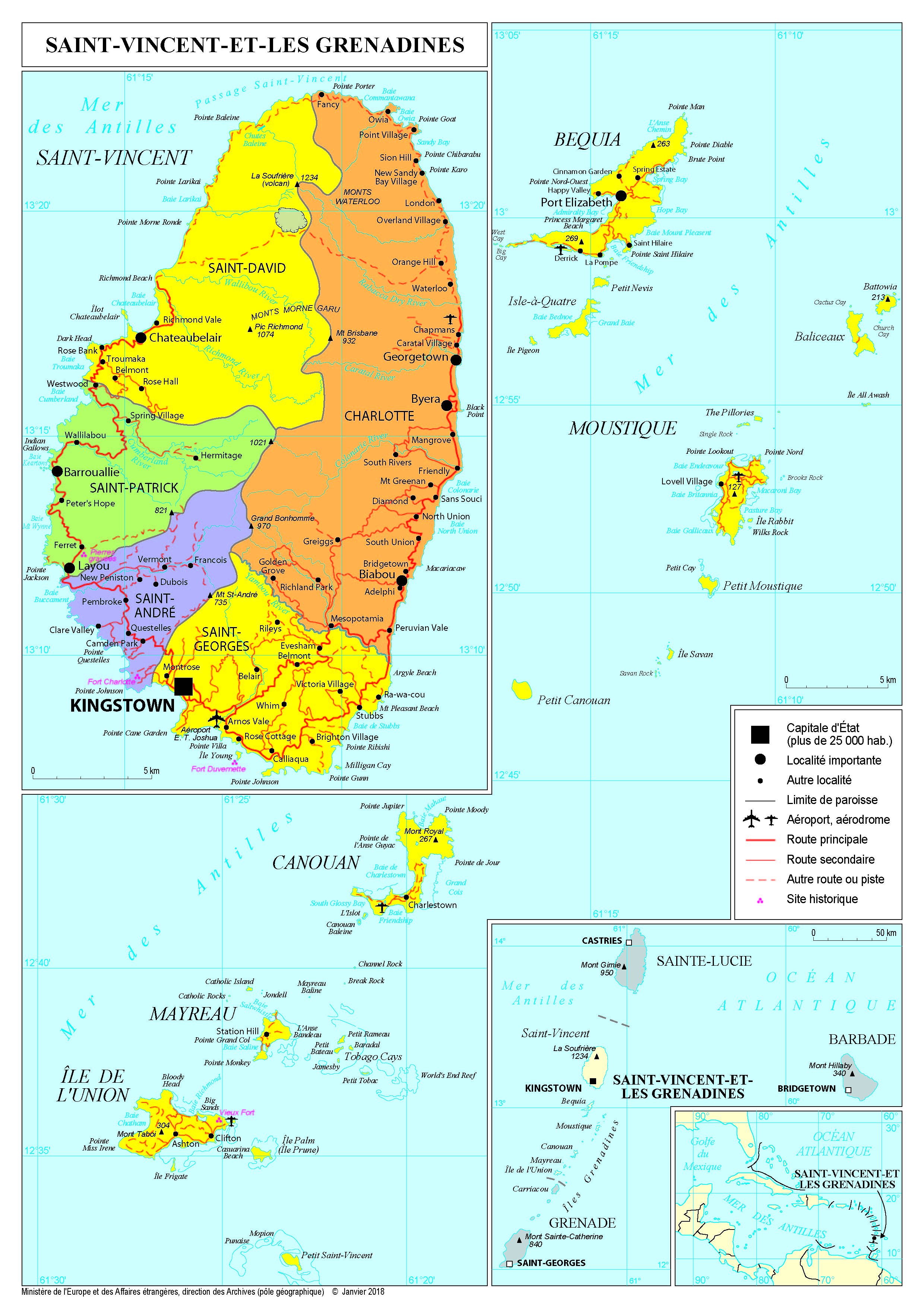 Saint-Vincent-et-les-Grenadines Navigation latérale fiche pays Dans cette rubrique Saint-Vincent-et-les-Grenadines Présentation de Saint-Vincent-et-les-Grenadines Conseils aux voyageurs Dernières minutes et alertes Sécurité Entrée / séjour Santé Informations utiles Voyages d'affaires Contacts utiles Politique et économie Relations bilatérales Présentation de Saint-Vincent-et-les-Grenadines Date de mise à jour le : 02 avril 2026 Information toujours valable à la date du jour Présentation du pays Données générales Nom officiel : Saint-Vincent-et-les-GrenadinesNature du régime : démocratie parlementaireChef de l’Etat : la Reine Elizabeth II, représentée par une Gouverneure générale, Susan Dilys DOUGAN (01/08/2019)Chef du Gouvernement : M. Ralph GONSALVES, Premier ministre depuis 2001. Données géographiques Superficie : 390 km²Capitale : KingstownVilles principales : Chateaubelair, GeorgetownLangue (s) officielle (s) : anglaisLangue (s) courante (s) : anglais, créole vincentais (base anglophone)Monnaie : Dollar des caraïbes de l’est ou EC$ (Eastern Caribbean dollar), lié au dollar américain au tauxfixe de 1 US$ = 2,70 EC$ depuis 1976 ; 1 EC$ = 0.3659 € au 1er août 2022 (taux de chancellerie)Fête nationale : 27 octobre (fête de l’Indépendance, 1979) Données démographiques Population (BM 2020) : 110 947 habitantsDensité (BM 2021) : 288 habitants / km²Croissance démographique (BM 2020) : 0,3 %Espérance de vie (PNUD 2018) : 75,8 ansTaux d’alphabétisation (PNUD 2018) : 88,1 %Religion(s) : Majorité christianismeIndice de développement humain (PNUD 2019) : 0,738 soit 97ème sur 189 Politique intérieure Parti majoritaire : le Unity Labor Party (ULP) du Premier ministre Ralph Gonsalves a remporté sans discontinuer les élections en 2001, en 2005, en 2010 et en 2015. En 2020, le parti l’a emporté de justesse face à l’opposition avec une minorité de suffrages mais un nombre accru de sièges (9 sur un total de 16). Autres partis représentés : Le New Democratic Party (NDP) fondé par James Fitz Allen Mitchell et dirigé aujourd’hui par Godwin L. Friday. Politique étrangère Saint-Vincent-et-les-Grenadines est membre de l’OECO, de la Communauté caraïbe (CARICOM) et de l’Association des Etats de la Caraïbe (AEC). Le pays a rejoint l’Alliance bolivarienne pour les Amériques (ALBA) en 2009. Il entretient des relations diplomatiques très étroites avec la République de Chine (Taïwan).Le montant de l’aide de l’Union Européenne dans le cadre du 11ème FED (2014-2020) s’élève à 7 M€ et se concentre sur l’appui à l’éducation et à la diversification économique. De même que tous les membres du CARIFORUM, Saint-Vincent a signé le 15 octobre 2008 à la Barbade l’Accord de partenariat économique avec l’Union européenne. En 2013, le premier ministre Saint-Vincentais a avancé l’idée de réparations financières que trois pays européens (France, Pays-Bas, Royaume-Uni) devraient à la Communauté caraïbe au titre de l’esclavage et de la traite humaine. Ce thème est régulièrement évoqué depuis lors par d’autres chefs de gouvernement de la zone comme Antigua et Barbuda, mais il ne donne lieu, à ce stade, à aucune suite concrète. Situation économique PIB (FMI 2020) : 0,81 Mds $USDRNB par habitant (BM 2020) 7298 $USDCroissance (BM 2020) : -5,5%Chômage (BM 2020) : 20,3 %Inflation (BM 2021) : 1,6 %Solde budgétaire (CIA WFB 2017) : -0,6 %Balance commerciale en % du PIB (BM 2020) : -17,63 %Principaux clients (FMI 2019) : Pays Bas, Trinité et Tobago, Barbade, Dominique.Principaux fournisseurs (FMI 20019) : USA, Pays bas, Trinité et Tobago, CanadaPart des principaux secteurs d’activités dans le PIB (BM 2016) : agriculture : 8 % industrie : 18 % services : 74 % Exportations de la France vers Saint-Vincent-et-les-Grenadines (en 2021 - DGT) : 18,8 M€Importations françaises depuis Saint-Vincent-et-les-Grenadines (en 2021 - DGT) : 0,3 M€ Pour aller plus loin : https://www.tresor.economie.gouv.fr/Articles/tags/Saint-Vincent-et-les-Grenadines Les services Saint Vincent et les Grenadines s’est progressivement reconverti en en une économie basée sur les services (y compris un pavillon de complaisance). En effet, la production bananière est en déclin depuis plus de vingt ans (passée de 21 % du PIB dans les années 90 à moins de 8 % actuellement). En 2017, un aéroport international a ouvert pour augmenter l’activité touristique et faciliter les échanges. Le gouvernement investit également dans la construction et dans des programmes sociaux afin de répondre aux éventuels chocs, mais sa dette publique, qui était de 67% du PIB à la fin de 2013 (82% en 2015 et 73,8% en 2017) est en augmentation constante. Les fortes disparités sociales allant de pair avec un niveau de chômage élevé qui touche particulièrement les jeunes sont, pour partie, compensées par les transferts des émigrés (plus de 20 % du PIB).Depuis 2020, le pays a subi le double choc de la pandémie mondiale de COVID 19 et de l’explosion du volcan la Soufrière en avril 2021 qui a fragilisé cette économie très dépendante du tourisme. Saint- Vincent-et-les-Grenadines ne figure plus sur la liste européenne des juridictions fiscales non coopératives depuis mars 2019.