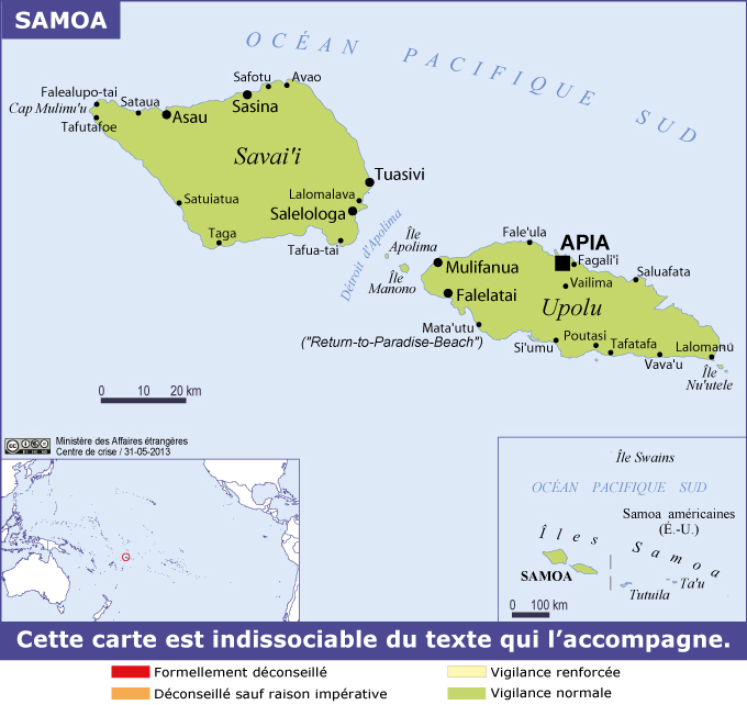 Samoa Navigation latérale fiche pays Dans cette rubrique Samoa Présentation de Samoa Conseils aux voyageurs Dernières minutes et alertes Sécurité Entrée / séjour Santé Informations utiles Voyages d'affaires Contacts utiles Politique et économie Relations bilatérales Sécurité Date de mise à jour le : 27 mars 2026 Information toujours valable à la date du jour Imprimer Imprimer Vous voyagez à l'étranger ? Pour recevoir des alertes, inscrivez-vous sur Fil d'Ariane. S'inscrire sur Fil d'Ariane Donnez-nous votre avis Aidez-nous à améliorer notre service en répondant à notre enquête. Répondre à l'enquête utilisateurs Fermer Vérifiez que vous êtes bien assurés Avant de voyager, il est indispensable de vérifier que vous êtes bien assuré Quelle est la portée des Conseils aux Voyageurs ? Avertissement L’ambassade de France à Wellington (Nouvelle-Zélande) est compétente pour Samoa.Elle peut être jointe au +64 4 384 25 55. En cas d’urgence absolue (accident, décès), durant la nuit, les jours fériés et week-ends, et en dehors des heures d’ouverture de la section consulaire, il est possible de joindre l’agent de permanence de l’Ambassade au + 64 21 399 309. Il est également possible de joindre la consule honoraire : Consule honoraire des Samoa rattachée à l’ambassade de France à Wellington (Nouvelle-Zélande)Tél. : +685 751 32 10 et +685 777 9482Courriel : zita chez polynesianxplorer.comAdresse : Polynesian Xplorer – Lautenau center PO BOX 2271, Apia, Samoa En cas d’incident grave dans le pays pendant son séjour, penser à rassurer ses proches. Zones de vigilance Dernière actualisation le 12/03/2026, information toujours valable à la date du jour L’ensemble de Samoa est placé en vigilance normale. Risques encourus et recommandations associées Activité cyclonique La saison cyclonique à Samoa s’étend de novembre à avril. Pendant cette période, il est fortement recommandé de suivre les alertes météorologiques par radio. Il est impératif de se conformer aux consignes de sécurité données par les autorités locales et de respecter le plan de sécurité dont disposent la plupart des hôtels et clubs de vacances. Délinquance Bien que le niveau de criminalité de droit commun reste faible, la petite délinquance et les agressions à caractère sexuel existent. Recommandations générales Il est recommandé de laisser en lieu sûr (coffre d’hôtel) vos passeports, billets d’avion, sommes en liquide ou chèques de voyage. Activités sportives à risque Les tour-opérateurs proposant des activités telles que la pêche, le surf ou la plongée appliquent des normes ne correspondant pas nécessairement aux standards européens. Vérifier que son assurance couvre la pratique des activités envisagées. Plusieurs noyades causées par les courants puissants de certains lagons ont été signalées. Se renseigner auprès des autorités et des tour-opérateurs sur les risques éventuels liés à la baignade.