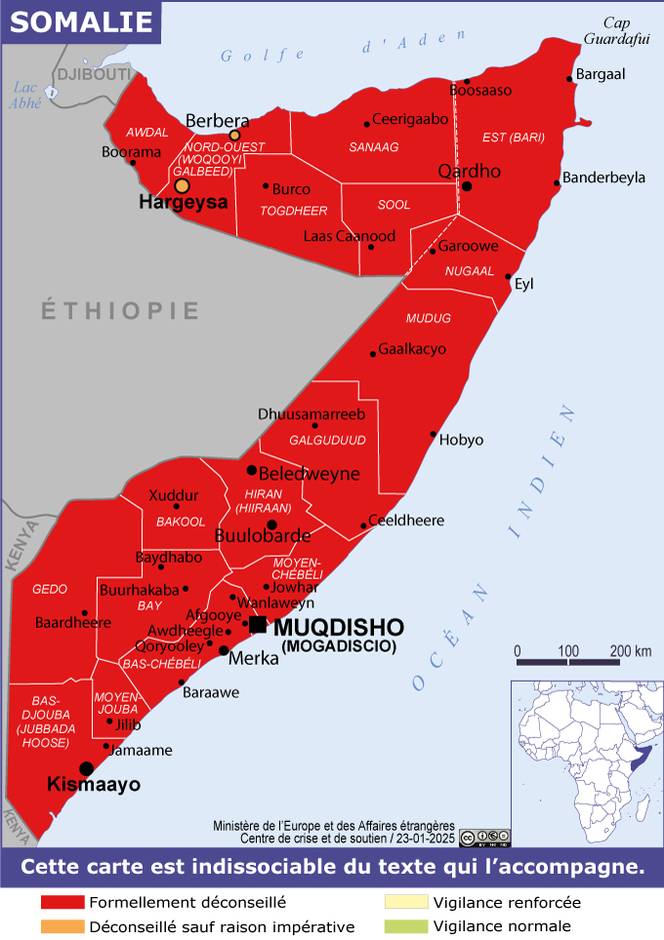 Somalie Navigation latérale fiche pays Dans cette rubrique Somalie Présentation de la Somalie Conseils aux voyageurs Dernières minutes et alertes Sécurité Entrée / séjour Santé Contacts utiles Relations bilatérales Sécurité Date de mise à jour le : 01 avril 2026 Information toujours valable à la date du jour Imprimer Imprimer Vous voyagez à l'étranger ? Pour recevoir des alertes, inscrivez-vous sur Fil d'Ariane. S'inscrire sur Fil d'Ariane Donnez-nous votre avis Aidez-nous à améliorer notre service en répondant à notre enquête. Répondre à l'enquête utilisateurs Fermer Vérifiez que vous êtes bien assurés Avant de voyager, il est indispensable de vérifier que vous êtes bien assuré Quelle est la portée des Conseils aux Voyageurs ? Zones de vigilance Dernière actualisation le 12/03/2026, information toujours valable à la date du jour Zones formellement déconseillées (en rouge sur la carte) Centre et sud du pays La milice islamiste Al Shabaab, liée à Al Qaida, contrôle une part importante du Sud et du centre de la Somalie : la moitié Est des provinces de Gedo et Bas-Djouba, la totalité du Moyen-Djouba, de larges portions des provinces de Bay, Bakool, Bas et Moyen-Shabelle, Hiran et Galgadud. Tout ressortissant français qui tenterait de pénétrer dans les territoires sous contrôle d’Al Shabaab s’exposerait immédiatement à un risque maximum d’enlèvement ou d’assassinat.Dans les zones et villes sous le contrôle du gouvernement, des administrations et milices locales alliées et de l’AUSSOM, des opérations de guérilla et de harcèlement sont lancées quotidiennement par les parties belligérantes.Des actes de terrorisme sont commis quotidiennement par Al Shabaab dans les principales localités du sud et du centre de la Somalie, en particulier à Mogadiscio : assassinats ciblés, engins explosifs improvisés, jets de grenade, attentats à la voiture piégée, commandos suicide. Le risque d’enlèvement, notamment de travailleurs humanitaires et de journalistes, est extrêmement élevé à Mogadiscio comme dans l’ensemble du sud et du centre de la Somalie. Puntland La situation au Puntland reste très volatile, en raison de la présence de miliciens d’Al Shabaab et de l’Etat Islamique, d’affrontements entre milices locales et de criminalité liée à la piraterie et aux trafics d’êtres humains. L’émergence d’une branche locale de Daech dans la région de Bari a considérablement renforcé le niveau de menace terroriste au Puntland, notamment à l’encontre des ressortissants étrangers. Le risque d’enlèvement est très élevé, notamment de la part de gangs liés à la piraterie et à des organisations terroristes. Somaliland La situation sécuritaire dans la province sécessionniste du Somaliland est précaire. Bien qu’aucun acte terroriste ne soit à relever depuis douze ans, le risque d’attentat demeure élevé, potentiellement contre des institutions « gouvernementales », mais aussi contre des organisations internationales et des ressortissants étrangers. Des affrontements périodiques avec des milices du Puntland sont également à signaler dans l’est du Somaliland, notamment dans la province de Sool. Les déplacements dans cette zone demeurent formellement déconseillés en-dehors de l’axe Hargeisa-Berbera. Zones déconseillées sauf raison impérative (en orange sur la carte) Hargeisa et Berbera Les villes d’Hargeisa et Berbera ainsi que l’axe reliant les deux villes sont déconseillées sauf raison impérative. Les déplacements dans cette zone doivent s’accompagner de mesures de sécurité adaptées : escortes, réduction de la durée de séjour en zone orange, hébergements sécurisés. Il convient de rester discret sur les itinéraires empruntés et les lieux de destination de ces déplacements.Il est recommandé de s’assurer que les lieux fréquentés (hôtels, restaurants, bars) sont suffisamment sécurisés : sas à l’entrée rigoureusement fermés, gardes armés, murs d’enceinte, issues de secours facilement accessibles.Avant tout déplacement dans cette zone, il est recommandé de se signaler auprès de l’ambassade de France à Nairobi. Risques encourus et recommandations associées Terrorisme La menace terroriste, visant aussi bien des bâtiments officiels que des lieux publics, notamment ceux fréquentés par les étrangers (hôtels, restaurants), est permanente en Somalie. Les risques d’enlèvements de ressortissants français par des organisations liées à des entités terroristes sont également très importants. Piraterie maritime Les actes de piraterie restent d’actualité au large des côtes somaliennes. Les navires de commerce et de plaisance peuvent faire l’objet d’attaques violentes avec prises d’otages. Les navires dont la vitesse est inférieure à 18 nœuds et dont le franc-bord est bas sur l’eau (hauteur de franc-bord inférieure à 8 mètres) représentent des proies de choix pour les pirates. La navigation de plaisance est formellement déconseillée dans la zone. Pour plus de détails, vous pouvez vous référer à la fiche thématique Piraterie maritime.Les armateurs et commandants de bâtiments doivent impérativement déclarer leurs mouvements auprès de l’opération de l’Union européenne EUNAVFOR-Atalanta et auprès du Contrôle naval volontaire français en océan Indien.En cas de présence dans la zone, il est recommandé de se signaler impérativement au MSCIO (The Maritime Security Centre for the Idian Ocean) contrôle naval volontaire mis en place dans le cadre de l’Opération Atalanta/ +33 (0) 298 220 220 ou +33 0 298 220 170) et à la cellule de permanence de l’autorité française sur cette zone maritime (Alindien : +971 265 74 265). Recommandations générales Il est extrêmement difficile et donc formellement déconseillé aux personnes isolées de se déplacer dans la totalité du pays, où aucune garantie de sécurité ne peu