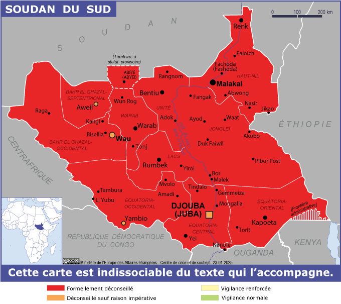 Soudan du Sud Navigation latérale fiche pays Dans cette rubrique Soudan du Sud Présentation du Soudan du Sud Conseils aux voyageurs Dernières minutes et alertes Sécurité Entrée / séjour Santé Informations utiles Voyages d'affaires Contacts utiles Politique et économie Relations bilatérales Sécurité Date de mise à jour le : 01 avril 2026 Information toujours valable à la date du jour Imprimer Imprimer Vous voyagez à l'étranger ? Pour recevoir des alertes, inscrivez-vous sur Fil d'Ariane. S'inscrire sur Fil d'Ariane Donnez-nous votre avis Aidez-nous à améliorer notre service en répondant à notre enquête. Répondre à l'enquête utilisateurs Fermer Vérifiez que vous êtes bien assurés Avant de voyager, il est indispensable de vérifier que vous êtes bien assuré Quelle est la portée des Conseils aux Voyageurs ? Avertissement L’ambassade de France au Soudan du Sud (Djouba) dispose de capacités limitées pour venir en aide aux Français en cas de crise. Les Français qui se rendent dans le pays sont responsables de leur propre sécurité. Ils sont invités à s’assurer qu’ils disposent de moyens nécessaires en cas de crise (notamment assurances et moyens financiers pour couvrir d’éventuels frais d’hospitalisation ou d’évacuation). L’ambassade de France à Djouba ne délivre pas de titre d’identité et de voyage. En cas de perte ou de vol de passeport, l’ambassade pourra néanmoins émettre un laissez-passer. Ce titre d’urgence permet uniquement de se rendre en France, où il sera possible de faire renouveler le titre en question. La section consulaire de l’ambassade de France à Addis Abeba (Ethiopie) est compétente pour toutes les autres démarches administratives concernant les Français résidents ou de passage au Soudan du Sud. Toutes les informations nécessaires figurent sur le site de l’ambassade de France. En cas d’urgence, l’ambassade de France à Djouba peut être jointe au + 211 927 690 000, tous les jours de la semaine, 24 heures sur 24. L’ambassade de France à Addis Abeba peut être jointe au + 251 (0)911 20 88 95. En cas d’incident grave dans le pays pendant votre séjour, pensez à rassurer vos proches. Zones de vigilance Dernière actualisation le 12/03/2026, information toujours valable à la date du jour Zones formellement déconseillées L’ensemble du territoire sud-soudanais, à l’exception de sa capitale et des villes de Wau, Yambio et Aweil, est placé en zone formellement déconseillée. La situation sécuritaire globale constitue un risque pour les voyageurs dans un pays dont l’État n’est en mesure d’assurer ni la sécurité des biens et des personnes sur un territoire qu’il ne contrôle pas intégralement, ni le fonctionnement des services essentiels (eau, électricité, hôpitaux, forces de sécurité), alors que la majorité de la population vit en dessous du seuil de pauvreté et se trouve en situation de forte insécurité alimentaire. Zones déconseillées sauf raison impérative À Djouba, ainsi que dans les villes de Wau, Yambio et Aweil, la situation est dans l’ensemble calme et le niveau de criminalité est contenu. Les déplacements pour motifs professionnels peuvent être envisagés, sous réserve de se rendre dans ces villes exclusivement par voie aérienne et d’appliquer des règles strictes de sécurité. Dans ces zones, il est recommandé de veiller à la sécurité de ses lieux de vie et de travail et de ne se déplacer qu’en véhicules motorisés (les deux-roues sont à exclure). Il convient d’éviter les déplacements de nuit, où les accidents de la route sont plus nombreux et les risques d’incidents plus fréquents. La situation aux nombreux points de contrôle mis en place la nuit peut en outre dégénérer à tout moment (menaces, extorsion etc.). Risques encourus et recommandations associées Risque socio-politique Le Soudan du Sud est en proie à un conflit interne depuis 2013. L’accord de paix du 12 septembre 2018 s’est traduit par une baisse significative des affrontements violents entre les forces gouvernementales et celles de l’opposition ou des milices locales. Toutefois, cette stabilisation est fragile, et le contexte social, politique et sécuritaire demeure très volatile dans la mesure où les forces belligérantes n’ont pas encore été désarmées et qu’un grand nombre d’armes circulent dans le pays. De nombreux conflits locaux, d’origine ethnique ou liés à des luttes pour des ressources, en particulier le bétail, débouchent régulièrement sur des violences. Les déplacements par voie terrestre au Soudan du Sud sont formellement déconseillés. Il est recommandé de : Se tenir régulièrement informé de l’évolution de la situation sécuritaire via les médias locaux et internationaux. Se tenir éloigné de tout rassemblement. Veiller à séjourner dans un lieu sécurisé et à limiter ses déplacements. Organiser autant que possible son séjour en s’appuyant sur une structure encadrante disposant d’un plan de sécurité. Garder à disposition immédiate des stocks de vivres et ses documents d’identité et de voyage. S’assurer de disposer des moyens financiers et des assurances nécessaires en cas de crise et définir un plan de confinement. Criminalité La criminalité touche l’ensemble du pays. Des agressions sont régulièrement rapportées (vols à main armée, vols avec effraction, enlèvements etc). Les étrangers ne sont pas spécifiquement visés mais peuvent être victimes de ces attaques. Il convient de maintenir une vigilance élevée à tout moment et de limiter au maximum les déplacements, particulièrement de nuit. Il est recommandé d’éviter tout signe ostentatoire de richesse et de laisser ses objets de valeur dans des lieux sécurisés. Des enlèvements surviennent occasionnellement et pourraient se multiplier sur la plupart des axes routiers, en raison de la détérioration de la situation socio-