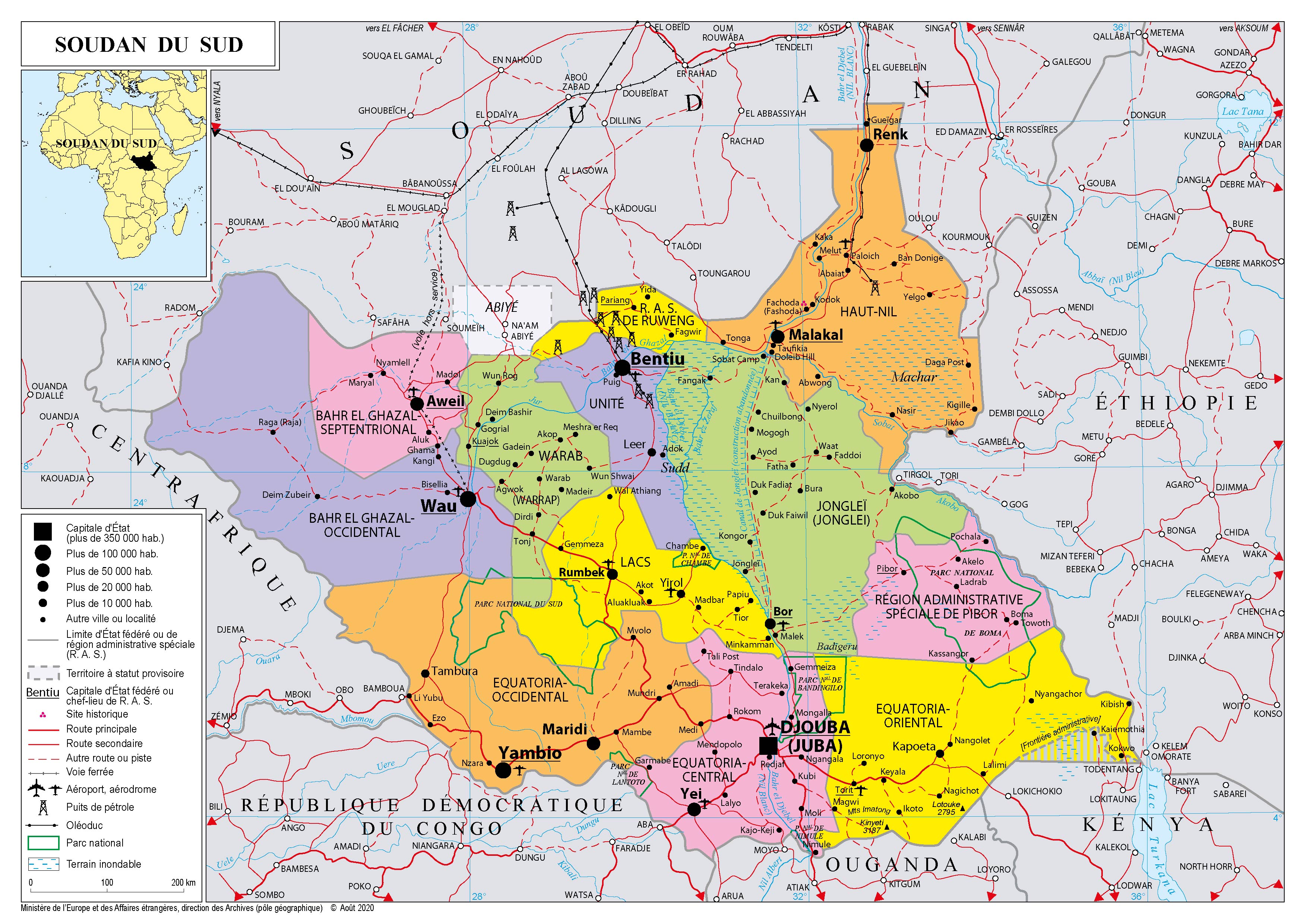 Soudan du Sud Navigation latérale fiche pays Dans cette rubrique Soudan du Sud Présentation du Soudan du Sud Conseils aux voyageurs Dernières minutes et alertes Sécurité Entrée / séjour Santé Informations utiles Voyages d'affaires Contacts utiles Politique et économie Relations bilatérales Présentation du Soudan du Sud Date de mise à jour le : 03 avril 2026 Information toujours valable à la date du jour Présentation du pays Données générales Nom officiel : République du Soudan du SudNature du régime : PrésidentielOrganisation de l’Etat : République fédéraleChef de l’Etat : Salva Kiir Mayardit (né le 13 septembre 1951), élu en avril 2010.Fête nationale : 9 juilletLangue officielle : anglaisLangues courantes : anglais, arabe (jubarabic), langues locales (dinka, nuer, shilluk, zande, bari)Monnaie : livre sud-soudanaise (SSP) Données géographiques Superficie : 644 329 km²Capitale : DjoubaVilles principales : Wau, Malakal10 Etats fédérés et 3 régions administratives spéciales (Abyei, Ruweng et Pibor)Langue officielle : AnglaisLe Soudan du Sud est traversé par le Nil Blanc. La végétation aquatique sur le fleuve crée une des plus vaste zone marécageuse au monde dans le centre du pays, le Sudd.Le climat alterne entre saison sèche l’hiver et saison des pluies l’été. Données démographiques Population : 12,34 millions d’habitants (UNDP, 2020)Croissance démographique : +1,18 % (Banque mondiale, 2020)Espérance de vie : 58 ans (Banque mondiale, 2020)Taux d’alphabétisation : 34,5 % des plus de 15 ans (ONU, 2020)Religions : majorité chrétienne, minorités musulmanes et animistes.Indice de développement humain : 0,433 – 185e sur 189 pays (2020) Politique intérieure Plus jeune pays au monde depuis son indépendance, proclamée le 9 juillet 2011, le Soudan du Sud a sombré dans une guerre civile en décembre 2013 lorsque le Président Salva Kiir a accusé son ancien Vice-Président Riek Machar d’avoir tenté un coup d’Etat. Cet évènement a déclenché un crise politique d’une extrême complexité, qui s’est traduite par des affrontements entre les deux camps, représentant sur fond les deux principaux groupes du pays, les Dinka et les Nuer. Malgré un accord de paix signé en août 2015 (ARCSS), le conflit a repris en juillet 2016 à Djouba, trois mois après le retour de Riek Machar dans la capitale. Le 12 septembre 2018, les belligérants ont signé la revitalisation de l’Accord de paix de 2015, l’ARCSS-R, obtenue sous l’égide de l’IGAD et grâce aux parrainages du Soudan et de l’Ouganda. Il prévoyait une période de pré-transition de 8 mois, suivie d’une période de transition de trois ans. Après deux prolongations de la période de pré-transition, un Gouvernement d’union nationale de transition (TGoNU) a été formé le 22 février 2020. Riek Machar a retrouvé son poste de Premier Vice-Président. Le cabinet ministériel a été formé le 12 mars 2020, dix-huit mois après la signature de l’Accord de paix revitalisé. La formation du gouvernement a ouvert une période de transition de trois ans, qui doit conduire le Soudan du Sud à des élections en 2023. Après plus de deux ans de tractations entre les parties, Salva Kiir et Riek Machar se sont accordés, le 3 avril, sur la répartition des postes de commandements dans les forces armées. Ce développement a mis fin à une escalade de tensions et a marqué un progrès dans la mise en œuvre de l’Accord de paix. Il doit désormais être suivi de la formation des forces armées réunifiées (NUF), composées d’une partie des troupes de l’ensemble des signataires de l’Accord de paix, et de leur déploiement sur le territoire. Le Soudan du Sud a pour objectif d’organiser des élections générales à l’issue de la période de transition. Cette organisation constitue un important défi logistique, qui nécessite l’achèvement au préalable de plusieurs réformes institutionnelles. La situation intérieure du Soudan du Sud demeure fortement dégradée. Des violences de grande ampleur subsistent au niveau local, avec un effritement local du cessez-le-feu. Sur le plan humanitaire, le pays est également très durement touché. En 2022, 8,9 millions de Sud-Soudanais ont besoin d’une aide humanitaire d’urgence, soit près de 75% de la population. 2,34 millions de Sud-Soudanais sont réfugiés dans les pays voisins et 2 millions sont déplacés. Les violations des droits de l’Homme restent massives, notamment à l’encontre des femmes. Politique étrangère Relations avec le Soudan La relation du Sud avec Khartoum a été marquée par deux guerres civiles avant l’indépendance (1955-1972 et 1983-2005). Le Comprehensive Peace Agreement de 2005 a ouvert la voie à l’indépendance, concrétisée le 9 juillet 2011, six mois après le référendum à cet effet. Malgré plusieurs accords bilatéraux signés en 2012, qui prévoyaient des mesures de sécurisation de la frontière et un accord de partage pétrolier, plusieurs points demeurent en suspens, notamment la région disputée d’Abyei à cheval entre les deux pays et au sous-sol riche en hydrocarbures.Les autorités soudanaises ont parrainé avec l’Ouganda la médiation qui a conduit à l’Accord de 2018. Depuis, les deux Soudans ont poursuivis leur rapprochement, notamment dans le contexte de la transition politique à Khartoum. Le Soudan du Sud a hébergé en 2019 et 2020 les négociations de paix entre les autorités soudanaises et les mouvements rebelles du Darfour, du Sud-Kordofan et du Nil Bleu, qui ont permis la signature des Accords de paix de Djouba le 3 octobre 2020. Le dialogue politique bilatéral reste nourri, à l’image du déplacement au printemps 2022 du général Hemedti à Djouba pour la signature de l’accord sur la répartition du commandement militaire. Relations avec l’Ouganda Depuis son arrivée au pouvoir, le Président Yoweri Museveni a apporté son soutien 