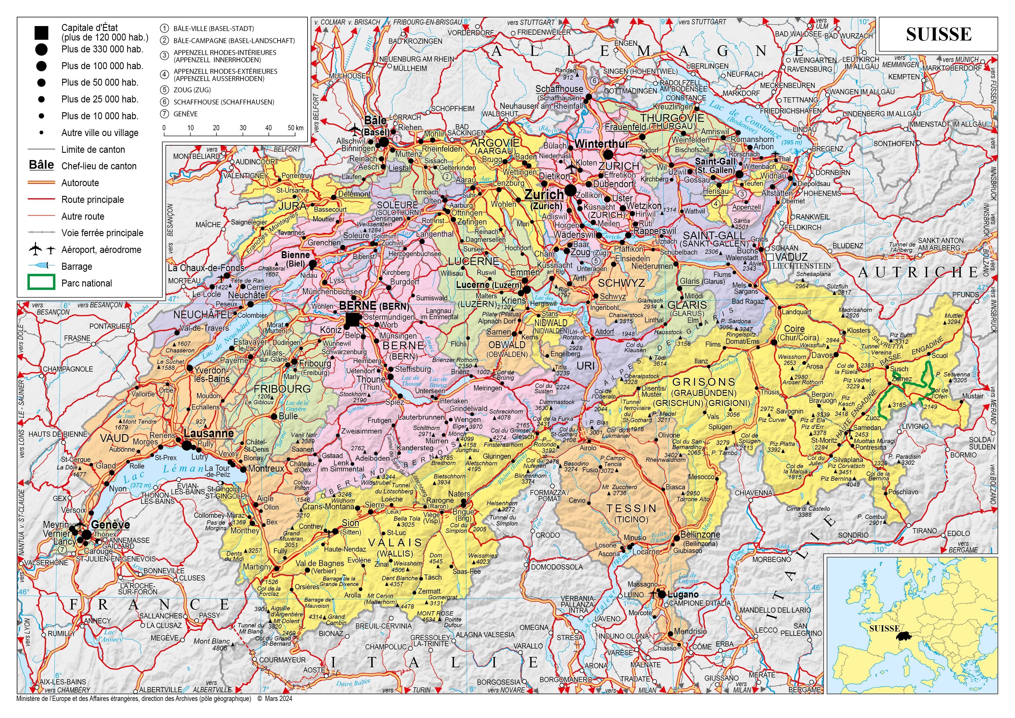 Suisse Navigation latérale fiche pays Dans cette rubrique Suisse Présentation de la Suisse Conseils aux voyageurs Dernières minutes et alertes Sécurité Entrée / séjour Santé Informations utiles Voyages d'affaires Contacts utiles Politique et économie Relations bilatérales Présentation de la Suisse Date de mise à jour le : 03 avril 2026 Information toujours valable à la date du jour Présentation du pays Données générales Nom officiel : Confédération suisseNature du régime : État fédéral – démocratie semi-directe Président de la Confédération : Guy Parmelin, président de la Confédération pour l’année 2026 Données géographiques Superficie : 41 285 km2Capitale : Berne (133 900 hab.)Villes principales : En milliers d’habitants (2019) : Zurich (415,4), Genève (201,8), Bâle (172,3), Lausanne (139,1) (source : Office fédéral de la statistique) 12 % de la population suisse vit dans ces cinq villes.Langue (s) officielle (s) : allemand, français, italien, romancheLangue (s) courante (s) : allemand, français, italienMonnaie : franc suisse (CHF)Fête nationale : 1er août Données démographiques Population (en millions) : 8,7 au 31 décembre 2020 (source : Office fédéral de la statistique) Densité : 206,53 habitants au km² en 2018 (source : Office fédéral de la statistique)Croissance démographique : 0,7 % (2020)Espérance de vie (2021) : 81,9 ans pour les hommes et 85,9 ans pour les femmesTaux d’alphabétisation : 99,6 %Religion (s) : catholiques romains (34 %), protestants (26,9 %), autres communautés chrétiennes (5,7 %), communautés juives (0,2 %), communautés musulmanes (5,5 %), sans appartenance religieuse (26,3 %) autres (7,4 %) en 2019Indice de développement humain : 0,955 – 2e rang avec l’Irlande (2022) Politique intérieure La Confédération suisse a été fondée en 1291. Elle est l’aboutissement d’un processus de rapprochement entre des cantons, différenciés les uns des autres par leurs langues puis par leurs religions, mais unis dans leur opposition à des voisins puissants. État fédéral depuis 1848, sa structure constitue un modèle singulier, considéré comme la clé du succès national. Sa politique interne se caractérise par la recherche du consensus dans les affaires communes. La nature des institutions politiques du pays souligne cette volonté de prévenir les tensions internes : les singularités locales sont défendues par un fédéralisme garantissant d’importantes prérogatives aux 26 cantons. Il s’agit d’un système politique à trois niveaux : la Confédération, les cantons et les communes. À l’échelle nationale : la Confédération La Suisse est une démocratie semi-directe. La Confédération dirige les affaires qui sont hors des domaines de compétence des cantons, telles que la défense ou la monnaie, et établit le budget et le compte de l’État fédéral. Au plan international, elle décide de la politique étrangère et représente la Suisse à l’étranger. Le Conseil fédéral, organe collégial élu par le Parlement, exerce le pouvoir exécutif. Il est composé de 7 Conseillers fédéraux. Ils sont théoriquement élus pour 4 ans par l’Assemblée fédérale, quelques mois après les élections fédérales. Toutefois l’usage veut que les Conseillers fédéraux soient maintenus jusqu’à leur démission, généralement après une dizaine d’années de fonction. Depuis 1848, seuls 4 conseillers fédéraux n’ont pas été réélus. Depuis 1959, une règle tacite, dite « formule magique », régit l’attribution des sièges au conseil fédéral : les trois premiers partis aux élections fédérales ont chacun deux sièges, et le quatrième en a un. La présidence est assurée alternativement par chacun des conseillers fédéraux, pour des mandats d’une année. Le président de la Confédération est un primus inter pares (le « premier entre ses pairs ») parmi les conseillers fédéraux ; il est élu par le Parlement en respectant la règle non écrite de l’ancienneté : en décembre 2025, le Parlement suisse a ainsi désigné le Conseiller fédéral chargé de l’Économie, de la Formation et de la Recherche Guy Parmelin (UDC), Président de la Confédération pour l’année 2026. Il succède à la libérale Karin Keller-Sutter (PLR). Ignazio Cassis (PLR), élu vice-président pour 2026, prendra la présidence en 2027. Les Suisses ont non seulement le droit d’élire des représentants lors des élections législatives ou exécutives, mais peuvent également faire un dépôt d’initiative populaire (élaboration d’un texte visant à modifier la Constitution sur un point par un comité d’initiative de 7 à 27 citoyens suisses puis récolte de cent mille signatures en 18 mois) ou faire une demande de référendum (droit du peuple de demander la modification d’une loi ou d’un arrêté fédéral après son adoption par le Parlement), ce qui donne lieu dans les deux cas à une votation populaire. Les initiatives et référendums populaires existent également au niveau cantonal et communal. L’ensemble de ces facteurs a pour conséquences un pouvoir politique fédéral dont les marges de manœuvre sont limitées. Le pouvoir législatif est exercé par l’Assemblée fédérale, formée de deux chambres aux pouvoirs égaux : le Conseil des États (46 membres, représentant les cantons) et le Conseil national (200 membres, représentant le peuple). Les 246 membres du Parlement suisse sont élus tous les 4 ans par le peuple : les conseillers nationaux sont élus selon la méthode du scrutin proportionnel plurinominal de manière uniforme dans tous les cantons. Chaque canton est en revanche libre de décider des règles concernant l’élection de ses conseillers aux États. La Présidence de l’Assemblée fédérale est exercée par le ou la président(e) du Conseil national appelé « le premier citoyen » du pays. Au Conseil national, le nombre de sièges par 