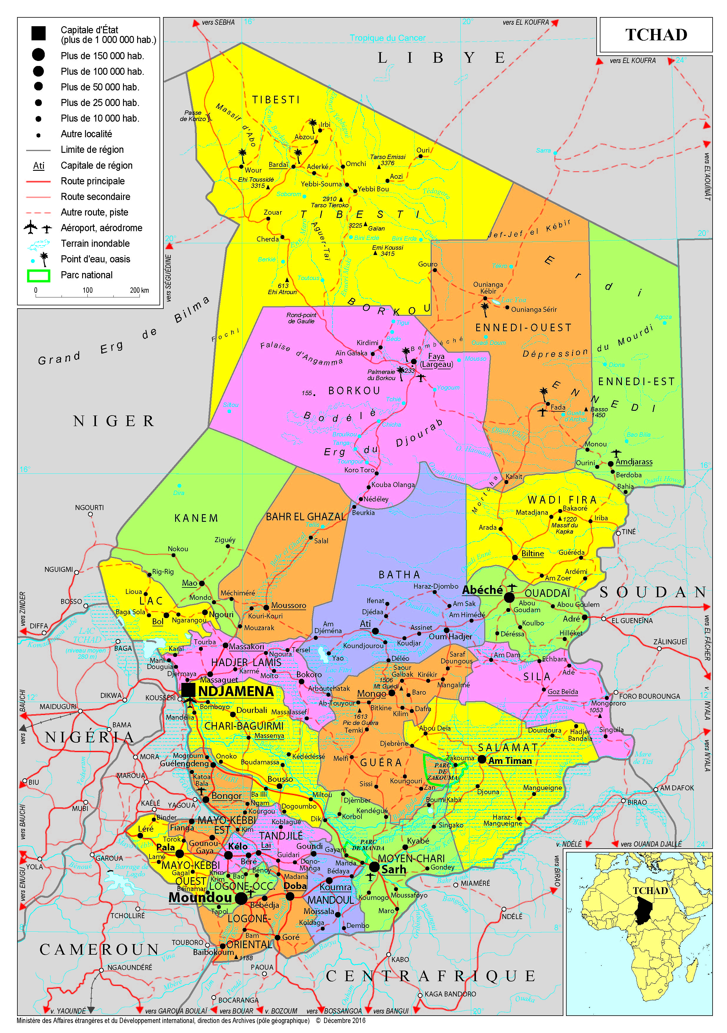 Tchad Navigation latérale fiche pays Dans cette rubrique Tchad Présentation du Tchad Conseils aux voyageurs Dernières minutes et alertes Sécurité Entrée / séjour Santé Informations utiles Voyages d'affaires Contacts utiles Politique et économie Relations bilatérales Présentation du Tchad Date de mise à jour le : 03 avril 2026 Information toujours valable à la date du jour Présentation du pays Données générales Nom officiel : République du TchadNature du régime : RépubliqueChef de l’État : Maréchal Mahamat Idriss Déby Itno, Président, chef de l’État et de gouvernement.Chef du gouvernement : Alla Maye Halina, Premier ministre Données géographiques Superficie : 1 284 000 km²Capitale : N’DjamenaVilles principales : N’Djamena, Abéché, MoundouLangues officielles : français, arabeLangues courantes : français, arabe tchadienMonnaie : franc CFA (100 FCFA = 0,15 EUR)Fête nationale : 11 août (proclamation de l’indépendance) Données démographiques Population : 20.3 millions d’habitants (2024, OMS)Densité : 15,0 habitants/km² (2024)Croissance démographique : 4,9 % (2024)Espérance de vie : 55 ans (2023, Banque mondiale)Taux d’alphabétisation des adultes (15 ans et plus) : 32% pour les femmes et 48% pour les hommes (2019)Religions : Islam (55 %), christianisme et animisme (45 %)Indice de développement humain : 189e sur 193 pays (2022, PNUD) Politique intérieure Le 20 avril 2021, au lendemain de l’annonce de sa réélection, le président en exercice du Tchad, Idriss Déby Itno, est décédé des suites de ses blessures après avoir participé aux combats contre le groupe armé du Front pour l’Alternance et la Concorde au Tchad (FACT), qui avait engagé une offensive depuis la Libye. Un Conseil militaire de Transition (CMT) dirigé par le fils de l’ancien chef de l’État, Mahamat Idriss Déby, a été mis en place le jour même alors qu’une Charte de la transition a provisoirement remplacé la Constitution. Elle prévoyait la mise en œuvre d’une transition pacifique et inclusive, limitée à 18 mois, devant mener à l’organisation d’élections libres et transparentes. Par un communiqué du 14 mai 2021, l’Union africaine a demandé au président et aux membres du CMT de respecter leur engagement de ne pas se présenter aux prochaines élections nationales. Le Dialogue national inclusif et souverain (DNIS), tenu en octobre 2022, a toutefois conclu à une prolongation de deux ans maximum et autorisé le président de transition à se présenter à l’élection présidentielle. A l’issue, un deuxième gouvernement, dit d’unité nationale, a été nommé le 14 octobre sous l’égide du Premier ministre Saleh Kebzabo, figure de l’opposition. La seconde phase de la transition a d’emblée été marquée par des manifestations survenues le 20 octobre (date marquant les 18 mois de la transition) qui ont fait plus de 78 morts et 300 blessés, entraînant un surcroit de tension politique. Le principal opposant à la transition, M. Succès Masra, est parti en exil pour échapper à des poursuites. En octobre 2023, des négociations entre Mahamat Idriss Deby et Succès Masra ont permis son retour, en l’échange de l’abandon des poursuites à son encontre et d’une amnistie pour les acteurs du 20 octobre 2022 (manifestants comme forces de l’ordre). Le 17 décembre 2023, les Tchadiens ont été appelés aux urnes et se sont prononcés en faveur d’une nouvelle constitution consacrant un Etat unitaire fortement décentralisé. Le 1er janvier 2024, Succès Masra a été nommé à la tête d’un nouveau gouvernement. Après une campagne voyant s’affronter le président sortant et son premier ministre Succès Masra, Mahamat Idriss Déby est sorti vainqueur du scrutin présidentiel du 6 mai 2024 avec 61% des voix, à l’occasion d’un scrutin qui a mobilisé les Tchadiens (participation supérieure à 75%) et s’est déroulé dans le calme. La période de transition s’est achevée le 15 février 2025 avec l’entrée en fonction de la nouvelle Assemblée nationale. Le scrutin, qui a abouti à l’écrasante victoire du parti présidentiel, a fait l’objet d’un boycott par une partie de l’opposition. Il a été suivi par la condamnation, le 9 août 2025, à 20 ans d’emprisonnement, de l’ancien premier ministre Succès Masra pour avoir encouragé des affrontements communautaires dans le sud du pays en mai 2025 – ce que l’intéressé conteste. Initiée par le président de l’Assemblée nationale, une révision technique de la Constitution a été entérinée le 3 octobre 2025. Elle autorise, entre autres, l’allongement de la durée du mandat présidentiel, désormais renouvelable sans limite, et la fin de l’incompatibilité de la fonction de chef de l’État avec une fonction dans un parti politique, alors que Mahamat Idriss Déby est devenu président de son parti politique, le Mouvement patriotique du salut (MPS), en janvier 2025. Politique étrangère Le Tchad mène une politique étrangère de diversification et d’ouverture de ses partenariats et cherche à ce titre à développer ses relations bilatérales avec la Russie, la Chine, les pays du Golfe (en particulier les Emirats arabes unis) ou encore la Turquie. Le président de la République du Tchad s’est ainsi rendu, depuis son élection mai 2024, en Chine, en Hongrie, en France, en Italie et aux Emirats arabes unis. Une trentaine d’ambassades sont résidentes à Ndjaména, et l’Union européenne y dispose d’une délégation. Le pays est membre de l’Organisation des Nations-Unies depuis le 20 septembre 1960. L’ONU appuie le gouvernement tchadien dans la mise en œuvre des politiques nationales pour répondre aux défis de paix, sécurité et de développement, ainsi qu’aux besoins humanitaires auxquels le pays est confronté. Quatorze programmes et agences des Nations Unies sont actifs dans le pays (FAO, HCDH, OCHA, OIM, OMS, ONUDC,
