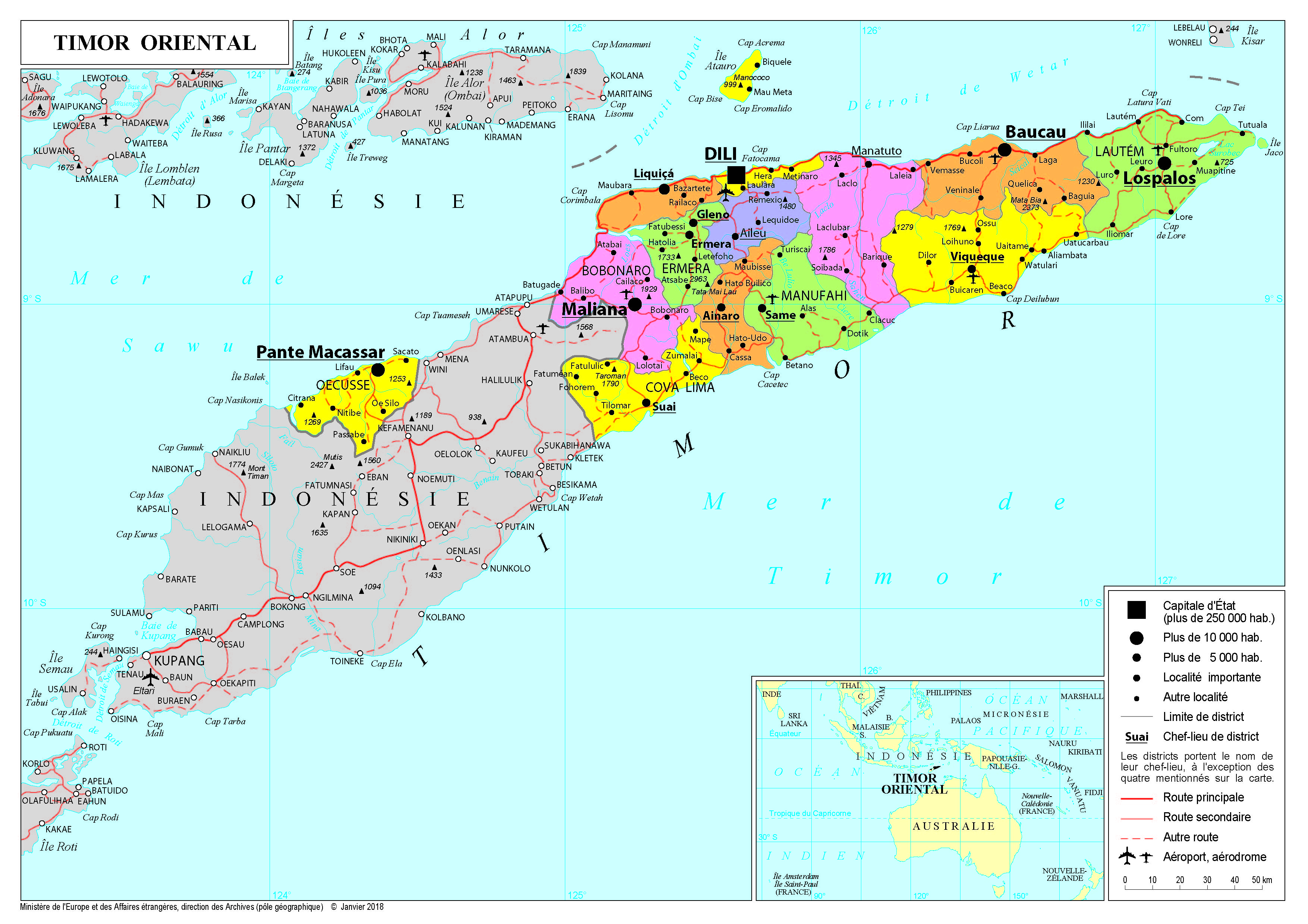 Timor oriental Navigation latérale fiche pays Dans cette rubrique Timor oriental Présentation du Timor oriental Conseils aux voyageurs Dernières minutes et alertes Sécurité Entrée / séjour Santé Informations utiles Voyages d'affaires Contacts utiles Politique et économie Relations bilatérales Présentation du Timor oriental Date de mise à jour le : 03 avril 2026 Information toujours valable à la date du jour Présentation du pays Données générales Nom officiel : République démocratique du Timor orientalNature du régime : Démocratie parlementaireChef de l’Etat : José Manuel Ramos-Horta (depuis le 20 mai 2022)Premier Ministre : Xanana Gusmão (depuis le 1er juillet 2023)Parlement : Parlement national, monocaméral Données géographiques Superficie : 15 410 km²Capitale : DiliVilles principales : BacauLangue officielle : tetum, portugaisLangues courantes : tetum, portugais, indonésienMonnaie : dollar américain et centavos (en-dessous d’1 $)Fête nationale : 20 mai (date de l’indépendance) Données démographiques Population : 1,3 M (2022, Banque mondiale)Densité : 86 h/km²Croissance démographique : 1,5 % (2022, Banque mondiale)Espérance de vie : 68 ans (2021, Banque Mondiale)Taux d’alphabétisation : 70% (2020, Banque Mondiale)Religions : catholique (97 %), islam (1 %), protestantisme (1 %), autres (1 %)Indice de développement humain : 0,607 (2022, PNUD) Politique intérieure Plus jeune État d’Asie (il a accédé à l’indépendance en 2002), le Timor oriental est l’un des pays les plus pauvres de la région et qui reste dépendant, pour sa croissance économique et son développement humain, de l’aide internationale. Les élections présidentielles d’avril 2022 ont porté à la tête du pays le Prix Nobel de la paix et ancien président (2007-2012) José Ramos-Horta. En juin 2023, les élections législatives ont marqué le succès du parti CNRT, qui était déjà dans la majorité lors de la législature précédente (2018-2023), au sein d’une coalition tripartite (CNRT, PLP, Khunto). Xanana Gusmão, chef du CNRT, a alors été nommé Premier ministre pour la troisième fois (il avait occupé ces fonctions de 2007 à 2015, après avoir été lui-même président de 2002 à 2007). Le nouveau gouvernement, organisé autour d’une administration resserrée, a pour objectif d’assurer la reprise économique du pays après une période marquée par de nombreux défis (crise sanitaire, blocage politique autour du budget de l’État fin 2018, démission du Premier ministre en février 2020). Le gouvernement actuel poursuit l’objectif de nourrir le développement économique et social du Timor oriental, avec deux priorités. Le premier défi est celui de la diversification des ressources financières de l’État, alors que 86% du budget est alimenté par le fonds souverain pétrolier. Cette source de revenus est appelée à se tarir : le Fonds Monétaire International (FMI) estime à 2038 l’horizon d’épuisement des ressources hydrocarbures du pays. L’autre priorité est le rééquilibrage du budget de l’État, au bénéfice de secteurs essentiels au développement socio-économique du pays. Seuls 17% du budget de l’État en 2022 ont été alloués aux secteurs de l’éducation, de la santé, de l’approvisionnement en eau et de l’agriculture, pourtant qualifiés de prioritaires par les gouvernements successifs, ce qui parait peu eu égard à la situation économique et sociale difficile que connaît la population timoraise (40% des personnes sous le seuil de pauvreté, 22% de la population en situation grave d’insécurité alimentaire, 60% de l’activité économique dans le secteur informel, 60% de la population ayant moins de 25 ans). Politique étrangère La politique étrangère du Timor oriental s’articule autour de deux priorités : le développement des relations bilatérales avec ses voisins directs, en premier lieu l’Indonésie et l’Australie, et l’adhésion à l’ASEAN. L’Indonésie et le Timor oriental ont mis en place en 2005 une « Commission vérité et amitié conjointe » dont les conclusions, reconnaissant la responsabilité institutionnelle de l’Indonésie dans les crimes contre l’humanité commis en 1999 au Timor oriental, ont apaisé les relations entre les deux pays. L’Indonésie est de loin le premier partenaire commercial du Timor oriental : 70% des biens consommés au Timor oriental sont importés d’Indonésie. La proximité entre les deux pays s’est une nouvelle fois manifestée à l’occasion de la visite du Premier ministre du Timor oriental en Indonésie en février 2023. Avec l’Australie, un accord sur la délimitation frontalière a été signé en avril 2018 permettant de faciliter le développement des relations bilatérales. Un accord économique (Australian Pacific Labour Scheme) permet l’envoi de 50 000 travailleurs saisonniers en Australie (150 000 bénéficiaires sur plusieurs années), dispositions importantes dans un pays où l’envoi de fonds depuis l’étranger constitue la troisième source de revenus. Sur le plan régional, le Timor oriental recherche une position d’équilibre dans l’espace indopacifique : « rester indépendant, sans être mis sur la touche ». La politique du Timor oriental tient en deux piliers : officiellement candidat pour rejoindre l’ASEAN depuis 2011 (« Acting West »), le pays est également tourné vers le Pacifique (« Looking East »). Dès son indépendance, le Timor oriental a accédé au statut de membre observateur du Forum des îles du Pacifique (FIP). Pour autant, le Timor oriental concentre l’essentiel de ses efforts diplomatiques vers l’ASEAN, dont il espère devenir à court terme le onzième membre. Le pays a accédé au statut d’observateur en 2002, a rejoint le Forum régional de l’ASEAN (ARF) en 2005 et a officiellement déposé sa candidature d’adhésion à l’ASEAN en 2011. Après trois visites 