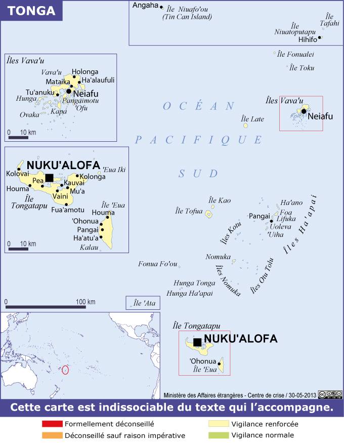 Tonga Navigation latérale fiche pays Dans cette rubrique Tonga Présentation du Royaume des Tonga Conseils aux voyageurs Dernières minutes et alertes Sécurité Entrée / séjour Santé Informations utiles Voyages d'affaires Contacts utiles Politique et économie Relations bilatérales Sécurité Date de mise à jour le : 27 mars 2026 Information toujours valable à la date du jour Imprimer Imprimer Vous voyagez à l'étranger ? Pour recevoir des alertes, inscrivez-vous sur Fil d'Ariane. S'inscrire sur Fil d'Ariane Donnez-nous votre avis Aidez-nous à améliorer notre service en répondant à notre enquête. Répondre à l'enquête utilisateurs Fermer Vérifiez que vous êtes bien assurés Avant de voyager, il est indispensable de vérifier que vous êtes bien assuré Quelle est la portée des Conseils aux Voyageurs ? Avertissement L’ambassade de France à Suva (Fidji) est compétente pour le Royaume des Tonga. Elle dispose de capacités limitées pour venir en aide aux Français en cas de crise. Les Français qui se rendent dans le pays sont responsables de leur propre sécurité. Ils sont invités à s’assurer qu’ils disposent des moyens de secours nécessaires (vérifier les termes des contrats d’assurance, veiller à disposer de moyens financiers suffisants pour couvrir d’éventuels frais d’hospitalisation ou d’évacuation, etc.). Il convient également de se montrer vigilant avec ses documents d’identité, de laisser les originaux en lieu sûr (ex : coffres des hôtels) et de se munir de photocopies lors de ses déplacements. L’ambassade de France à Suva (Fidji) peut être jointe au +679 331 05 26 aux heures ouvrables et au +679 992 17 52 (téléphone d’urgence) en dehors des horaires d’ouverture. Le consulat général de France à Sydney est compétent pour les démarches administratives et peut être joint au +61 2 9268 2400 du lundi au jeudi, de 09h00 à 17h00, et le vendredi de 09h00 à 12h30 (heure locale). En cas d’incident grave dans le pays pendant votre séjour, pensez à rassurer vos proches. Zones de vigilance Dernière actualisation le 13/03/2026, information toujours valable à la date du jour L’ensemble de l’archipel des Tonga est en zone de vigilance renforcée. La situation sécuritaire est globalement bonne dans le pays. Des actes criminels et des agressions sexuelles sur les étrangers ont toutefois été rapportés. Il convient d’observer la prudence d’usage et de suivre les recommandations générales (voir ci-après). Risques encourus et recommandations associées Risques naturels Activité cyclonique En février 2018, le cyclone tropical Gita de catégorie 4 a balayé les Tonga, causant de nombreux dommages et perturbant le fonctionnement des services essentiels. Il est recommandé d’être particulièrement vigilant durant la saison des cyclones, qui s’étend de début novembre à la fin du mois d’avril. Les tempêtes tropicales sur les îles des Tonga font chaque année des victimes et les dégâts causés peuvent provoquer des coupures de courant, d’approvisionnement en eau et la fermeture des aéroports internationaux pendant plusieurs jours. Il convient de prévenir ce type de difficultés en souscrivant à une assurance de voyage adaptée ou en préférant une autre période de l’année pour se rendre aux Tonga. Durant la saison cyclonique, il est conseillé de se tenir informé des conditions météorologiques via les médias (radio, télévision, internet, presse écrite), les autorités locales et les personnels des hôtels. Toutes les informations utiles, bulletins météorologiques, préalertes et alertes, sont consultables sur le site officiel des services météorologiques fidjiens, compétents pour le Royaume des Tonga. Il est également possible de consulter la page Facebook du National Emergency Management Office des Tonga. En cas de cyclone, il est recommandé de respecter les consignes des autorités locales et de s’informer sur les structures d’accueil à disposition de la population en cas de crise. Les hôtels et « resorts » disposent de plans de sécurité et de consignes précises à suivre en cas d’épisode cyclonique. Pour les voyageurs itinérants, il convient d’emporter de l’eau, de la nourriture, une lampe de poche et de garder sur soi documents de voyage et d’identité dans une pochette étanche. Des instructions précises sont diffusées à l’attention des navires présents dans la zone d’activité cyclonique et, sur terre, aux autorités compétentes et aux populations. Il convient, dès diffusion d’une préalerte cyclonique, de rejoindre le lieu de séjour (hôtel, « resorts ») et de suspendre tout déplacement jusqu’à la fin de l’alerte. Pour plus d’informations, consulter la rubrique Risques climatiques (cyclones / ouragans) des informations pratiques. Autres risques naturels L’île se trouve dans une zone d’activité sismique (ceinture de feu du Pacifique) et peut être sujette à des tsunamis après des séismes importants. Le Royaume ne disposant pas d’un système d’alerte et de prévention efficace, il convient d’observer la plus grande vigilance et de se référer à la fiche Séismes. Pour mémoire, à la suite de l’éruption du 15 janvier 2022, un séisme de magnitude 5,8 et un tsunami de 1,2 m ont frappé la capitale de Tonga, Nukuʻalofa. Risques liés au transport maritime Les exemples de naufrages mortels qui ont eu lieu par le passé incitent à mettre en garde les voyageurs qui privilégient la voie maritime. Il est déconseillé de partir en haute mer, les bateaux étant souvent mal entretenus et insuffisamment dotés d’équipements de secours. Recommandations générales De manière générale, il est recommandé de : ne pas montrer de signes ostentatoires de richesse, ne pas transporter des sommes d’argent importantes et laisser tout objet de valeur dans des lieux sécurisés (ex : coffres des hôtels). se munir de photocopi
