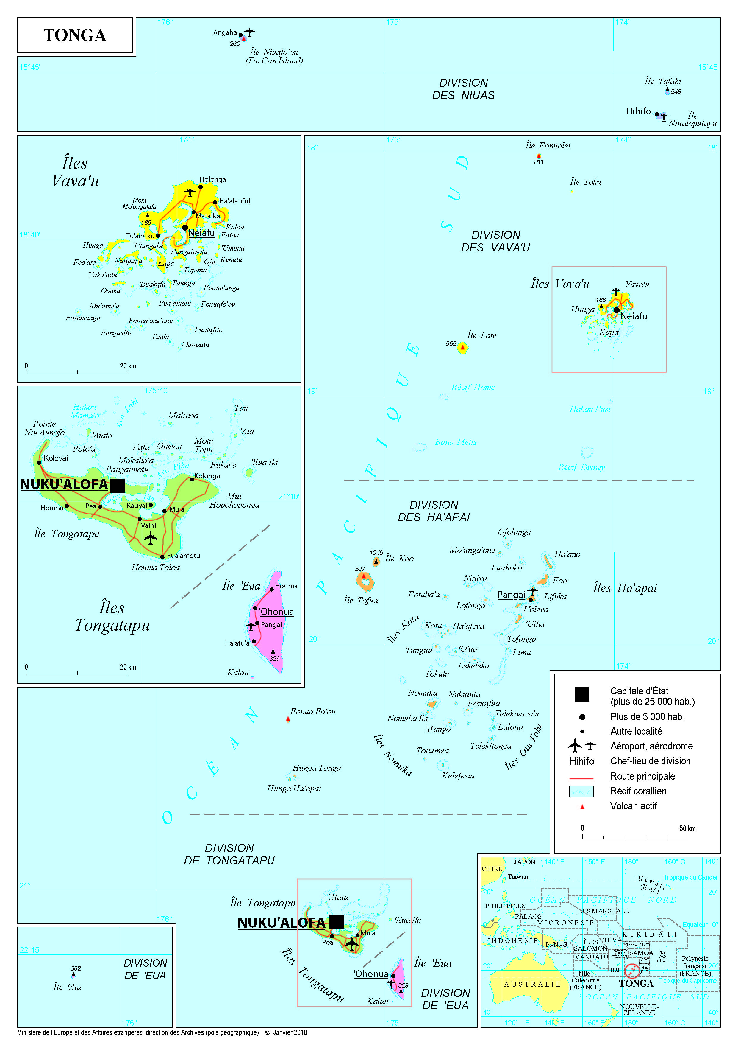 Tonga Navigation latérale fiche pays Dans cette rubrique Tonga Présentation du Royaume des Tonga Conseils aux voyageurs Dernières minutes et alertes Sécurité Entrée / séjour Santé Informations utiles Voyages d'affaires Contacts utiles Politique et économie Relations bilatérales Présentation du Royaume des Tonga Date de mise à jour le : 03 avril 2026 Information toujours valable à la date du jour Présentation du pays Données générales Nom officiel : Royaume des Tonga Nature du régime : Monarchie constitutionnelle Chef de l’Etat : S.M. le roi Tupou VI Chef du gouvernement : Lord FAKAFANUA (depuis décembre 2025), Premier ministre Données géographiques Superficie : 749 km². ZEE: 659 558 km² (41e rang mondial) Capitale : Nuku’Alofa. Langues officielles : tongien, anglais Fête nationale : 4 novembre (Constitution Day) Données démographiques Population : 104 175 habitants (2024, Banque mondiale) Densité : 139 hab/ km² (2024, Banque mondiale) Croissance démographique : -0,4 % (2024, Banque mondiale) Espérance de vie : 73 ans (2023, Banque mondiale) Religions : Chrétiens (96,9%) dont 64,1% de protestants, 18,6% de mormons (taux le plus élevé au monde) et 14,2% de catholiques. IDH : 0,769 en 2025, 92e rang mondial. Politique intérieure Les Tonga sont une monarchie constitutionnelle où le roi détient le pouvoir exécutif. Le roi TUPOU VI a succédé en 2012 à son frère, qui avait réformé le Parlement pour permettre l’élection d’une partie de ses députés au suffrage universel en 2010 (9 sur 26 sièges restent attribués à des nobles). A la suite des élections législatives du 20 novembre 2025, le Parlement a élu Lord Fakafanua au poste de Premier ministre. Il s’agit du premier noble à occuper ce poste depuis 2014. Les Tonga sont vulnérables aux catastrophes climatiques : le cyclone tropical Gita de février 2018 a eu un impact dévastateur sur le pays, les dégâts étant estimés par le FMI et la Banque asiatique de développement de 30 à 38% du PIB. Le 15 janvier 2022, l’éruption du volcan Hunga-Tonga-Hunga-Ha’apai a provoqué un tsunami majeur ayant fait de nombreuses victimes et causé de nombreux dommages matériels. L’afflux d'aide internationale a eu un effet compensateur mais le pays reste marqué par ces deux catastrophes naturelles. Les Tonga sont également confrontées au trafic de drogue transnational, qui représente un défi sécuritaire majeur pour le pays. Des saisies records de cocaïne et de méthamphétamine ont été réalisées dans l’archipel en 2024. Politique étrangère Le Royaume des Tonga entretient des relations privilégiées avec l’Australie et la Nouvelle-Zélande et est également proche de la République populaire de Chine, avec laquelle il a noué des relations diplomatiques en 1998 après avoir rompu ses relations avec Taiwan. L’Australie, la Nouvelle-Zélande, l’Union européenne, le Japon et les Etats-Unis sont ses principaux bailleurs. En outre, selon la Banque mondiale, le Royaume est endetté à hauteur de 112 MUSD auprès de la Chine (48 % de sa dette extérieure). Le remboursement, initialement prévu pour 2017 puis reporté à plusieurs reprises, a atteint son pic en 2025. Les Etats-Unis (où résident un grand nombre de Tongiens) font partie des plus proches partenaires des Tonga, où ils déploient des volontaires des « Peace Corps » depuis 1967. Ils ont apporté 2,6 M USD d’aide humanitaire après le séisme de 2022 et ont ouvert une ambassade à Nuku’Alofa en 2023. Le secrétaire d'État adjoint américain C. Landau s’est rendu aux Tonga en mars 2026, où il a conclu un accord de sécurité maritime contre la criminalité transnationale, ainsi qu’un partenariat stratégique sur l'exploration minière des fonds marins. Le Japon entretient des relations cordiales avec les Tonga depuis 1970, notamment par le biais de la famille impériale du Japon qui a développé une relation personnelle avec la famille royale des Tonga au fil des années. Cette relation s’est renforcée avec la fourniture aux Tonga d’équipements de défense et de sécurité maritime en 2025. Sur le plan multilatéral, le royaume des Tonga est membre de l’Organisation des Nations unies depuis 1999, du Fonds monétaire international (FMI), de la Banque mondiale et de la Banque asiatique de Développement (BAD). En 2007, les Tonga sont devenues membre de l’Organisation mondiale du Commerce (OMC) et en 2011 de l’agence internationale de l’énergie atomique (AEIA). Une Tongienne, Mme Fekitamoeloa Katoa ‘UTOIKAMANU, a été nommée en 2017 Haute-Représentante du SGNU pour les pays les moins avancés, les pays en développement sans littoral et les petits États insulaires en développement. Les Tonga, comme tous les autres Etats insulaires du Pacifique, sont membres du groupe AOSIS (Alliance of Small Island States). Le Royaume siège également dans les organisations régionales du Pacifique comme le Forum des Iles du Pacifique (FIP), dont il a accueilli le sommet annuel en 2024. Situation économique PIB : 591 M USD (2023, Banque mondiale) PIB/hab : 5 651 USD (2023, Banque mondiale) Taux de chômage : 2 (2025, Banque mondiale) Solde commercial : -285M USD (2024, ONU) Classement Doing Business : 103e rang (2020) Composition du PIB/secteur : Services (50,2%), Agriculture (17,5%), Industrie (13,5%) Croissance du PIB : 2,1% (2023, Banque mondiale) Partenaires économiques principaux : Fidji, Nouvelle-Zélande, Australie, Etats-Unis Les Tonga possèdent un niveau de développement proche de celui des Fidji mais un PIB très inférieur du fait de sa faible population. Le pays a connu une croissance modérée avant la pandémie de Covid-19, suite à laquelle l’économie s’est contractée, notamment à cause de la fermeture des frontières et de l’absence de tourisme sur la période. Son économie reste très dépendante de l’extérieur et repose principalement sur le tourisme, les transferts