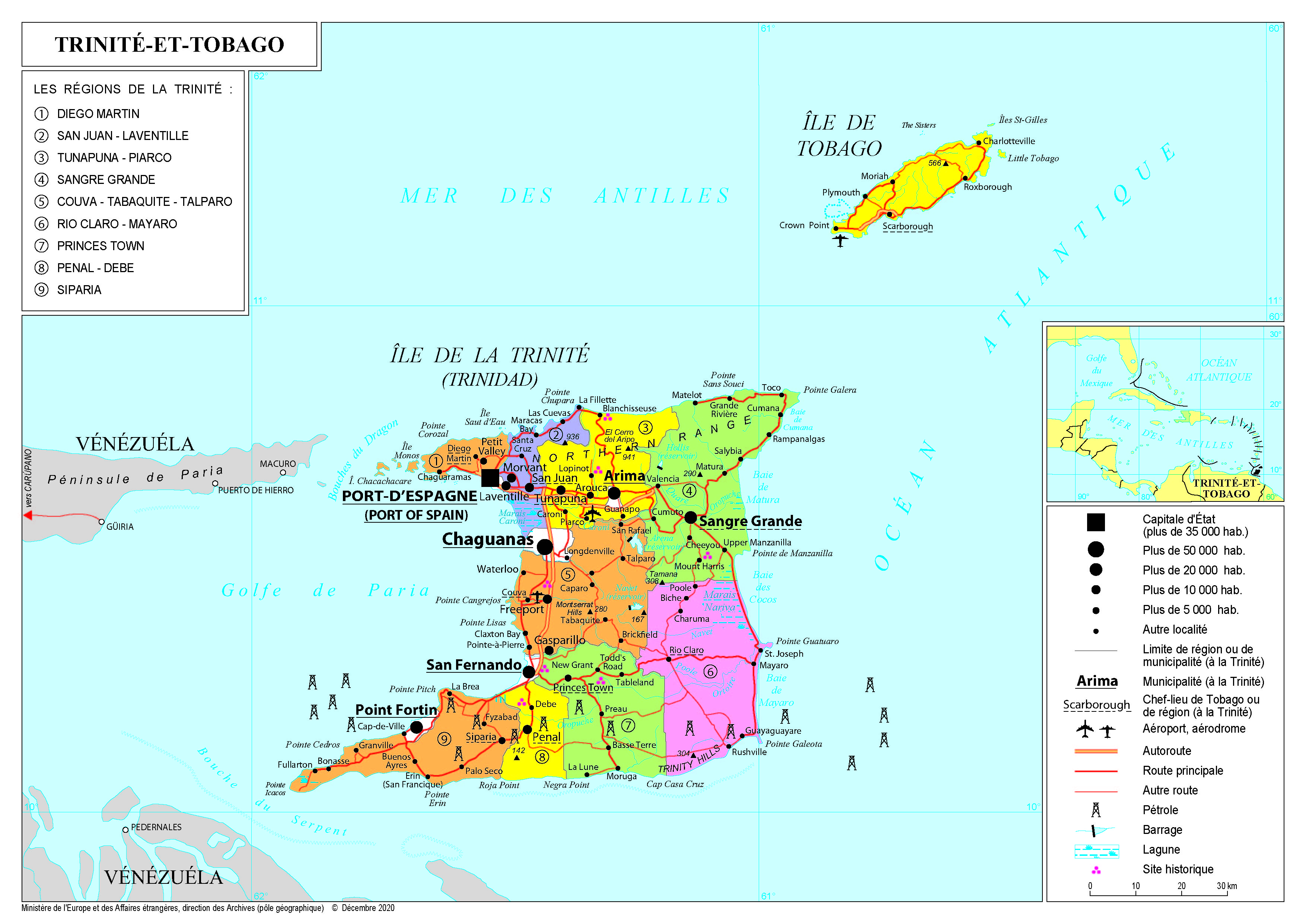 Trinité-et-Tobago Navigation latérale fiche pays Dans cette rubrique Trinité-et-Tobago Présentation de Trinité-et-Tobago Conseils aux voyageurs Dernières minutes et alertes Sécurité Entrée / séjour Santé Informations utiles Voyages d'affaires Contacts utiles Politique et économie Relations bilatérales Présentation de Trinité-et-Tobago Date de mise à jour le : 03 avril 2026 Information toujours valable à la date du jour Présentation du pays Données générales Nom officiel : République de Trinité-et-TobagoNature du régime : régime parlementaire inspiré du Royaume-UniChef de l’État : Mme Paula-Mae WEEKES (depuis le 19 mars 2018)Chef du Gouvernement : M. Keith ROWLEY (depuis le 9 septembre 2015). Données géographiques Superficie : 5 130 km² (Banque mondiale 2017)Capitale : Port-d’Espagne (43 396 habitants)Villes principales : Port d’Espagne, San Fernando et ChaguanasLangue (s) officielle (s) : anglaisLangue (s) courante (s) : anglais trinidadien, hindoustani, espagnol, « patois » (créole français)Monnaie : dollar trinidadien (TTD). 1 TTD = 0,122 EUR en août 2021Fête nationale : 31 août (1962, date de l’indépendance) Données démographiques Population (Banque mondiale 2017) : 1,36 million d’habitantsDensité (Banque mondiale 2017) : 266 habitants par km²Croissance démographique (Banque mondiale 2017) : 0,30 %Espérance de vie (Banque mondiale 2017) : 73 ansTaux d’alphabétisation (CEPAL 2013) : 98,7 %Religion (s) : 50 % de chrétiens (dont 26 % de catholiques ; parmi les protestants, 7,8 % d’anglicans, 6,8 % de pentecôtistes, 4 % d’adventistes du 7e jour, 3,3 % de presbytériens, 1,8 % de baptistes et 0,9 % de méthodistes) ; hindouistes (22,5 %) ; musulmans (7,5 %).Indice de développement humain (2018) : 0,784 soit le 69e rang mondial sur 188 Politique intérieure Institutions : Le président de la République (dont les pouvoirs sont essentiellement protocolaires) est élu par le Parlement. Celui-ci est bicaméral avec une Chambre des représentants (41 membres élus au suffrage universel tous les cinq ans au scrutin majoritaire à un tour) et un Sénat (31 membres nommés par le président de la République, dont 16 sur proposition du Premier ministre et 6 du chef de l’opposition).Le pouvoir exécutif est exercé par le Premier ministre, chef de la majorité parlementaire. Les deux partis qui dominent la scène politique sont : L’United National Congress Alliance (UNC), qui s’appuie largement sur la population originaire du sous-continent indien (40 % de la population), dirigée par Mme Kamla PERSAD-BISSESSAR. Ce parti détient 17/41 sièges à la Chambre des représentants et 6/31 au Sénat (soit 31,9 % des sièges). Le People’s National Movement (PNM), au pouvoir de 2002 jusqu’aux élections anticipées du 24 mai 2010, dont l’électorat est principalement afro-trinidadien (37 % de la population) et créole. Il rassemble 23/41 sièges à la chambre et 15 sièges au Sénat (soit 52,7 % des sièges). L’UNC avait remporté les élections en 1995, puis en 2000, contre le PNM. Lors d’élections anticipées le 10 décembre 2001, l’UNC et le PNM obtinrent un nombre égal de sièges provoquant une crise politique et institutionnelle. Celle-ci trouva son épilogue avec l’organisation de nouvelles élections le 7 octobre 2002, qui virent la victoire du PNM de M. Patrick MANNING, rééditée lors des élections du 5 novembre 2007. Lors des élections anticipées de mai 2010, c’est une coalition (le People’s Partnership), constituée notamment de l’UNC, du Congress of the People (COP) créé en 2006 par un ancien dirigeant de l’UNC, M. Winston DOOKERAN, opposé à la politique traditionnellement menée par les partis sur une base ethnique, ainsi que du parti régional de l’île de Tobago, la Tobago Organisation of the People (TOP), qui l’emporte. Mme Kamla PERSAD-BISSESSAR, dirigeante de l’UNC, devient Premier ministre. Elle a convoqué les élections municipales le 26 juillet 2010, à l’issue desquelles le PP et l’UNC ont conquis 11 des 14 municipalités du pays, alors que l’UNC n’en contrôlait que cinq auparavant. Le PNM conserve toutefois la mairie de Port-d’Espagne, la capitale. Aux élections législatives du 7 septembre 2015, le PNM remporte 23 sièges contre 18 pour la coalition de Mme Kamla Persad Bissesar. M. Keith Rowley, chef de l’opposition, est nommé Premier ministre le 9 septembre 2015. Mme Paula-Mae WEEKES, magistrate, a été élue le 19 mars 2018, sans opposant, par le Parlement comme la 6e présidente de la République et la 1re femme à ces fonctions pour cinq ans, succédant à M. Anthony CARMONA (2013-2018). Le PNM a remporté les élections d’août 2020 avec une très courte majorité (22 sièges, contre 19 pour l’UNC) entrainant la reconduction du Premier ministre Keith Rowley et du gouvernement sortant. Politique étrangère Trinité-et-Tobago est membre de l’Organisation des Nations unies (ONU), de l’Organisation des États américains (OEA), de l’Organisation mondiale du commerce (OMC), de l’Association des États de la Caraïbe (AEC, dont le siège est à Port-d’Espagne), de la Communauté économique de la Caraïbe (CARICOM), ainsi que du Commonwealth. Son statut de pays à revenu élevé lui a permis de renforcer son rôle à l’échelle régionale, notamment au sein de la CARICOM, dont il assure plus des deux tiers des échanges extérieurs. Trinité-et-Tobago entretient un réseau d’une vingtaine d’ambassades et consulats généraux à travers le monde (trois implantations en Europe : Londres, Bruxelles et Genève ONU). L’appartenance à la CARICOM, à l’Organisation des États américains (OEA) et au Commonwealth reste une donnée essentielle de la politique extérieure du pays. Il avait ainsi accueilli successivement, en 2009, un sommet des Amériques (en avril), puis un sommet du Commonwealth (en novembre). Le pays contribue à la coopérati