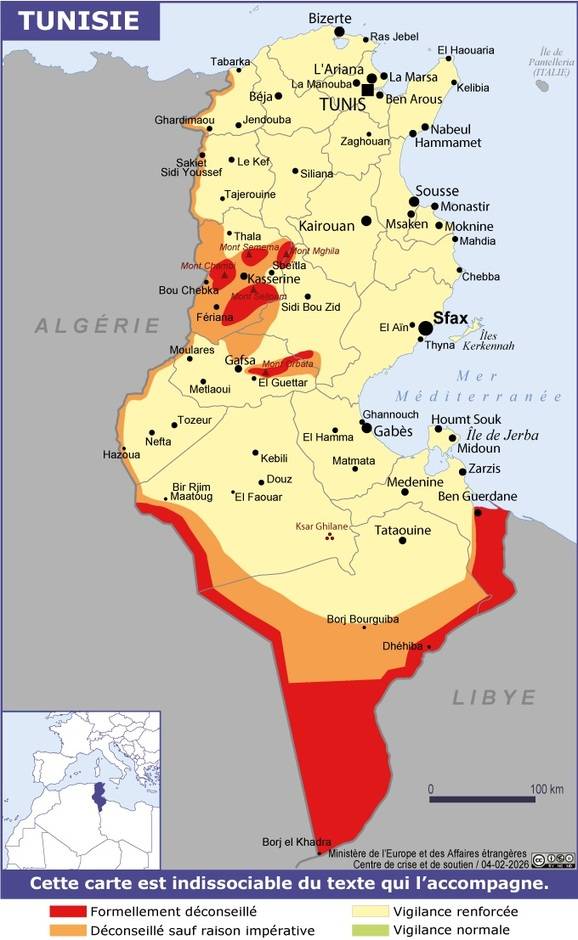 Tunisie Navigation latérale fiche pays Dans cette rubrique Tunisie Présentation de la Tunisie Conseils aux voyageurs Dernières minutes et alertes Sécurité Entrée / séjour Santé Informations utiles Voyages d'affaires Contacts utiles Politique et économie Relations bilatérales Sécurité Date de mise à jour le : 07 avril 2026 Information toujours valable à la date du jour Imprimer Imprimer Vous voyagez à l'étranger ? Pour recevoir des alertes, inscrivez-vous sur Fil d'Ariane. S'inscrire sur Fil d'Ariane Donnez-nous votre avis Aidez-nous à améliorer notre service en répondant à notre enquête. Répondre à l'enquête utilisateurs Fermer Vérifiez que vous êtes bien assurés Avant de voyager, il est indispensable de vérifier que vous êtes bien assuré Quelle est la portée des Conseils aux Voyageurs ? L’état d’urgence est en vigueur depuis le 24 novembre 2015. Il est régulièrement prorogé et toujours d’actualité sur l’ensemble du territoire tunisien. Zones de vigilance Dernière actualisation le 13/03/2026, information toujours valable à la date du jour Zones formellement déconseillées (en rouge sur la carte) Extrême Sud du pays La région saharienne proche des frontières avec la Libye et avec l’Algérie est formellement déconseillée. Elle correspond à une zone militaire instaurée au mois d’août 2013 par les autorités tunisiennes, les déplacements y sont, en tout état de cause, soumis à une autorisation préalable. Centre-ouest du pays, massifs montagneux près de la frontière tuniso-algérienne Il est formellement déconseillé de se rendre dans la zone montagneuse de l’Ouest (monts d’Orbata, Selloum, Semema, Chambi et Mghila), car pouvant abriter différentes activités terroristes, et proches de zones militarisées ou minées. Des opérations liées à la lutte anti-terroriste y sont menées régulièrement. Zones déconseillées sauf raison impérative (en orange sur la carte) Sud du pays Les déplacements sont déconseillés, sauf raison impérative, dans la zone désertique au sud et à l’Est de la ligne Bir Rijm Maatoug - Borj Bourguiba -Ben Guerdane (cette dernière ville étant comprise dans la zone formellement déconseillée). Massifs montagneux du centre-ouest du pays Les zones entre les monts Chambi, Semema et Mghila, la partie au sud du Mont Selloum, ainsi que les alentours du Mont Orbata sont déconseillés sauf raison impérative car ayant pu abriter différentes activités terroristes, et proches de zones militarisées ou minées. Il convient de se renseigner auprès des autorités locales en cas de déplacement dans les zones rurales comprises entre Kasserine, Sbeitla, Sidi Bouzid et Gafsa, hors des principaux axes routiers (Gafsa-Kasserine et Gafsa-Sidi Bouzid). Ceux-ci peuvent être empruntés à condition de ne pas s’en écarter. Nord-ouest Dans les gouvernorats de Jendouba et du Kef, il est recommandé sauf raison impérative de ne pas s’approcher, y compris en randonnée, à moins de cinq kilomètres de la frontière algérienne en dehors des axes routiers menant aux postes-frontières officiels, qui peuvent être empruntés en véhicule (pour mémoire, l’Algérie demande un visa pour l’entrée des Français sur son territoire). Zones de vigilance renforcée (en jaune sur la carte) Dans le gouvernorat du Kef, il est recommandé d’effectuer la visite du site de la Table de Jugurtha dans le cadre de circuits organisés par des guides de voyage en lien avec les autorités locales. Le reste du territoire est en vigilance renforcée. Risques encourus Risque lié aux mouvements sociaux et manifestations Les mouvements sociaux et manifestations, souvent spontanés, peuvent provoquer des difficultés de circulation automobile. Il est recommandé de se tenir à distance de ces rassemblements. En fonction des événements, des mesures de sécurité renforcées, y compris des interdictions de circuler ou des couvre-feux sont parfois mis en place, interdisant l’accès à certaines zones (dans le centre-ville de Tunis et autour du palais présidentiel à Carthage notamment). Il est important de se conformer strictement aux injonctions des forces de l’ordre sur l’ensemble du territoire. Terrorisme Plusieurs attentats terroristes et actes de violences ont eu lieu au cours des dernières années (en mars 2015 au Bardo et à Sousse, à Tunis en 2019 et mars 2020, à Sousse en septembre 2020 et enfin à Djerba en mai 2023). Les forces de sécurité tunisiennes constituent la principale cible des dernières attaques. Il est donc recommandé de se tenir, autant que possible, à distance des lieux devant lesquels ces forces sont stationnées. Les massifs montagneux du centre-ouest (monts Chambi, Selloum, Mghila, Orbata et Semema) peuvent abriter différentes activités terroristes. Il est fortement déconseillé de se rendre dans ces zones. Des organisations terroristes profèrent régulièrement des menaces à l’encontre des intérêts ou ressortissants occidentaux. Les Français résidant ou désirant se rendre en Tunisie sont appelés à faire preuve de vigilance renforcée et à se conformer aux consignes de sécurité figurant sur ce site. Criminalité La délinquance de voie publique est relativement maîtrisée en Tunisie. De manière générale, il est recommandé, notamment dans les lieux touristiques, de veiller à ses sacs et effets personnels, en évitant d’afficher ostensiblement des objets de valeur. Enfin, il est rappelé que des peines sévères de prison sont encourues en Tunisie pour l’importation, la détention ou la consommation de drogue (même en petite quantité). Introduction de devises étrangères Il est obligatoire de déclarer ses devises en numéraire à l’entrée en Tunisie. Le voyageur non-résident ne pourra réexporter un montant en devises supérieur à la contre-valeur de 5 000 dinars tunisiens (environ 1 500 €). Toute sortie de devises en numéraire qui serait supérieur