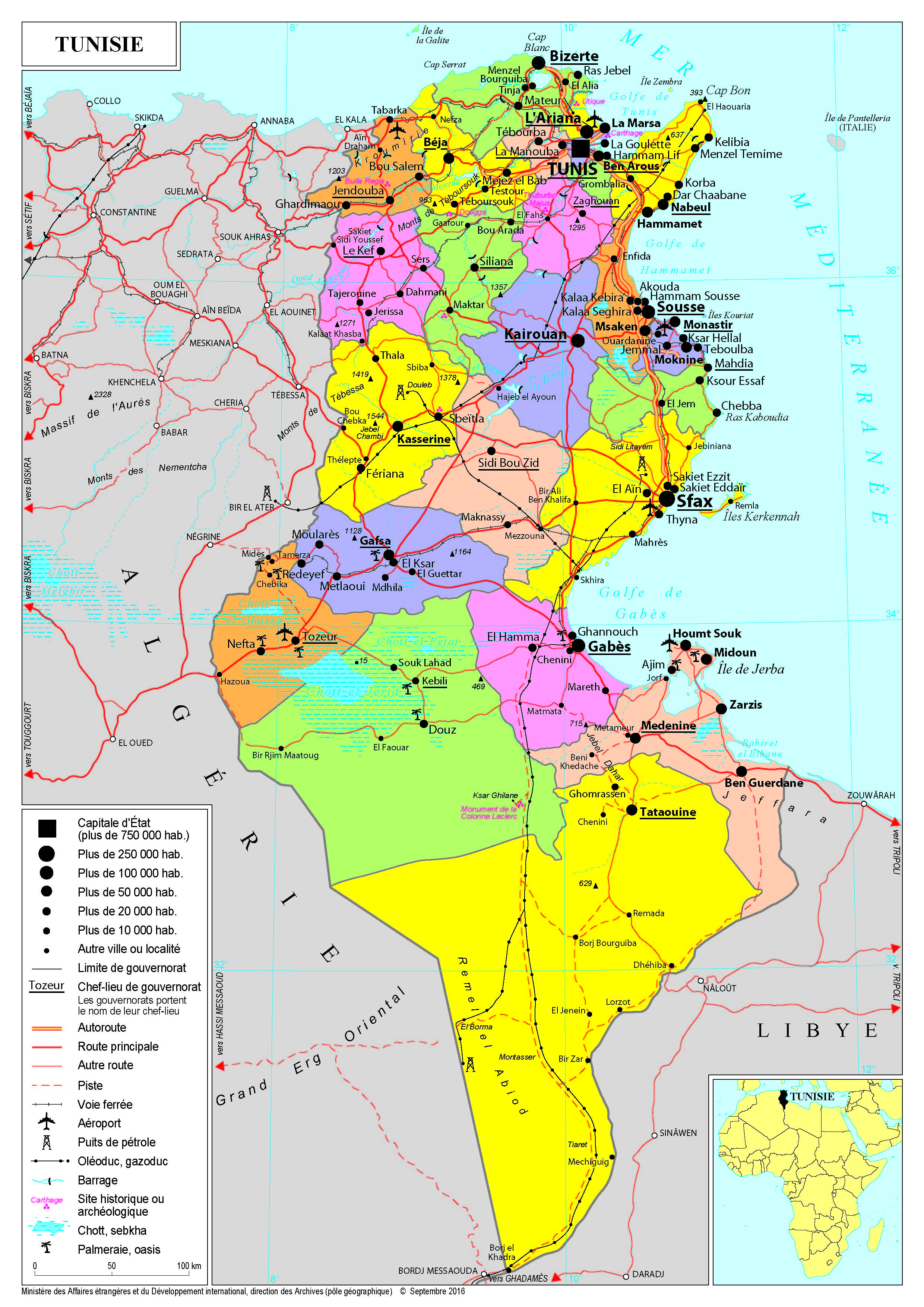 Tunisie Navigation latérale fiche pays Dans cette rubrique Tunisie Présentation de la Tunisie Conseils aux voyageurs Dernières minutes et alertes Sécurité Entrée / séjour Santé Informations utiles Voyages d'affaires Contacts utiles Politique et économie Relations bilatérales Présentation de la Tunisie Date de mise à jour le : 03 avril 2026 Information toujours valable à la date du jour Présentation de la Tunisie Données générales Nom officiel : République tunisienneChef de l’Etat : M. Kaïs Saïed (depuis le 23 octobre 2019).Chef de gouvernement : M. Kamel Maddouri (depuis le 7 août 2024)Président de l’Assemblée des représentants du peuple : M. Brahim Bouderbala (depuis le 13 mars 2023) Données géographiques Superficie : 162.155 km²Villes principales : Tunis, Sfax, Sousse, Gabès, Kairouan, BizerteLangue (s) officielle (s) : arabeLangue (s) courante (s) : arabe dialectal, langues berbères, françaisMonnaie : Dinar tunisien (1 EUR = 3,38 DT le 5 juin 2024).Fête nationale : 20 mars (commémoration de l’indépendance en 1956) Données démographiques Population : 11. 819 millions (ONU, 2020)Densité : 76 hab/km² (Banque Mondiale, 2020)Taux d’accroissement naturel : 1.1 % en 2020 (source : ONU)Indice de fécondité : 2.1 en 2019 (source : ins.tn)Espérance de vie : 77 (2020 source : Banque mondiale)Taux d’alphabétisation : 80,9% en 2019 (source : ministère des Affaires sociales)Religion : Islam (98% de la population dont 85 % de rite malékite, minorité ibadite à Djerba), (2013, source : CIA World Factbook)IDH : 0,741 (95ème) (source : 2020, PNUD) Politique intérieure La révolution tunisienne a poussé Zine el-Abidine Ben Ali au départ, le 14 janvier 2011. Une nouvelle constitution tunisienne a été adoptée en janvier 2014 et des élections démocratiques ont hissé Béji Caïd Essebsi au pouvoir. Après le décès de ce dernier, les élections présidentielles de 2019 ont permis l’élection de Kaïs Saïed à la tête du pays. Universitaire indépendant, Kaïs Saïed a remporté le second tour de l’élection présidentielle avec 72,71% des voix. Les élections législatives ont eu lieu le 6 octobre 2019. Scrutin proportionnel de liste à un tour, ces élections ont vu la victoire d’Ennahda, parti islamiste historique, devenu la première force politique à l’Assemblée des représentants du peuple (52 sièges sur 217). Six partis (Qalb Tounès, Courant démocratique, Coalition Al-Karama, Parti destourien libre, Mouvement du peuple, Tahya Tounès) ont chacun obtenu entre 14 et 38 sièges. Après l’échec du candidat proposé par Ennahda à obtenir la confiance d’une majorité de députés, Elyes Fakhfakh est devenu chef de gouvernement en février 2020. Il a démissionné en juin 2020 après avoir été accusé de conflit d’intérêt. Hichem Mechichi a pris sa succession. Il a été limogé le 25 juillet 2020 après plusieurs mois de conflit avec le président de la République. Le 25 juillet 2021, le président Saïed a invoqué l’article 80 de la Constitution pour proclamer l’état d’exception, ce qui lui confère des pouvoirs élargis. Le président Saïed a, dans le même temps, suspendu l’Assemblée des représentants du peuple puis a pris l’initiative d’un processus de transition institutionnelle. Une nouvelle constitution a ainsi été approuvée par référendum (94% de oui, 30% de participation) le 25 juillet 2022. Les élections législatives qui ont suivi en début d’année 2023 ont mobilisé 10% des Tunisiens. Kaïs Saïed a été réélu à la présidence de la République le 6 octobre 2024 avec 90,7 % des suffrages (taux de participation de 28,8 %). L’organisation de l’élection a été marquée par l’invalidation des dossiers de nombreux candidats, ainsi que par l’emprisonnement de l’un d’entre eux, dont le dossier avait été accepté. Politique étrangère La Tunisie cultive traditionnellement une position de neutralité et de bon voisinage sur la scène régionale et mondiale. Depuis sa révolution, la Tunisie jouit d’un statut particulier qui lui donne une visibilité internationale accrue, mais mène traditionnellement une politique extérieure marquée par la discrétion, la recherche de la neutralité et du consensus, la préservation de bonnes relations avec tous et en particulier ses voisins maghrébins, le renforcement de son ancrage euro-méditerranéen. La politique étrangère tunisienne s’incarne dans ses positions de principe très fortes en soutien de la cause palestinienne ou le rétablissement des relations diplomatiques avec Damas. Le ministre des Affaires étrangères tunisien Nabil Ammar a multiplié les contacts diplomatiques en soutien à Gaza, en particulier depuis le 7 octobre 2023. La Tunisie s’implique fortement sur le volet humanitaire. Des dizaines de tonnes d’aide humanitaire ont été envoyées en Égypte. Des blessés gazaouis ont été admis et soignés dans leurs hôpitaux. Des collectes de don de sang et de contributions financières sont organisées. L’Algérie est le principal partenaire de la Tunisie au Maghreb. Outre leur convergence de vues sur la question libyenne, les deux voisins partagent des objectifs communs, en particulier en matière de lutte contre le terrorisme. La crise libyenne constitue toujours une source de préoccupation des autorités tunisiennes, à l’image des autorités algériennes. La diplomatie tunisienne conforte ses relations du pays avec les Etats arabes du Golfe dont l’aide financière a traditionnellement contribué au développement du pays. La Tunisie a récemment rétabli ses relations diplomatiques avec la Syrie et le président tunisien s’est entretenu avec Bachar Al-Assad en marge du Sommet de Djeddah en mai 2023. Les relations avec l’Egypte connaissent un dynamisme renouvelé (visite d’Etat du président Saïed en Egypte en 2021, multiples contacts entre MAE tunisien et égyptien).La Tunisie déve